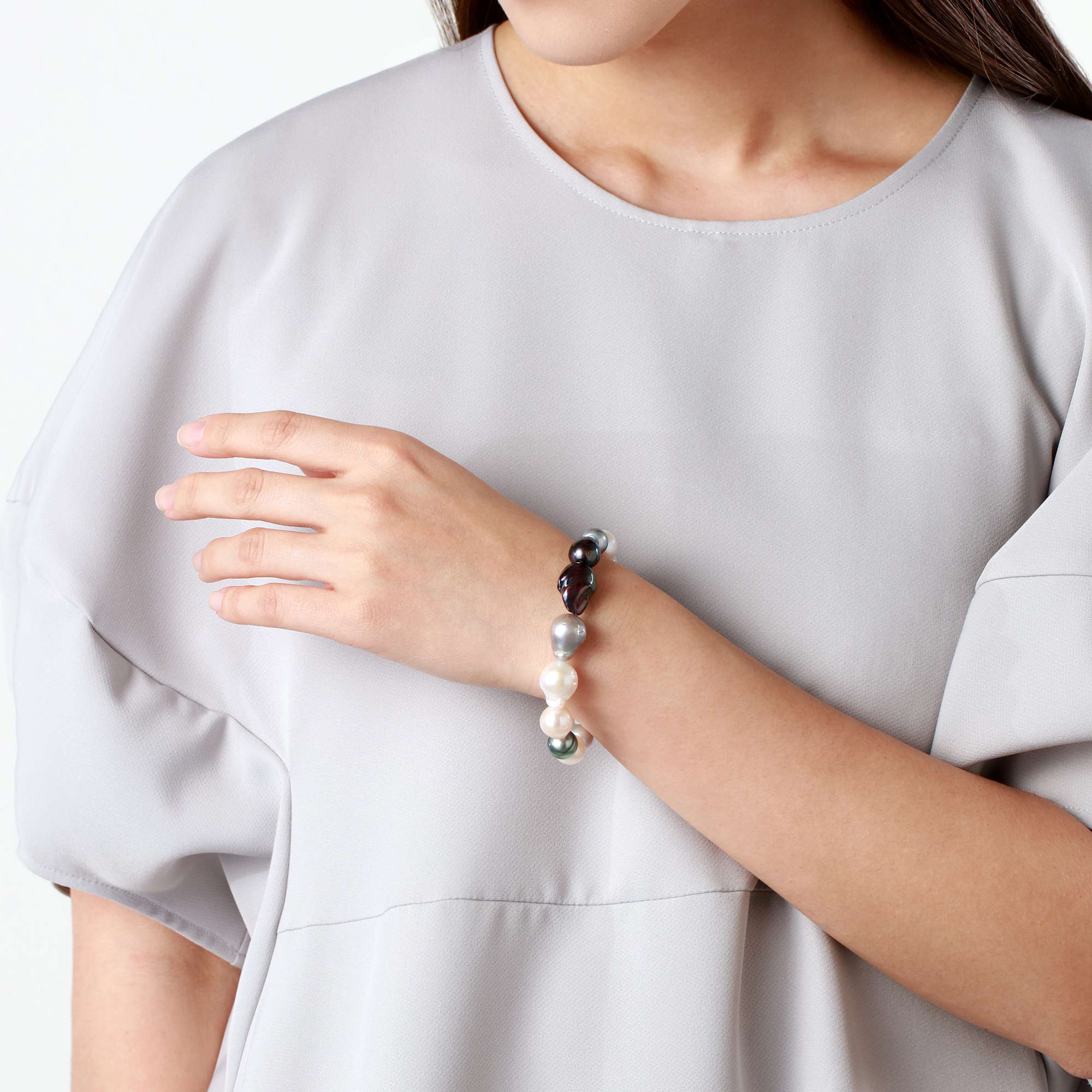 パールの自然なニュアンスが美しいブレスレット。ホワイトからダークグレーの上品なグラデーションカラーをリズミカルに配色したカラーバランスが絶妙です。ゴム仕様ですので気軽に着け外しができ、様々なスタイルにお楽しみいただけます。有核の大粒淡水パール、黒蝶真珠を使用し、大人のラグジュアリーな装いをクラスアップさせます。※大粒の真珠を使用しておりますので、自然素材ならではのふくらみやへこみ(通称えくぼ)等、個体差がございます。また長さの調整のため、パールの数が多少変わる場合がございます。※こちらの商品は無料でスペシャルパッケージにお入れいたします。 ▼ DRESS UP 商品一覧はこちらhttps://vendome.jp/vendome_boutique/feature/vendome_boutique_dressup