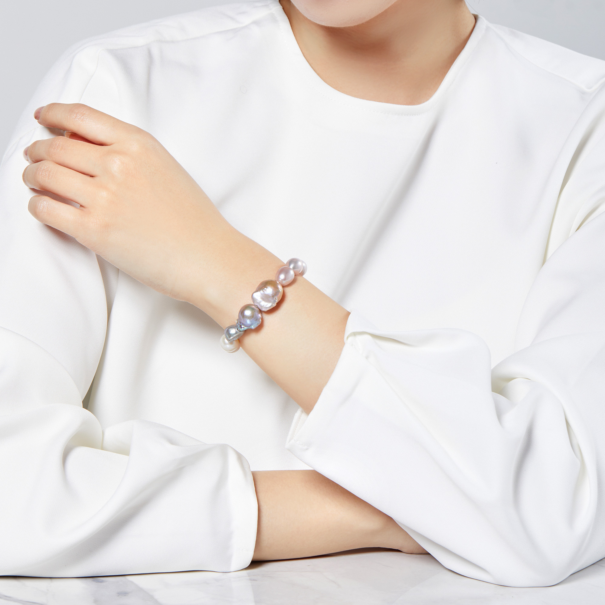 淡水パールの自然なニュアンスが美しいブレスレット。ピンク、グレー、ホワイトのニュアンスカラーの、バロックフォルムのパールをリズミカルに配置したデザインバランスが絶妙です。ポイントに使用した有核の大粒淡水パールが大人のラグジュアリーな装いをクラスアップさせます。ゴム仕様ですので気軽に着け外しができ、様々なスタイルにお楽しみいただけます。※大粒の真珠を使用しておりますので、自然素材ならではのふくらみやへこみ(通称えくぼ)等、また大きさや形に個体差がございます。長さの調整のため、パールの数が多少変わる場合がございます。※こちらの商品は無料でスペシャルパッケージにお入れいたします。 ▼ DRESS UP 商品一覧はこちらhttps://vendome.jp/vendome_boutique/feature/vendome_boutique_dressup