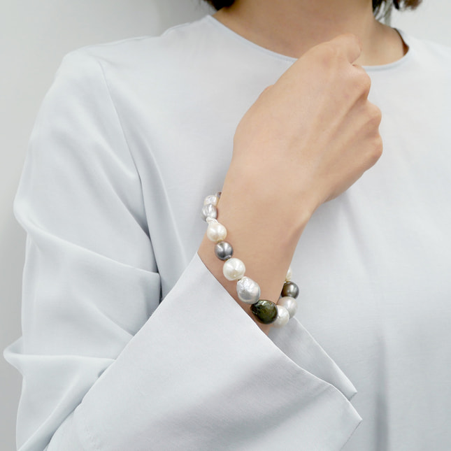 パールの自然なカラーが美しいブレスレット。ホワイトからグレーの上品なグラデーションカラーをリズミカルに配色したカラーバランスが絶妙です。ゴム仕様ですのでお気軽に着け外しができ、様々なスタイルにお楽しみいただけます。有核の大粒淡水パール、黒蝶真珠を使用し、大人のラグジュアリーな装いをクラスアップさせます。※大粒の真珠を使用しておりますので、自然素材ならではのふくらみやへこみ(通称えくぼ)等、個体差がございます。また、長さの調整のため、パールの数が多少変わる場合がございます。 ▼ DRESS UP 商品一覧はこちらhttps://vendome.jp/vendome_boutique/feature/vendome_boutique_dressup