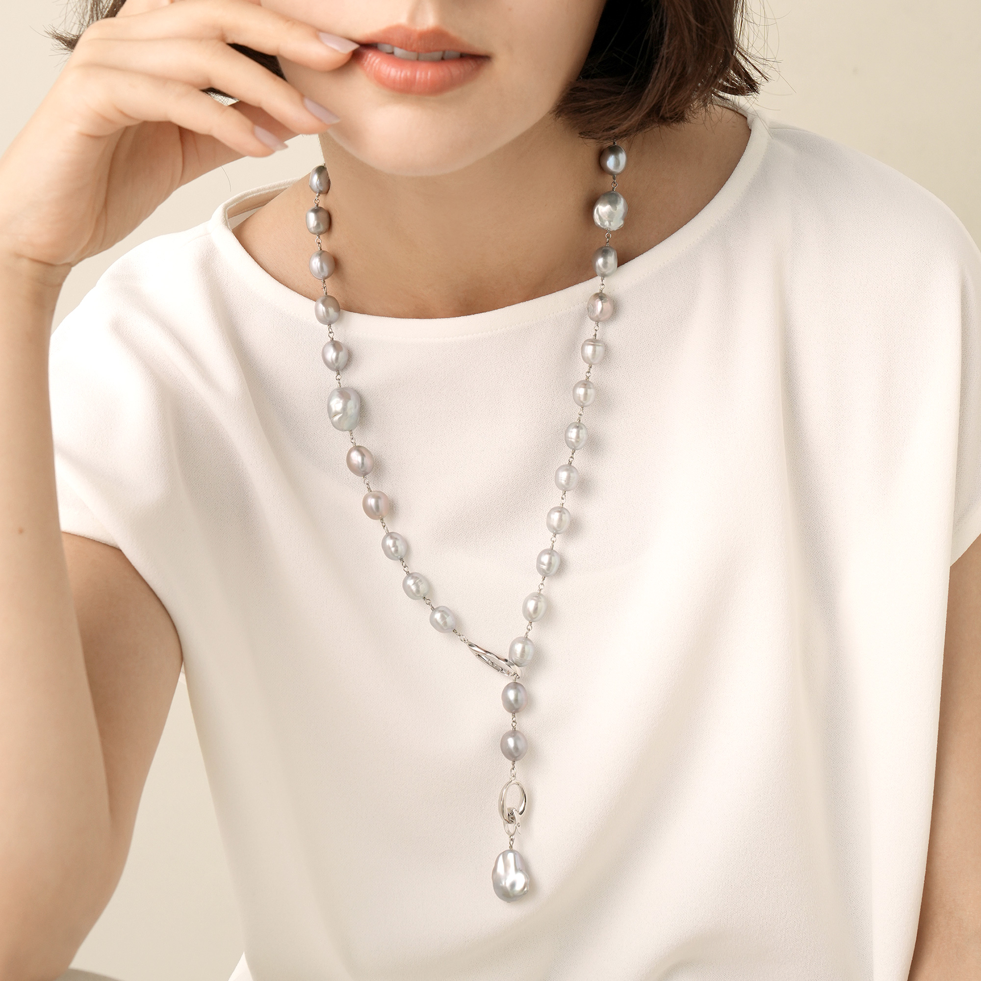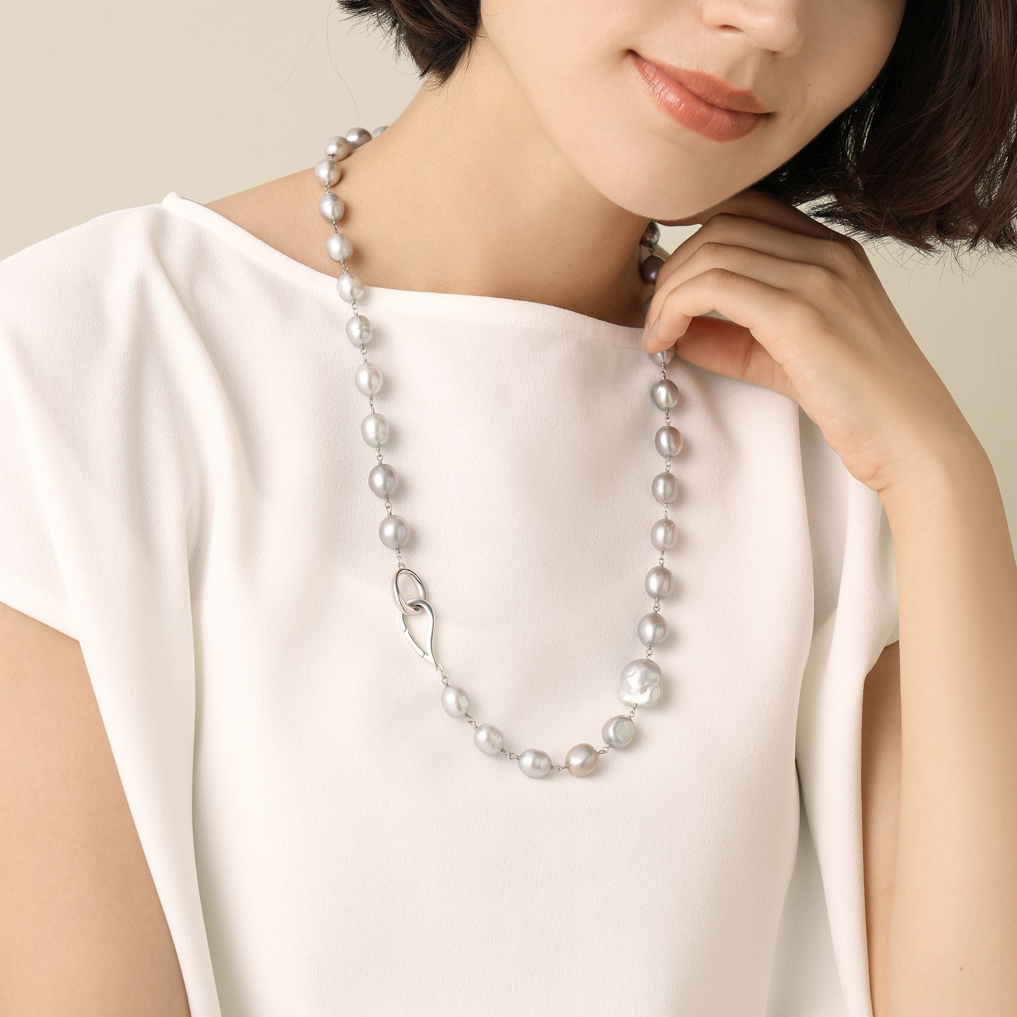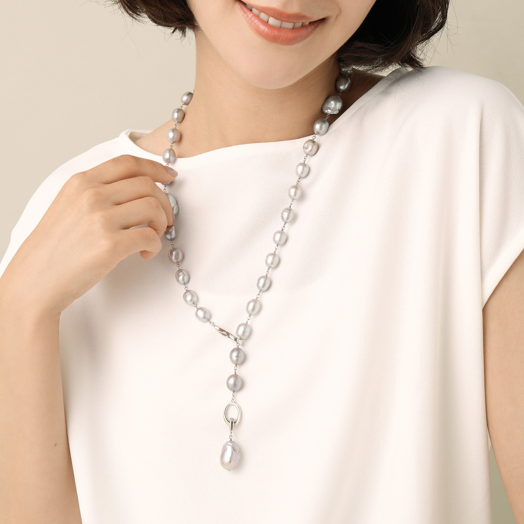 厳選した艶やかなシルバーグレーの大粒バロック淡水パールの高級感あふれるネックレス。1粒ずつ表情の違う上質なバロックパールを丁寧に仕上げたリッチで華やかなネックレスは、モダンにもフォーマルにもフィットして、感度の高いスタイリングを完成させます。滑らかなティアドロップとオーバルリングの金具も、クールエレガントな雰囲気をプラス。クラスプをお好きな場所に留めて、スタイリングに合わせたバランスのY字ネックレスとして、また、メタルのポジションをサイドにすると、エッジの効いたロングネックレスとしてもお楽しみいただけます。トップの大粒パールはクリッカーで取り外し可能です。※デザイン上、大粒の淡水真珠を使用しておりますので、自然素材ならではのふくらみやへこみ(通称えくぼ)等、個体差がございます。※こちらの商品は無料でスペシャルパッケージにお入れいたします。 ▼ DRESS UP 商品一覧はこちらhttps://vendome.jp/vendome_boutique/feature/vendome_boutique_dressup