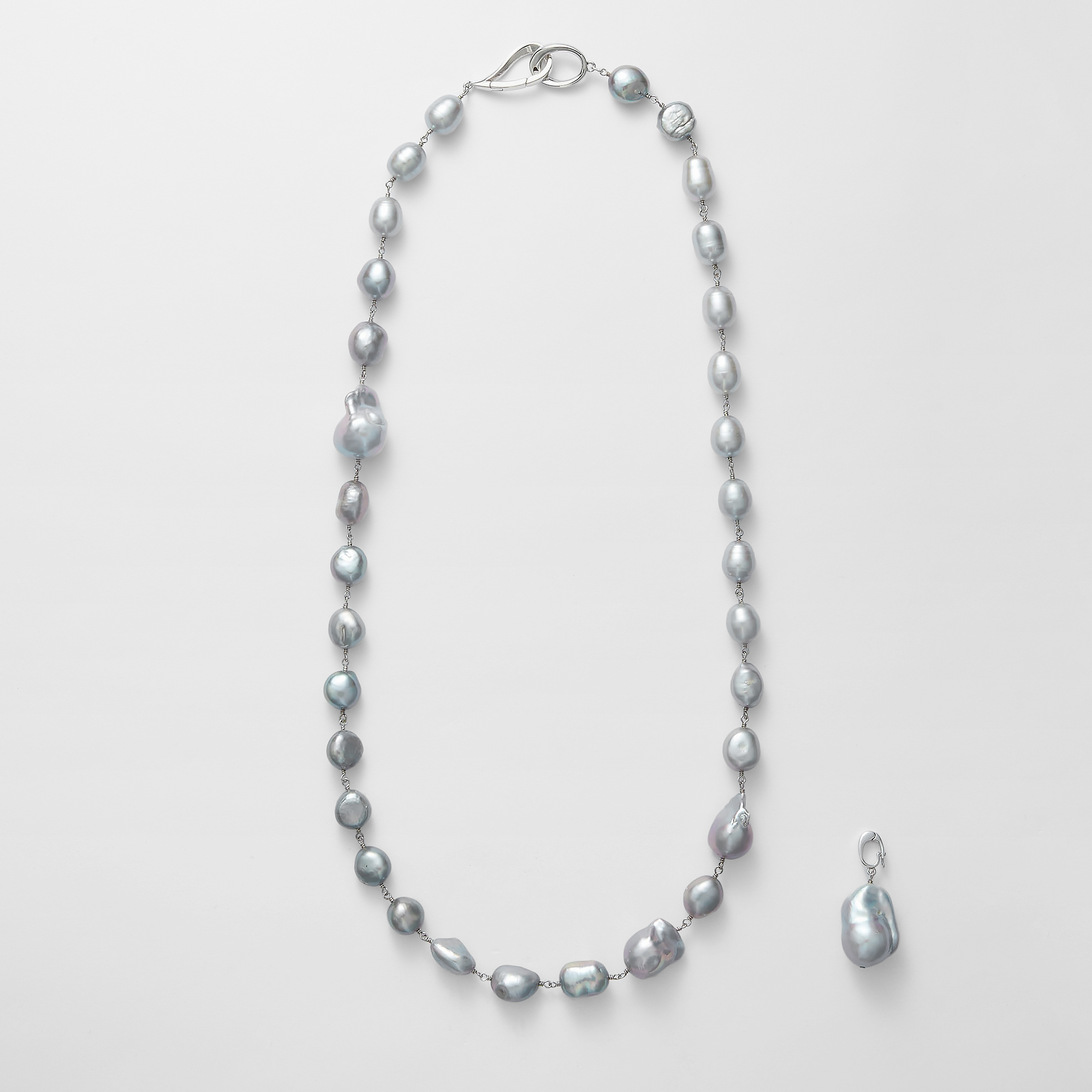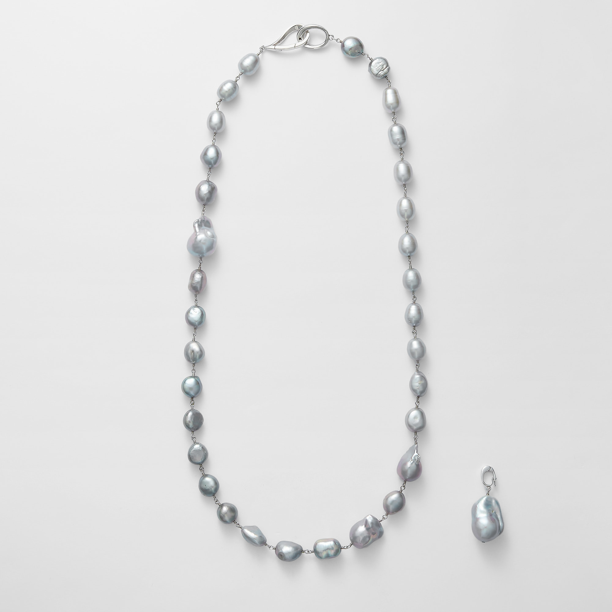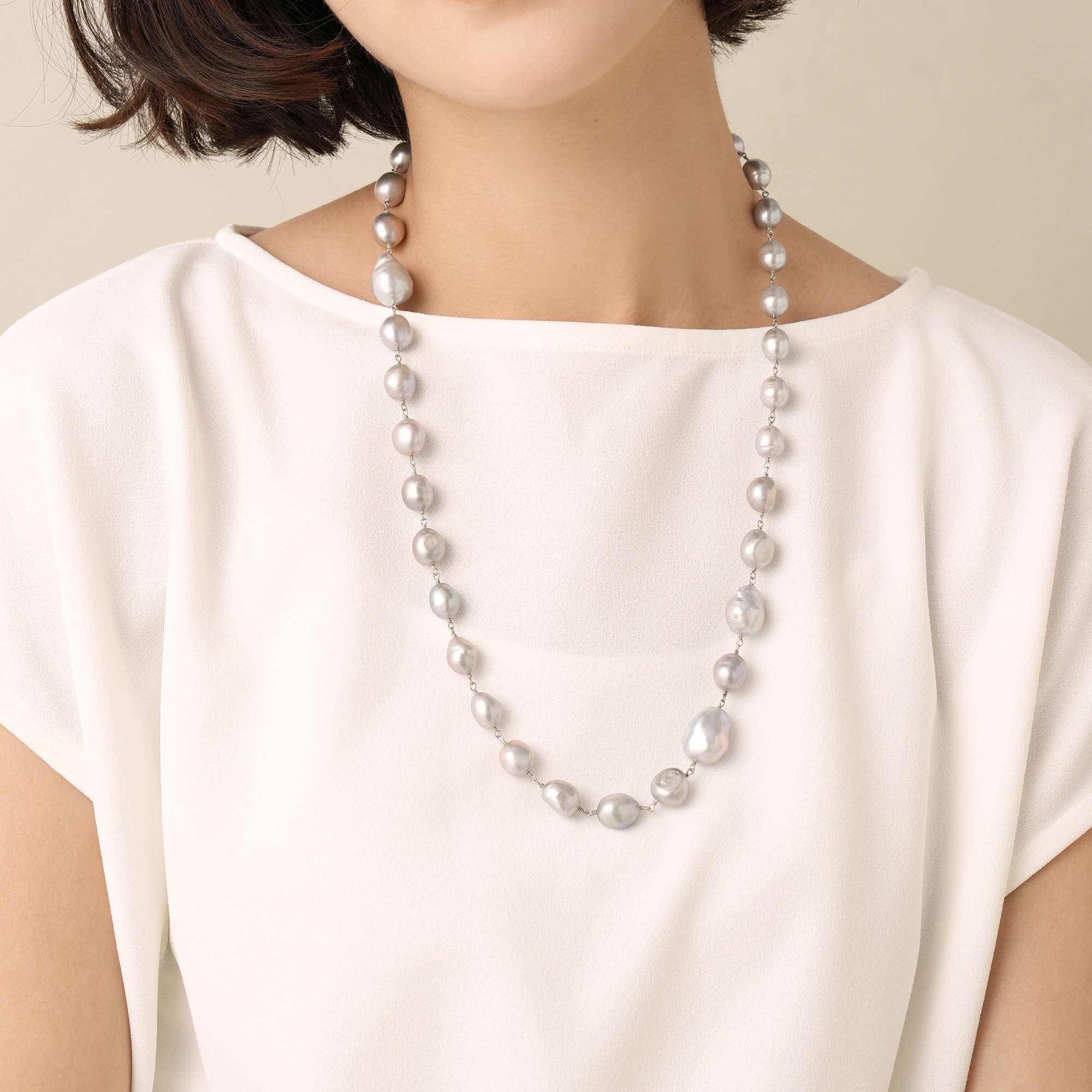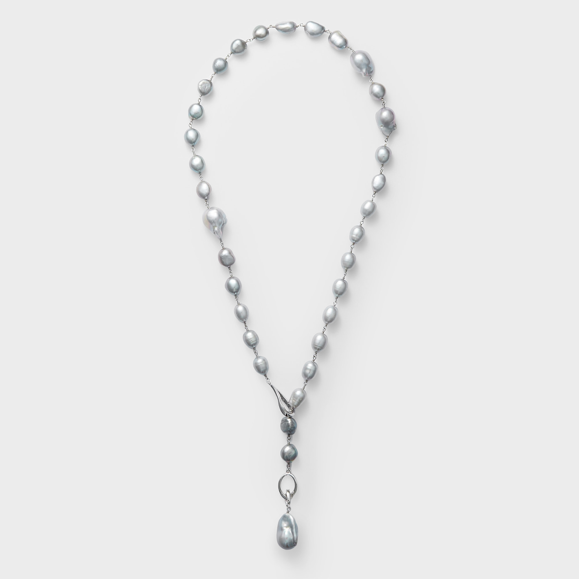 厳選した艶やかなシルバーグレーの大粒バロック淡水パールの高級感あふれるネックレス。1粒ずつ表情の違う上質なバロックパールを丁寧に仕上げたリッチで華やかなネックレスは、モダンにもフォーマルにもフィットして、感度の高いスタイリングを完成させます。滑らかなティアドロップとオーバルリングの金具も、クールエレガントな雰囲気をプラス。クラスプをお好きな場所に留めて、スタイリングに合わせたバランスのY字ネックレスとして、また、メタルのポジションをサイドにすると、エッジの効いたロングネックレスとしてもお楽しみいただけます。トップの大粒パールはクリッカーで取り外し可能です。※デザイン上、大粒の淡水真珠を使用しておりますので、自然素材ならではのふくらみやへこみ(通称えくぼ)等、個体差がございます。※こちらの商品は無料でスペシャルパッケージにお入れいたします。 ▼ DRESS UP 商品一覧はこちらhttps://vendome.jp/vendome_boutique/feature/vendome_boutique_dressup