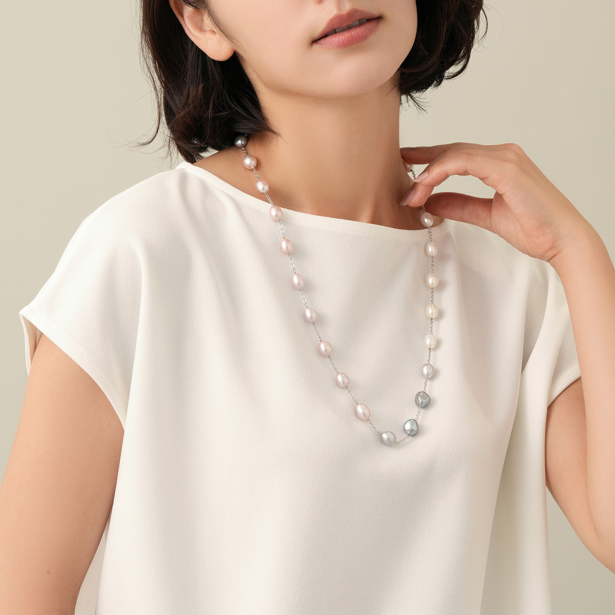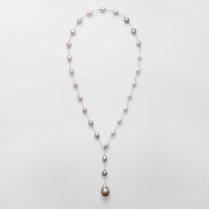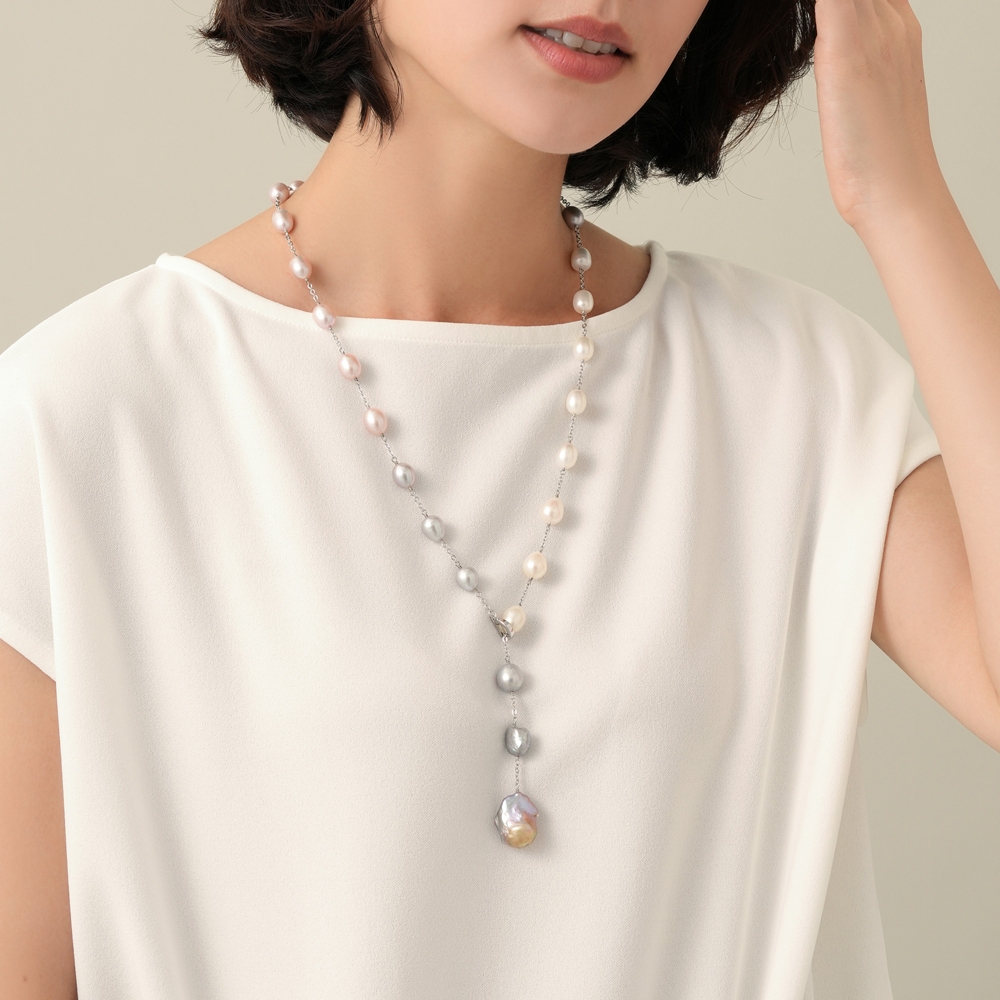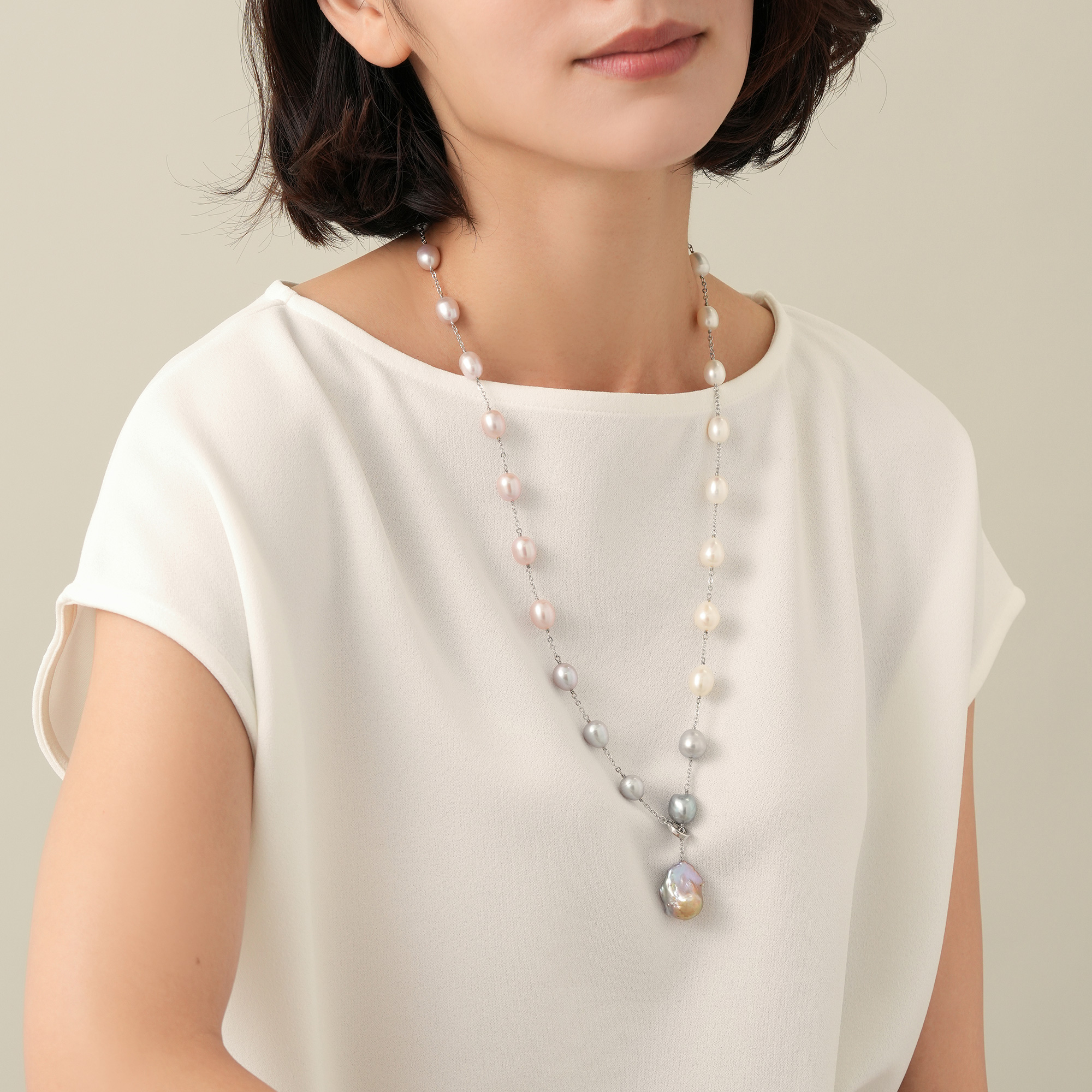 ホワイト、グレー、ピンクの淡水パールの上品なニュアンスカラーが美しいロングネックレス。留め具のクリッカーの着け位置でさまざまなスタイルにお楽しみいただけます。トップには有核の大粒淡水パールを使用し、大人のラグジュアリーな装いをクラスアップさせます。※大粒の真珠を使用しておりますので、自然素材ならではのふくらみやへこみ(通称えくぼ)等、個体差がございます。また長さの調整のため、パールの数が多少変わる場合がございます。※こちらの商品は無料でスペシャルパッケージにお入れいたします。 ▼ DRESS UP 商品一覧はこちらhttps://vendome.jp/vendome_boutique/feature/vendome_boutique_dressup