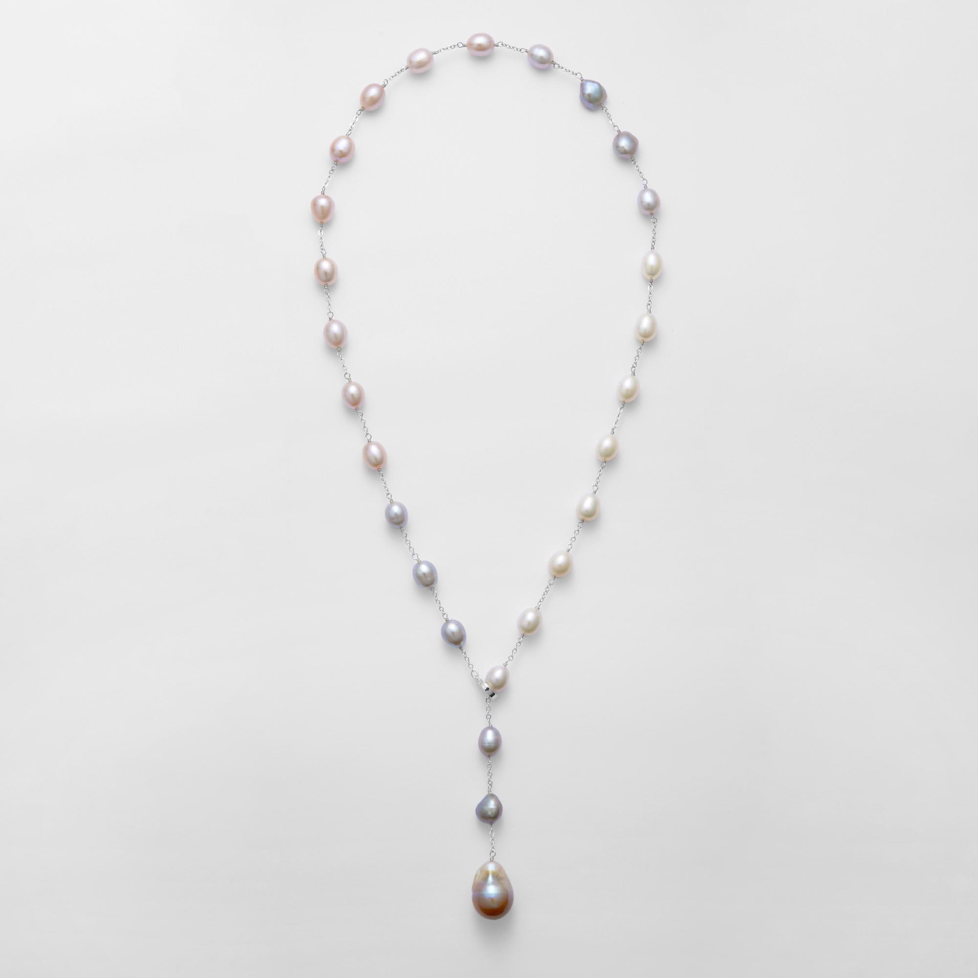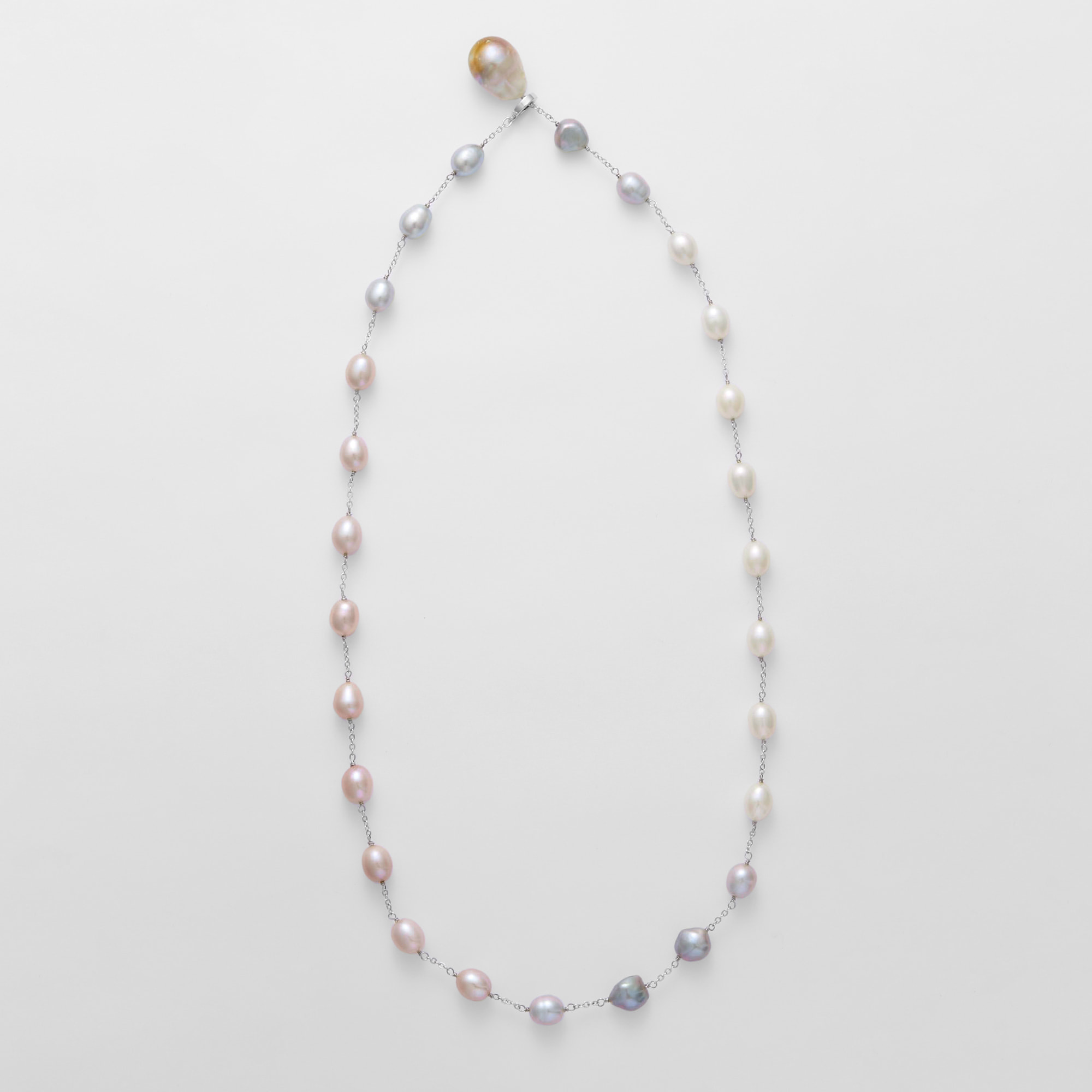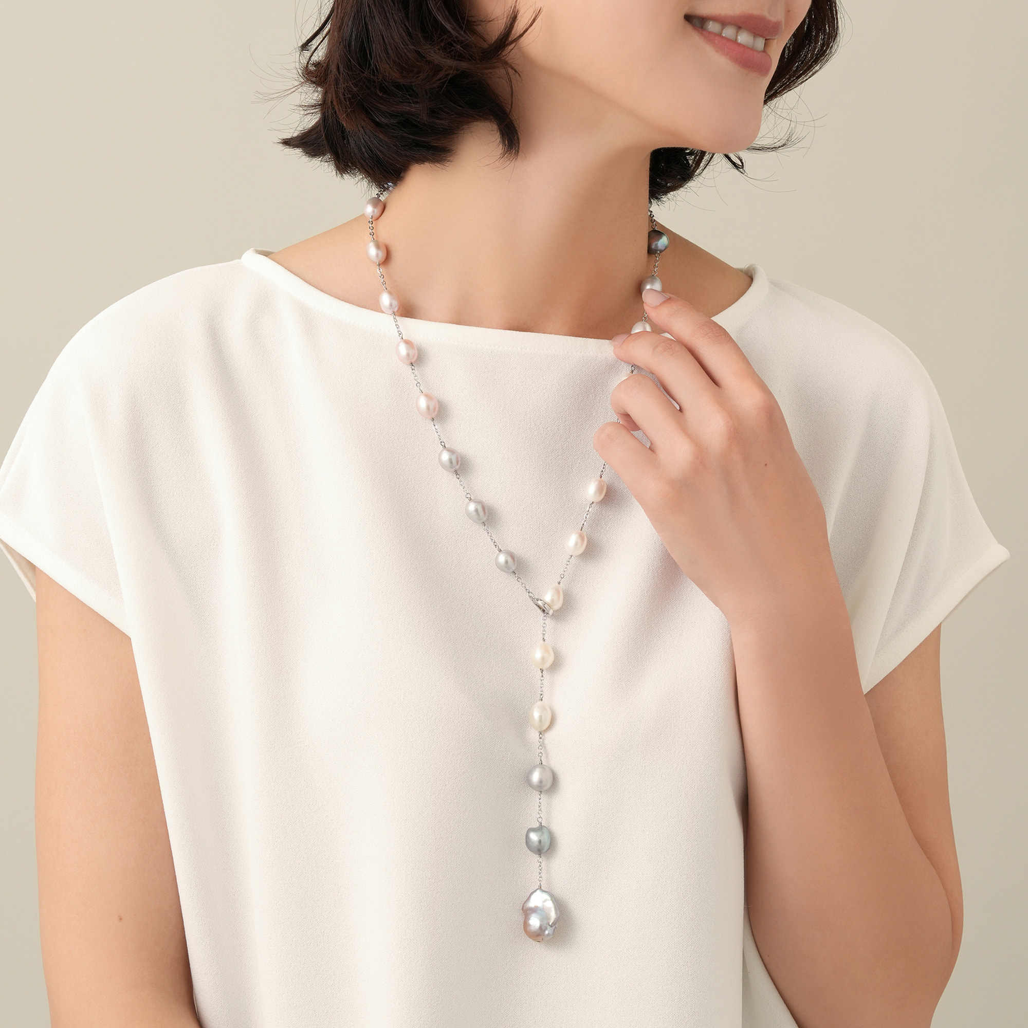 ホワイト、グレー、ピンクの淡水パールの上品なニュアンスカラーが美しいロングネックレス。留め具のクリッカーの着け位置でさまざまなスタイルにお楽しみいただけます。トップには有核の大粒淡水パールを使用し、大人のラグジュアリーな装いをクラスアップさせます。※大粒の真珠を使用しておりますので、自然素材ならではのふくらみやへこみ(通称えくぼ)等、個体差がございます。また長さの調整のため、パールの数が多少変わる場合がございます。※こちらの商品は無料でスペシャルパッケージにお入れいたします。 ▼ DRESS UP 商品一覧はこちらhttps://vendome.jp/vendome_boutique/feature/vendome_boutique_dressup