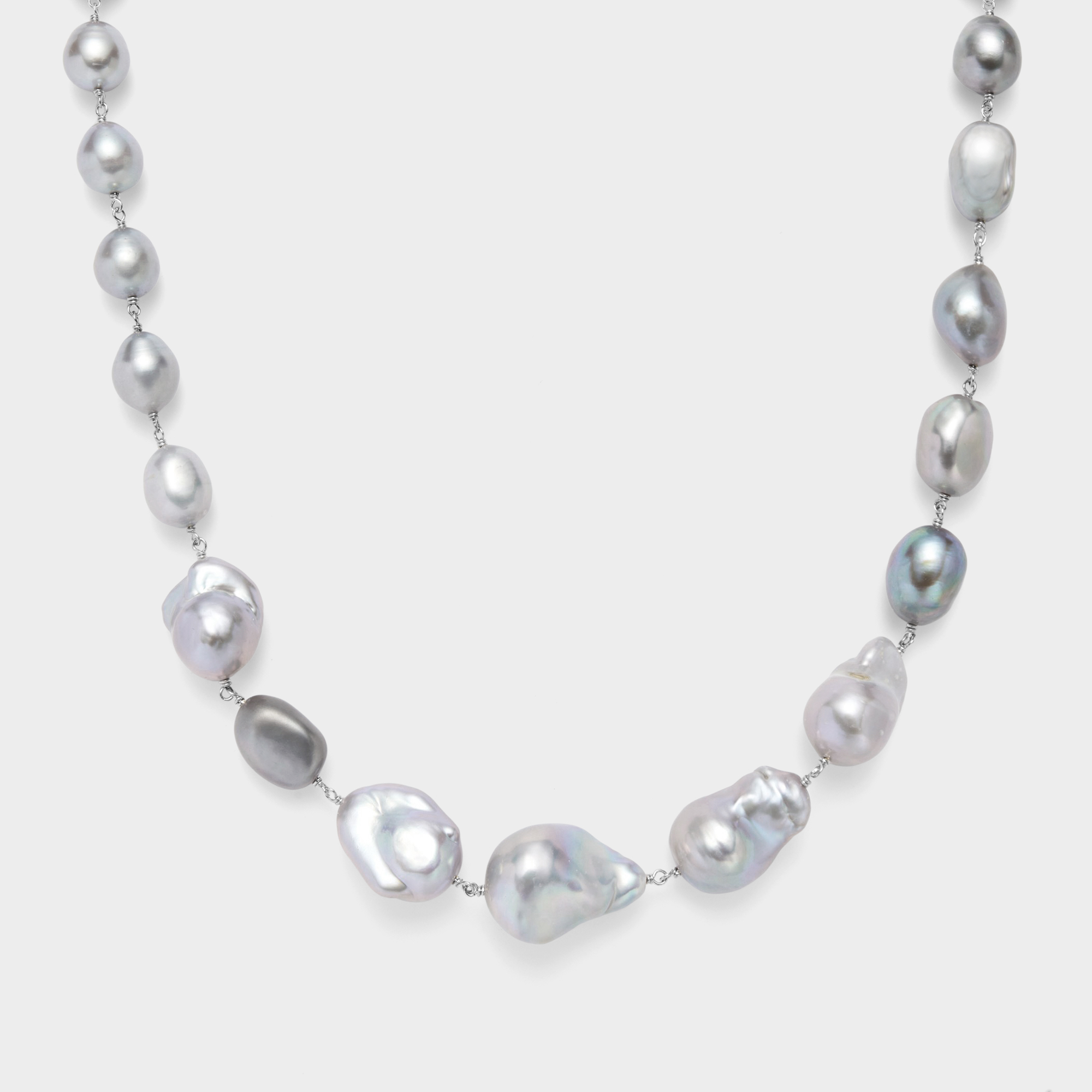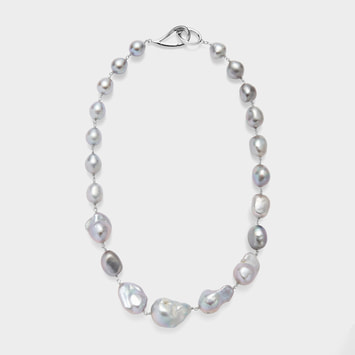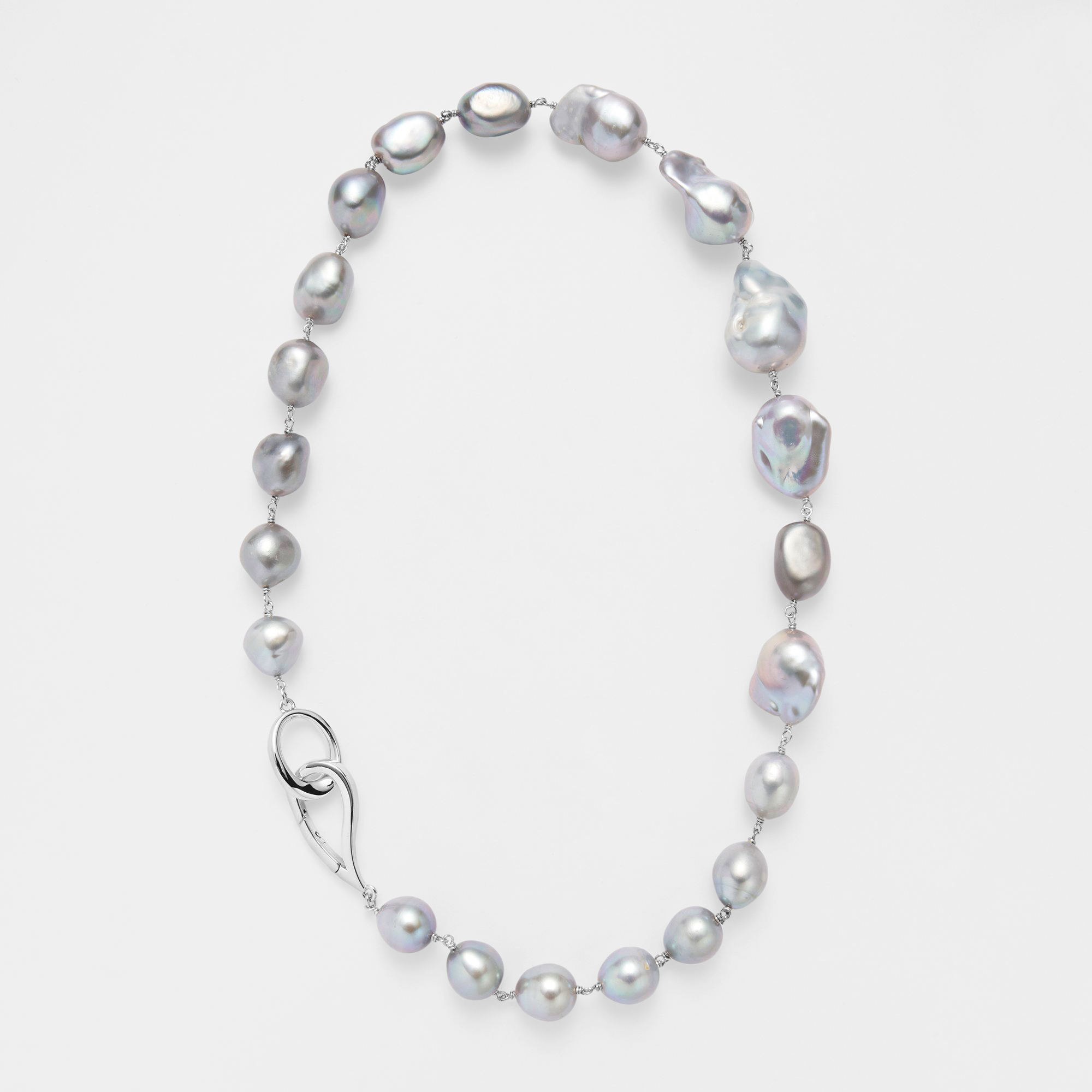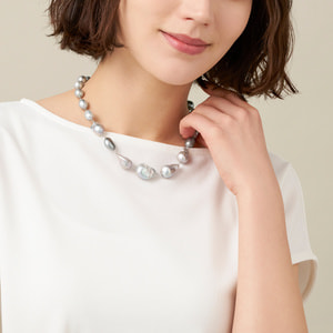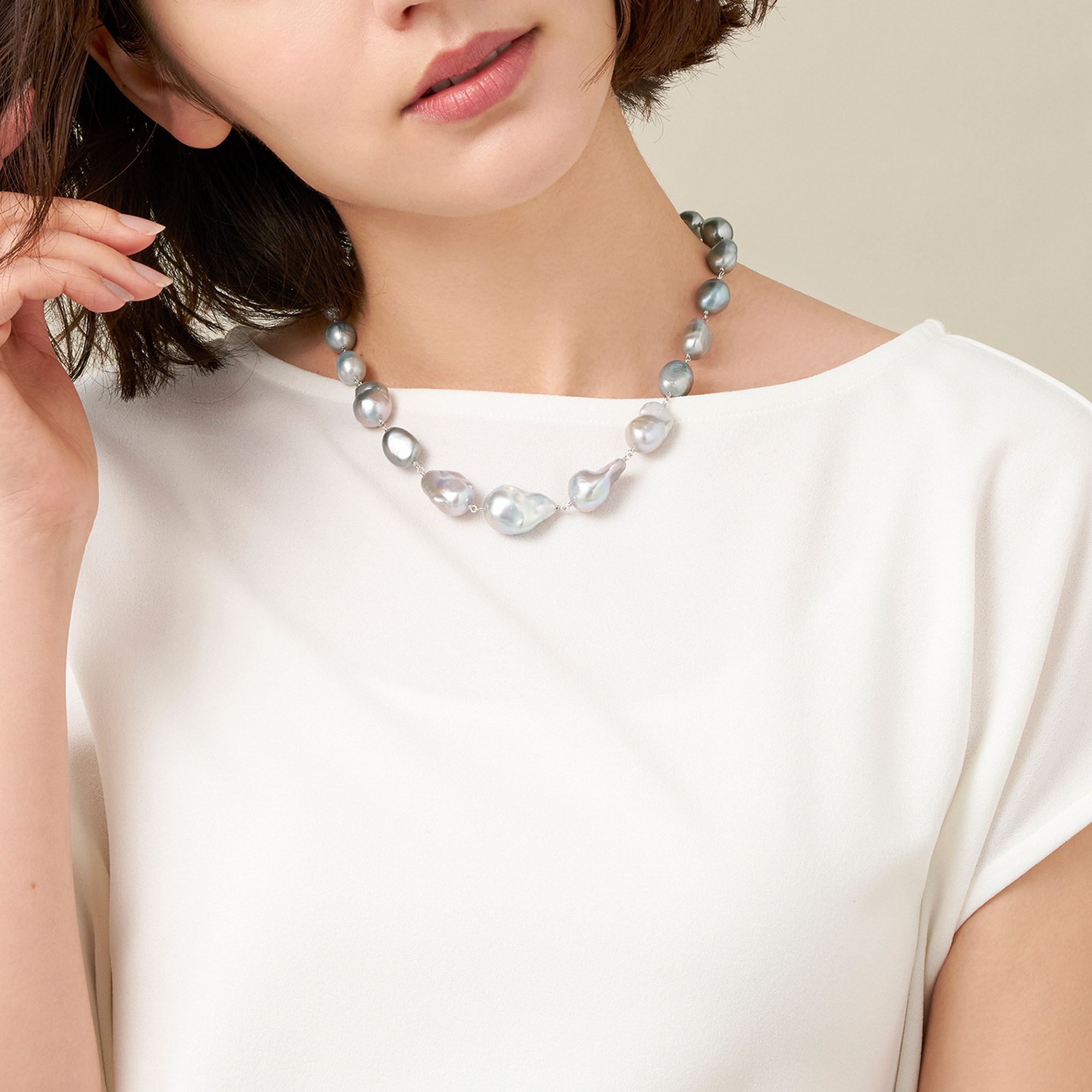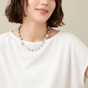 厳選した艶やかなシルバーグレーの大粒バロック淡水パールの高級感あふれるネックレス。1粒ずつ表情の違う上質なバロックパールを丁寧に仕上げた45cmのミドルレングスのネックレスは、モダンにもフォーマルにもフィットして、感度の高いスタイリングを完成させます。滑らかなティアドロップとオーバルリングのデザインメタルがクールエレガントな雰囲気をプラス。メタルのポジションをサイドにするとエッジの効いたスタイリングも楽しめます。※デザイン上、大粒の淡水真珠を使用しておりますので、自然素材ならではのふくらみやへこみ(通称えくぼ)等、個体差がございます。※こちらの商品は無料でスペシャルパッケージにお入れいたします。 ▼ DRESS UP 商品一覧はこちらhttps://vendome.jp/vendome_boutique/feature/vendome_boutique_dressup