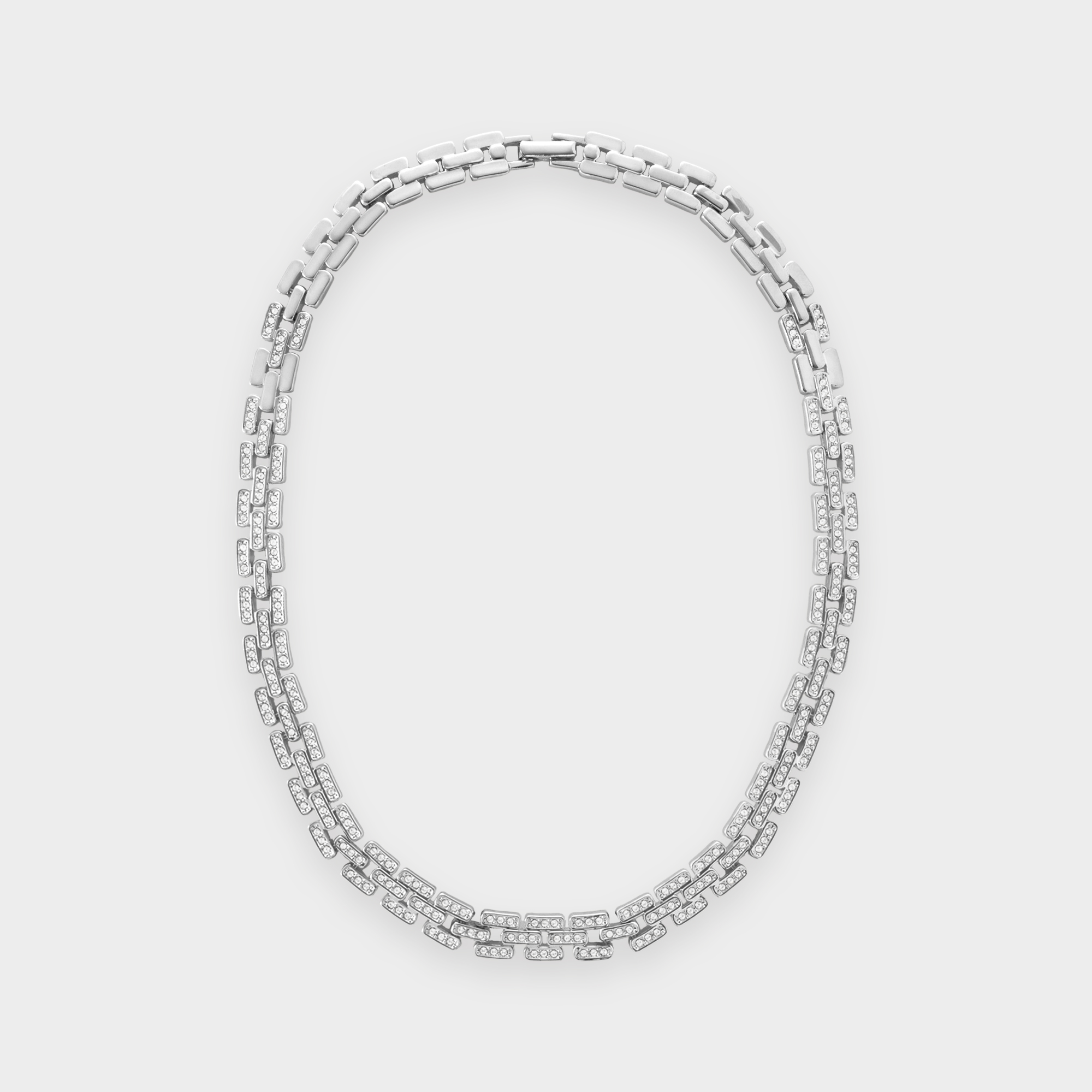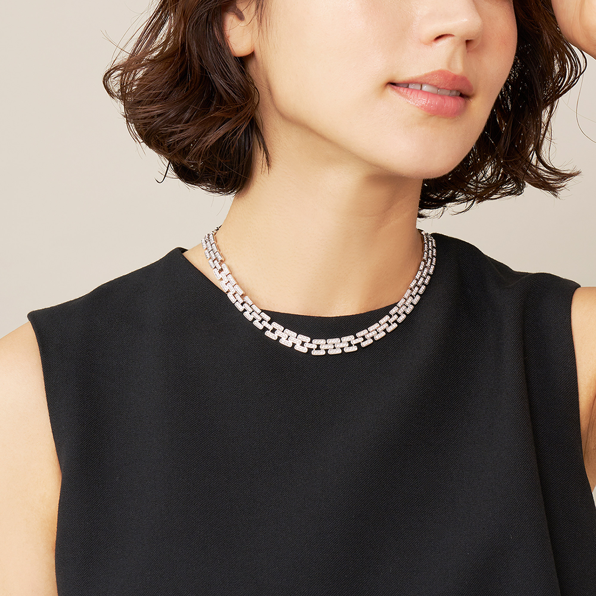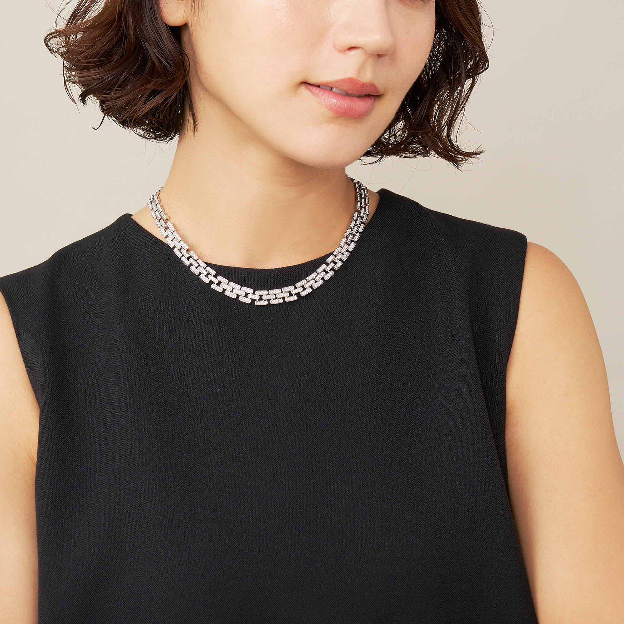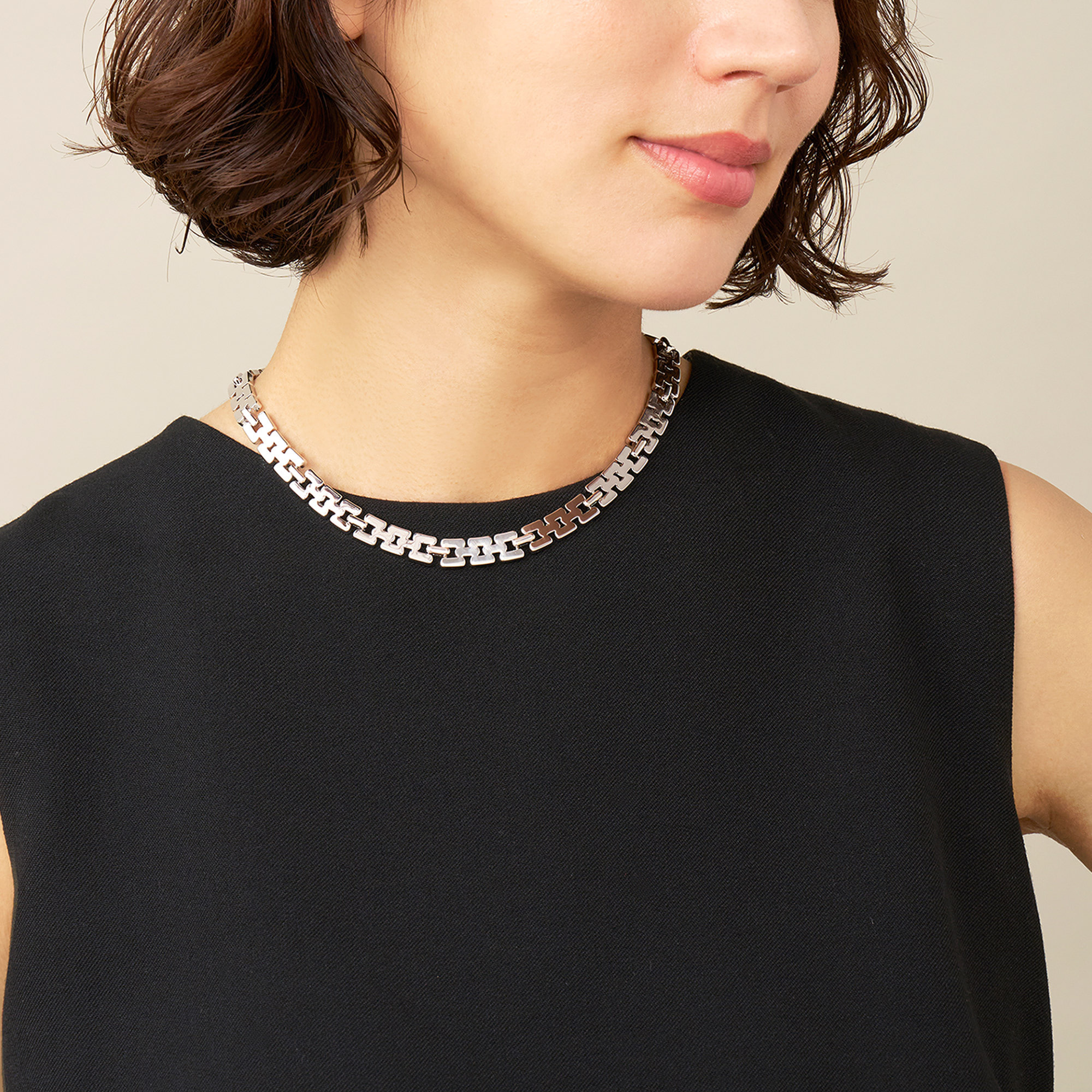 カットガラスが煌めく、上品でスタイリッシュな印象のネックレス。アール・デコのムードを感じさせるスクエアを織り重ねた幾何学的なデザインです。程よく存在感あるボリュームながらすっきりとした直線的なラインと透け感のあるデザインで、大人のエレガンスを演出します。スタイリングのバランスがとりやすいショートレングスで、デコルテを華やかに魅せてくれます。いつものスタイリングにクラス感をプラスしてくれるネックレスです。※こちらの商品は無料でスペシャルパッケージにお入れいたします。 ▼ DRESS UP 商品一覧はこちらhttps://vendome.jp/vendome_boutique/feature/vendome_boutique_dressup