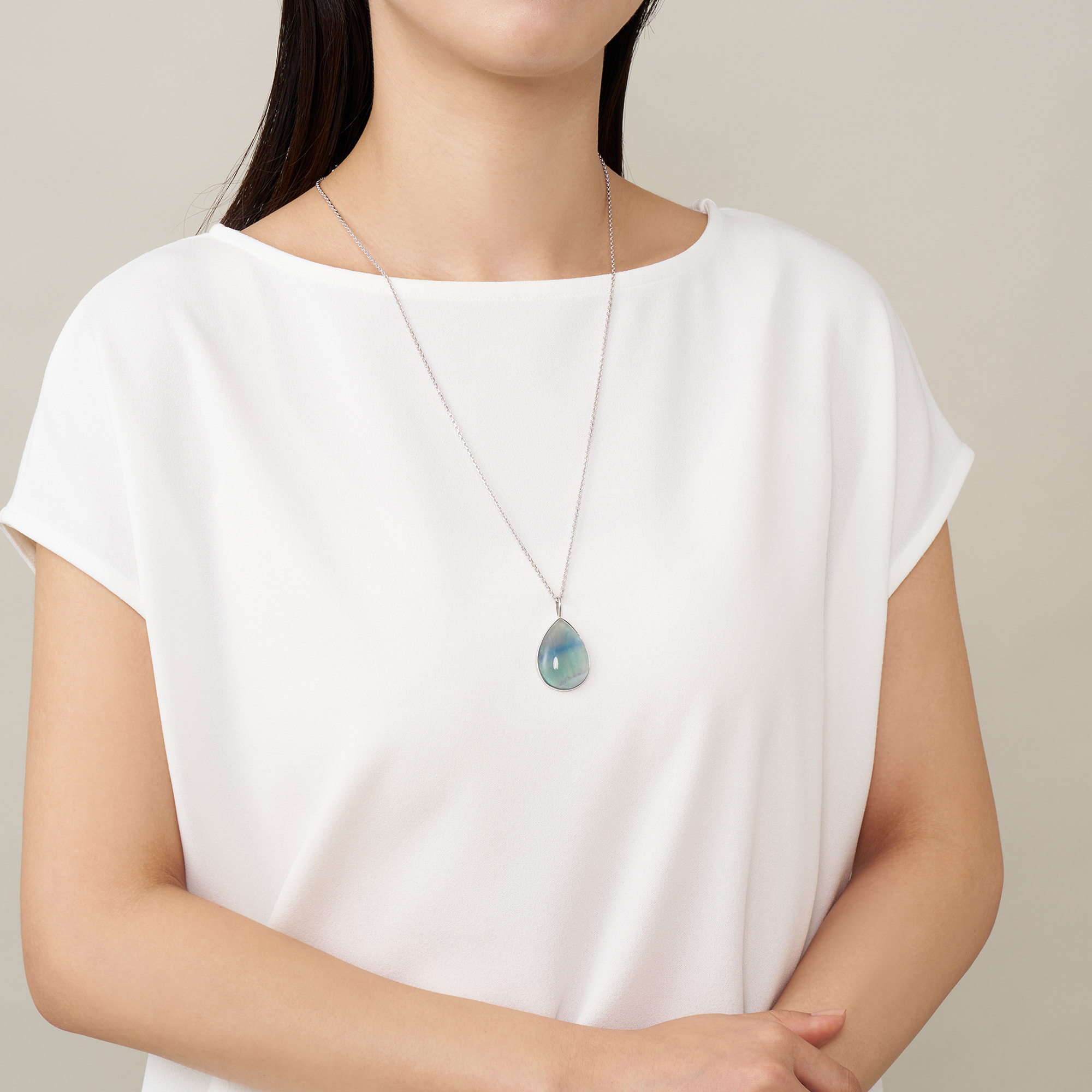 地球が創り出す美しい唯一無二の天然石を、職人が1つ1つ丁寧に作った特別なネックレス。フルオライトはブルーからグリーンに移り行く海の色のような透明感が魅力。その不思議な色合いから「蛍石」とも言われます。石言葉は「清らかな愛」「知性」「創造性」。スライドタイプのアジャスターで、長さを自在に調節でき、気分やスタイリングに合わせてアレンジが楽しめるアイテムです。※こちらの商品は無料でギフトボックスにお入れいたします。 ▼ DRESS UP 商品一覧はこちらhttps://vendome.jp/vendome_boutique/feature/vendome_boutique_dressup