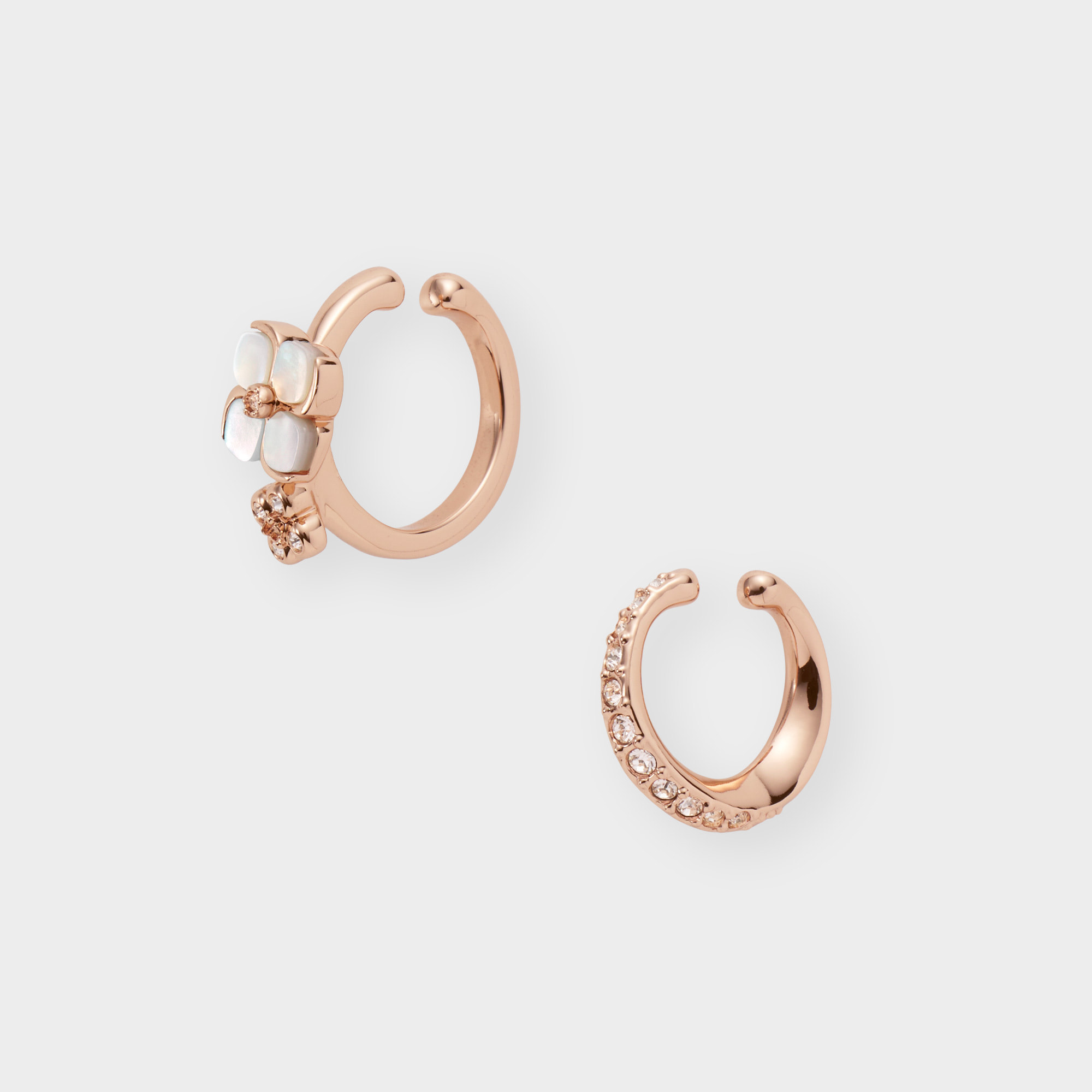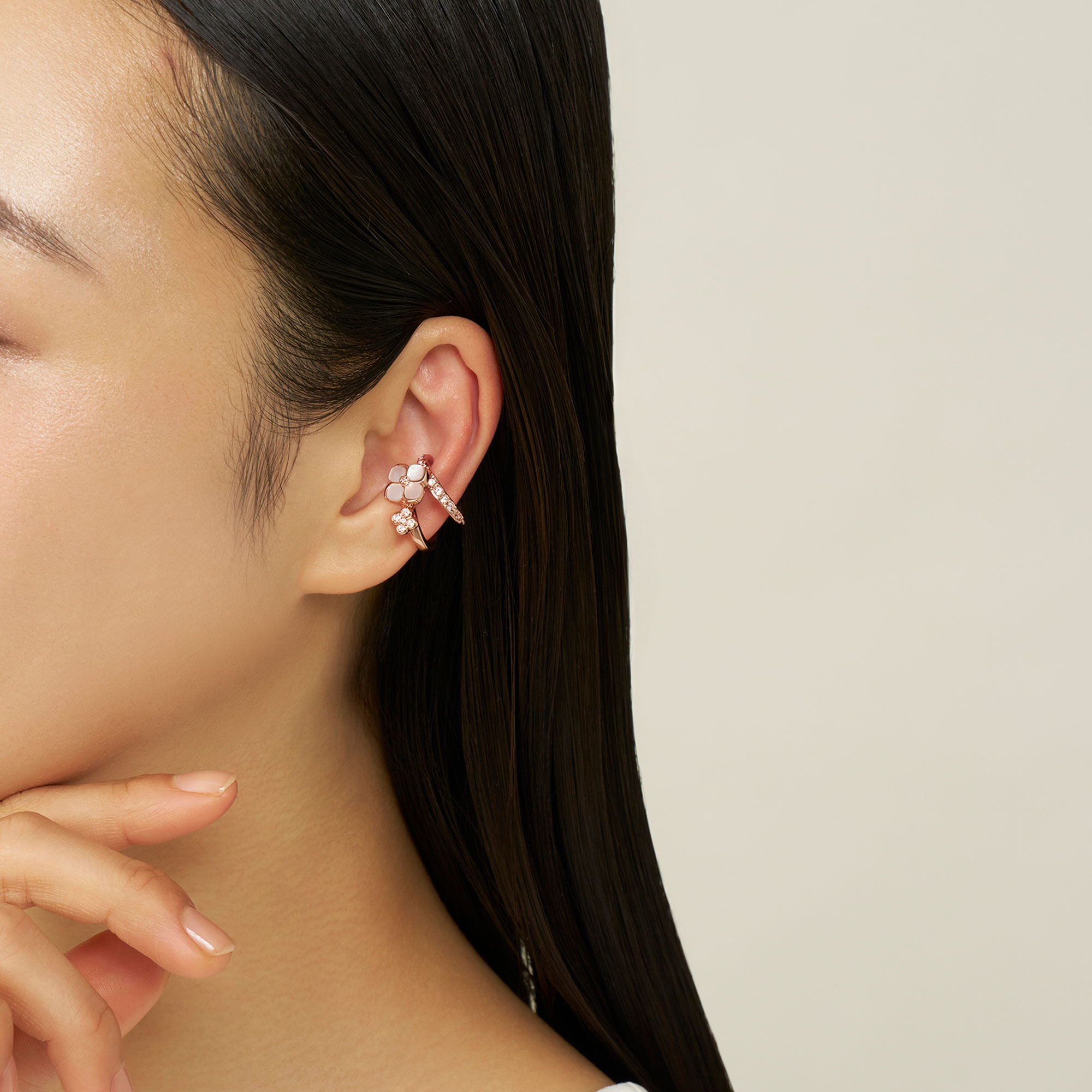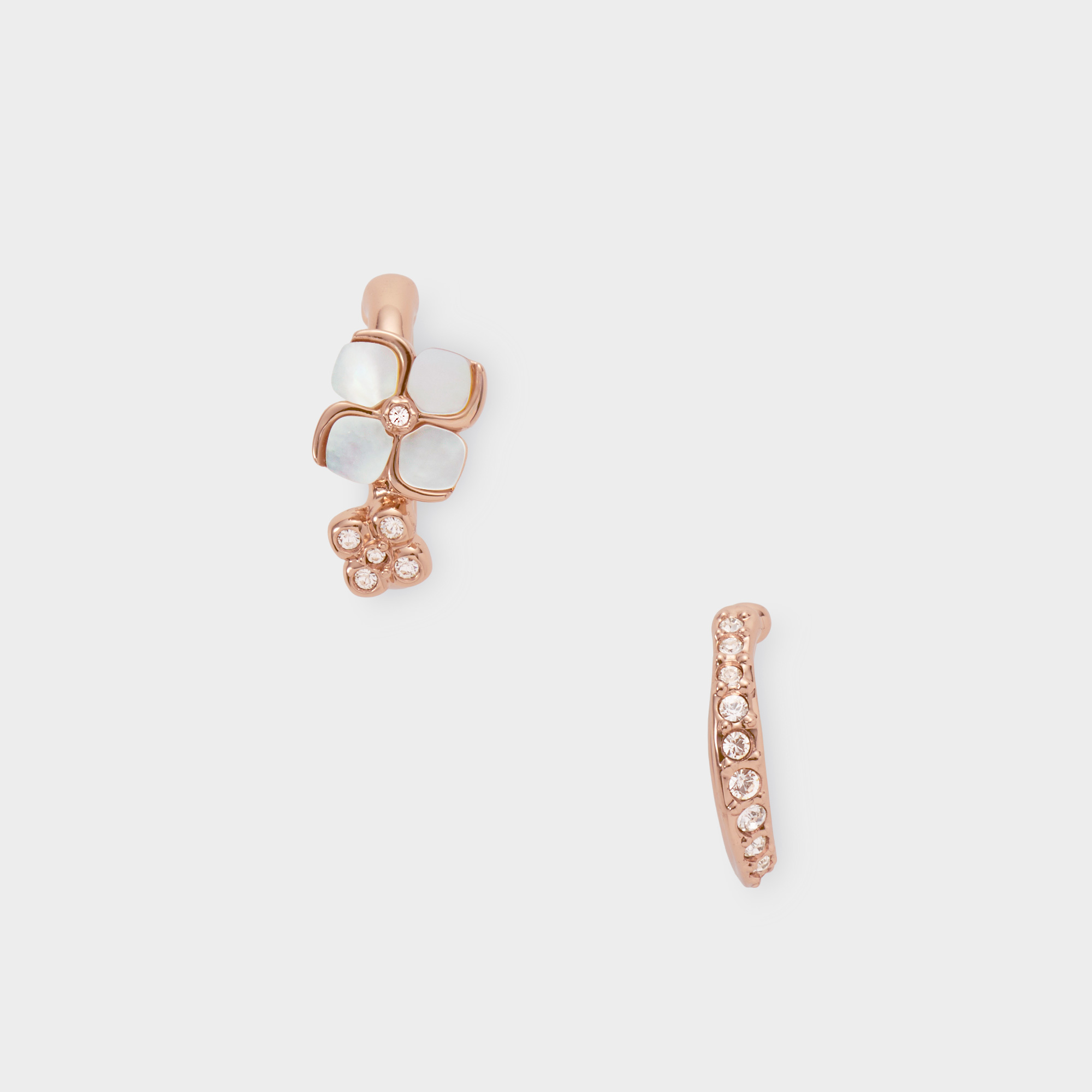 上質な白蝶貝を1つ1つ丁寧にかたどった花モチーフと、繊細なカットガラスを散りばめたミニマルなデザイン。異なる表情を持つ二つのイヤーカフを組み合わせたセットアイテムです。