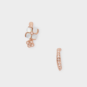 エレガントな花と、モダンなラインのイヤーカフを重ねて、華やかな印象に。