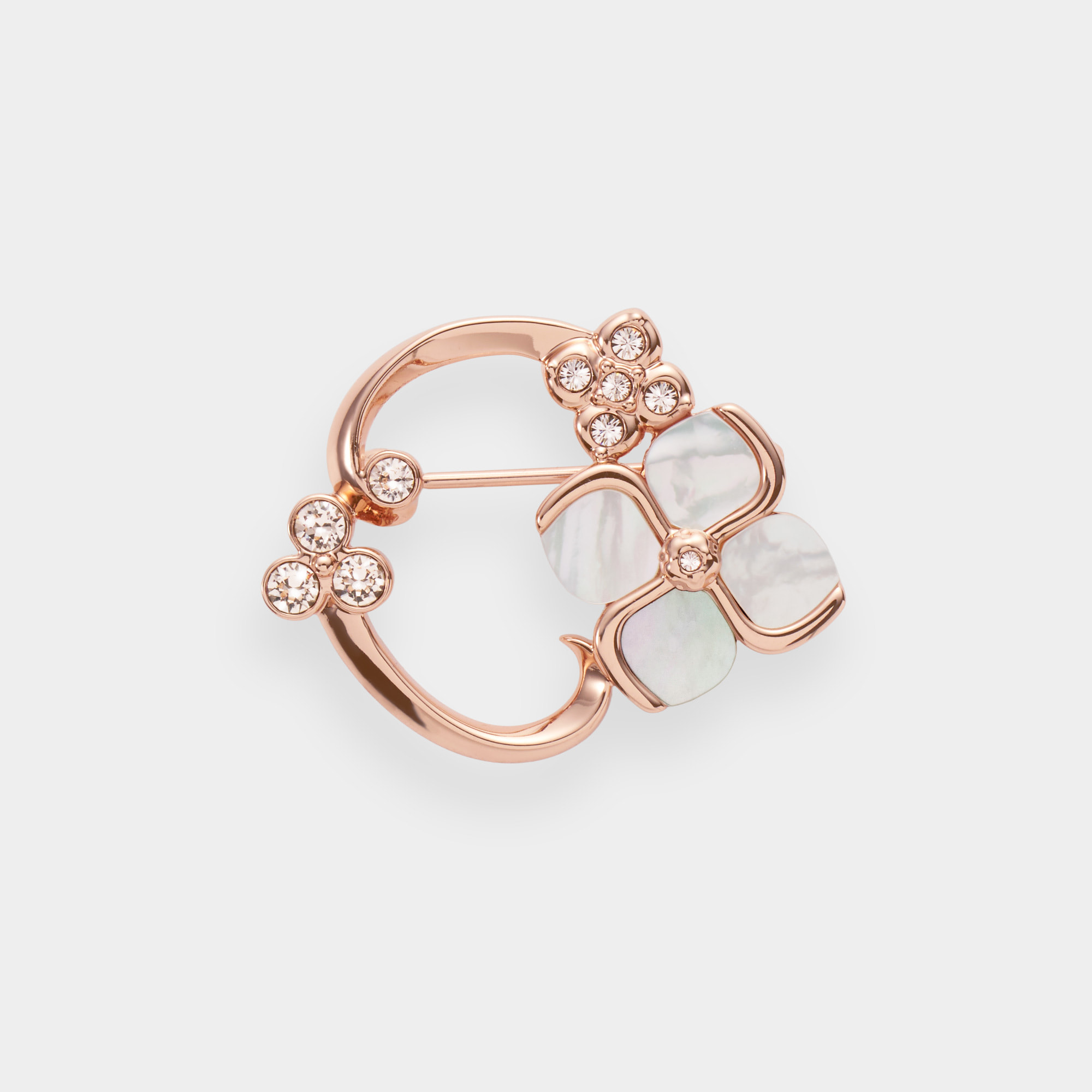 質の良いシェルを丁寧にかたどった可憐な花に、カットガラスの煌めきを添えたブローチ。