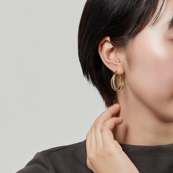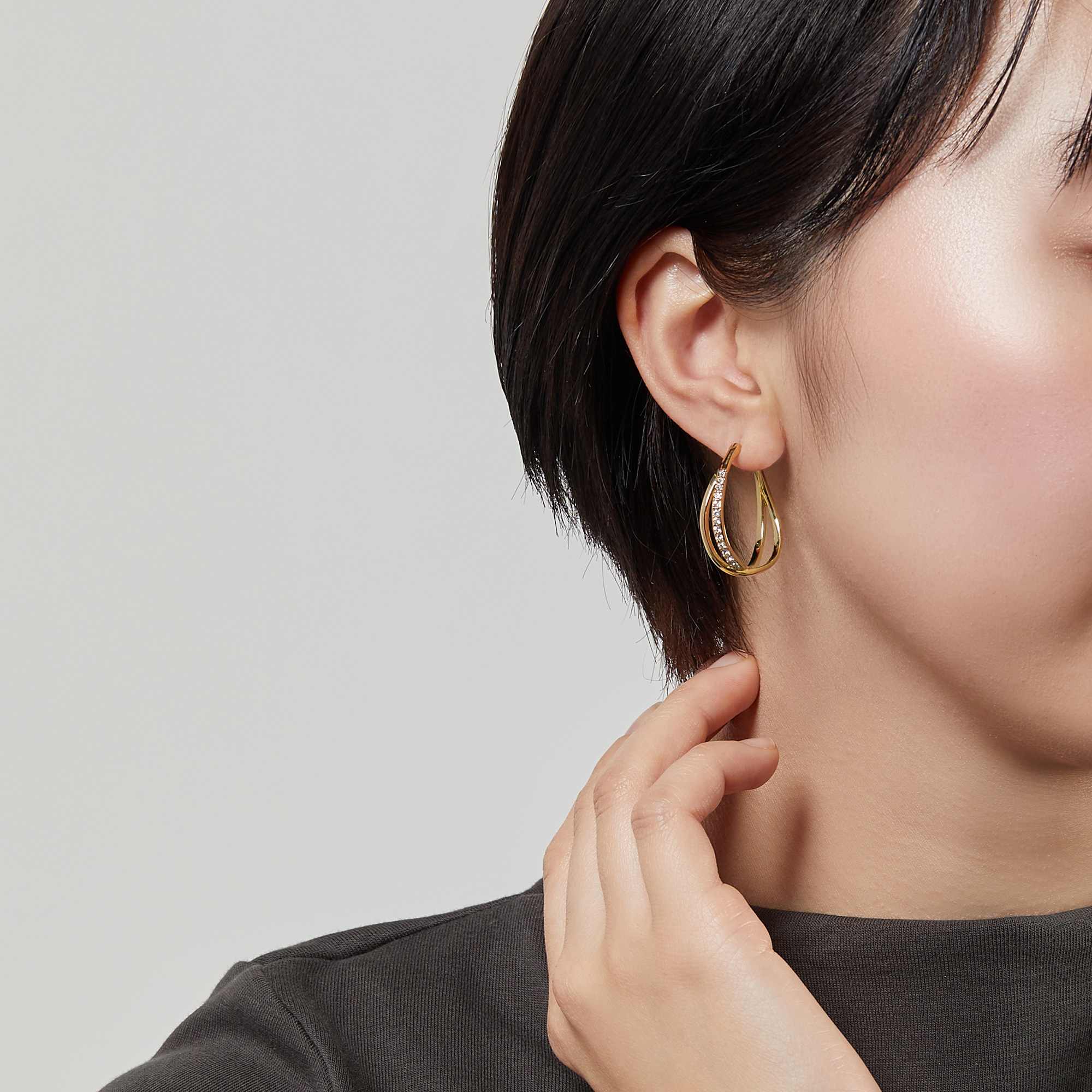 つくりのよさと着けやすいサイズ感が人気のベーシックシリーズ。つややかな質感のメタルとカットガラスの輝きが上品なフープピアス。繊細なフープが重なり合ったエレガントな印象で、耳元に上質感を与えてくれるアイテムです。カットガラスのきらめきがシンプルな中に華やかさをプラスします。