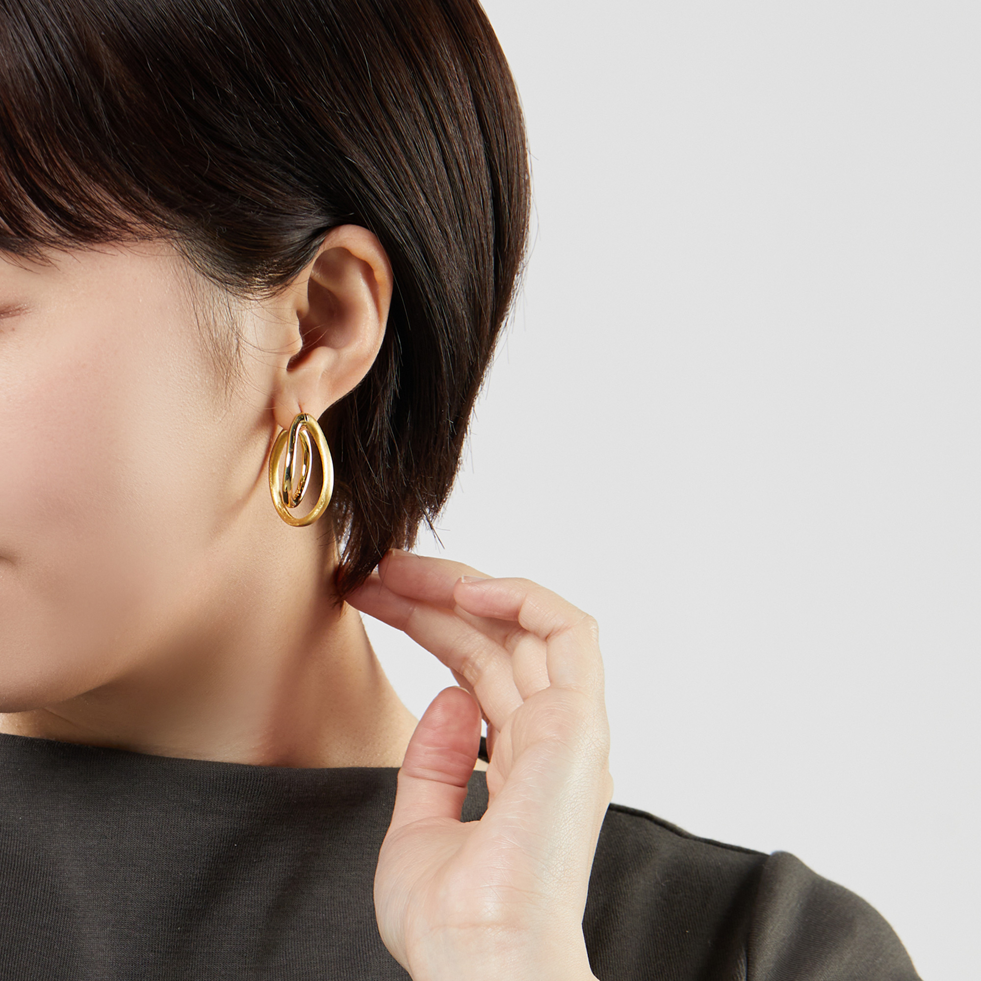 オーガニックなフォルムが魅力のピアス。シャインとマットの異なる仕上げの2本のラインで作られる構築的な造形は、見る角度によって様々な表情を持ちます。ボリュームがありながらも軽やかな印象のデザインで、様々なコーディネートに合わせてお使いいただけるアイテム。耳元をスタイリッシュにアップデートします。
