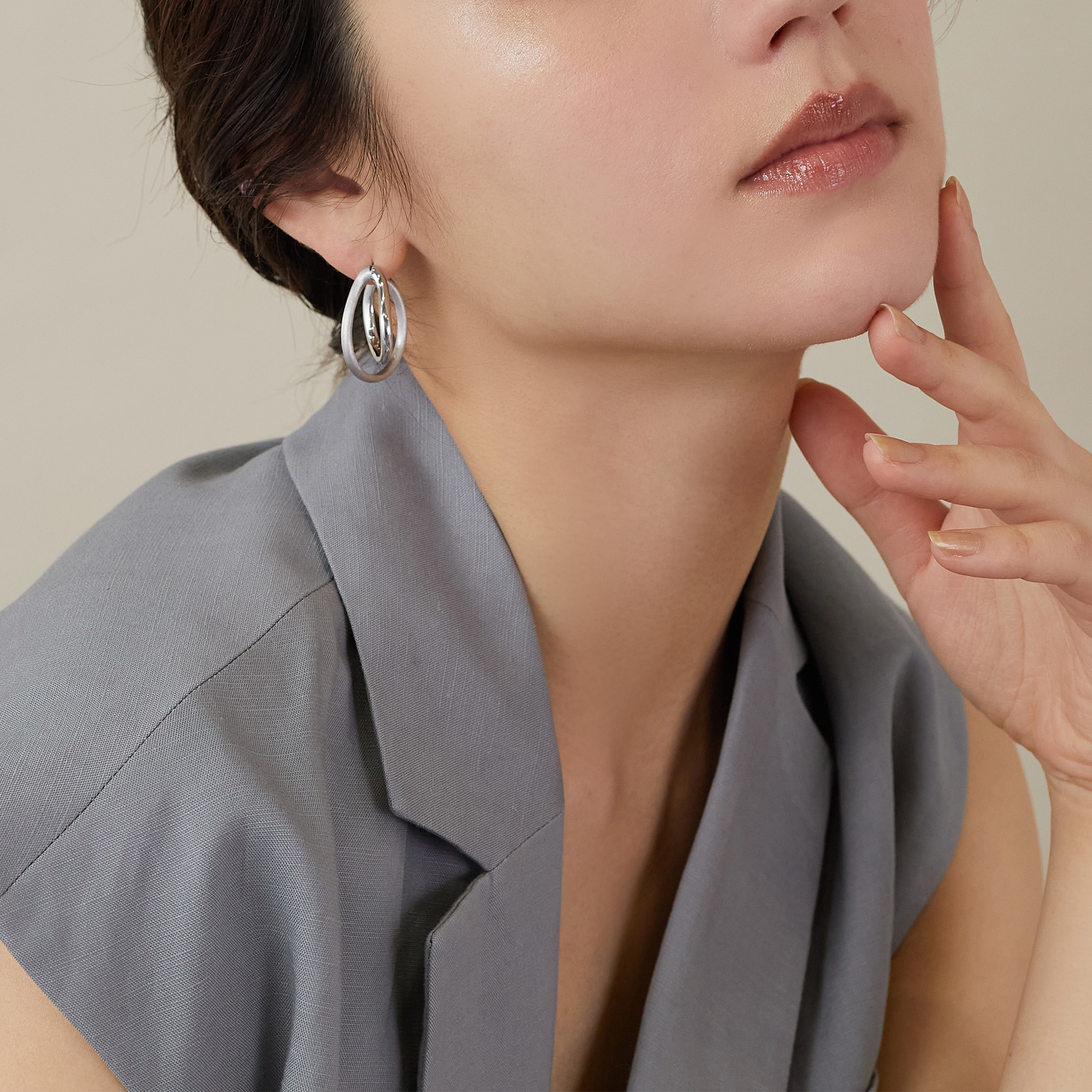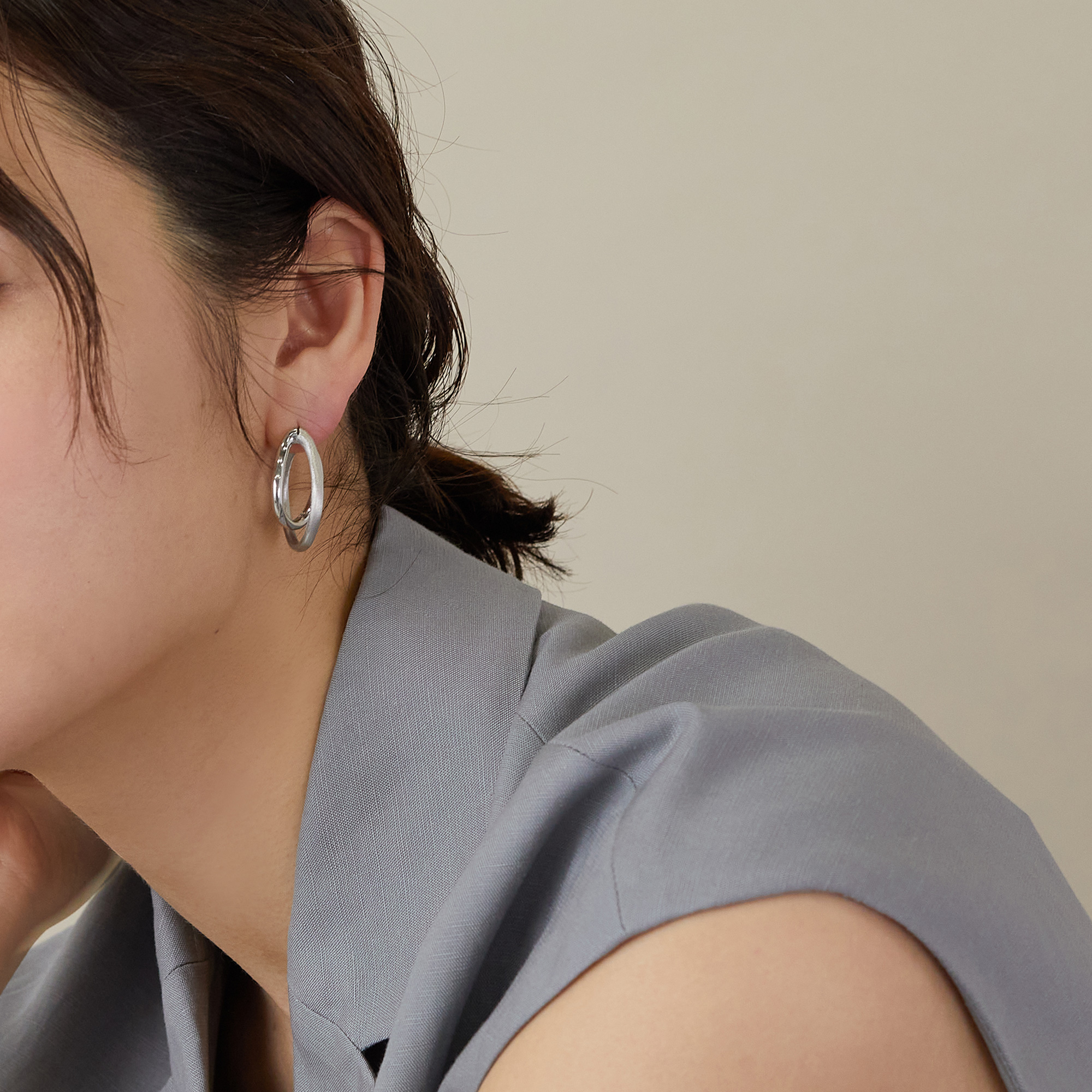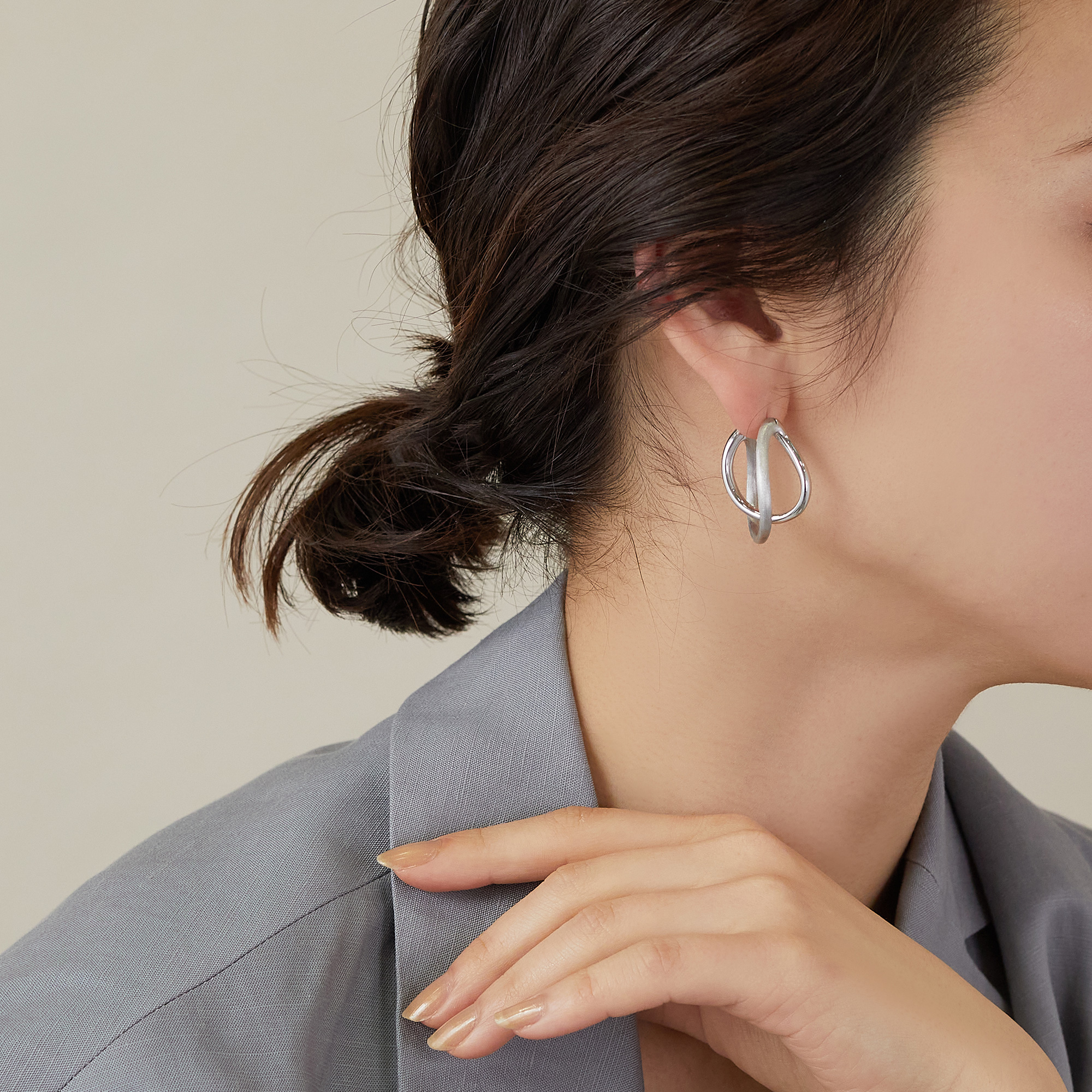 オーガニックなフォルムが魅力のピアス。シャインとマットの異なる仕上げの2本のラインで作られる構築的な造形は、見る角度によって様々な表情を持ちます。ボリュームがありながらも軽やかな印象のデザインで、様々なコーディネートに合わせてお使いいただけるアイテム。耳元をスタイリッシュにアップデートします。