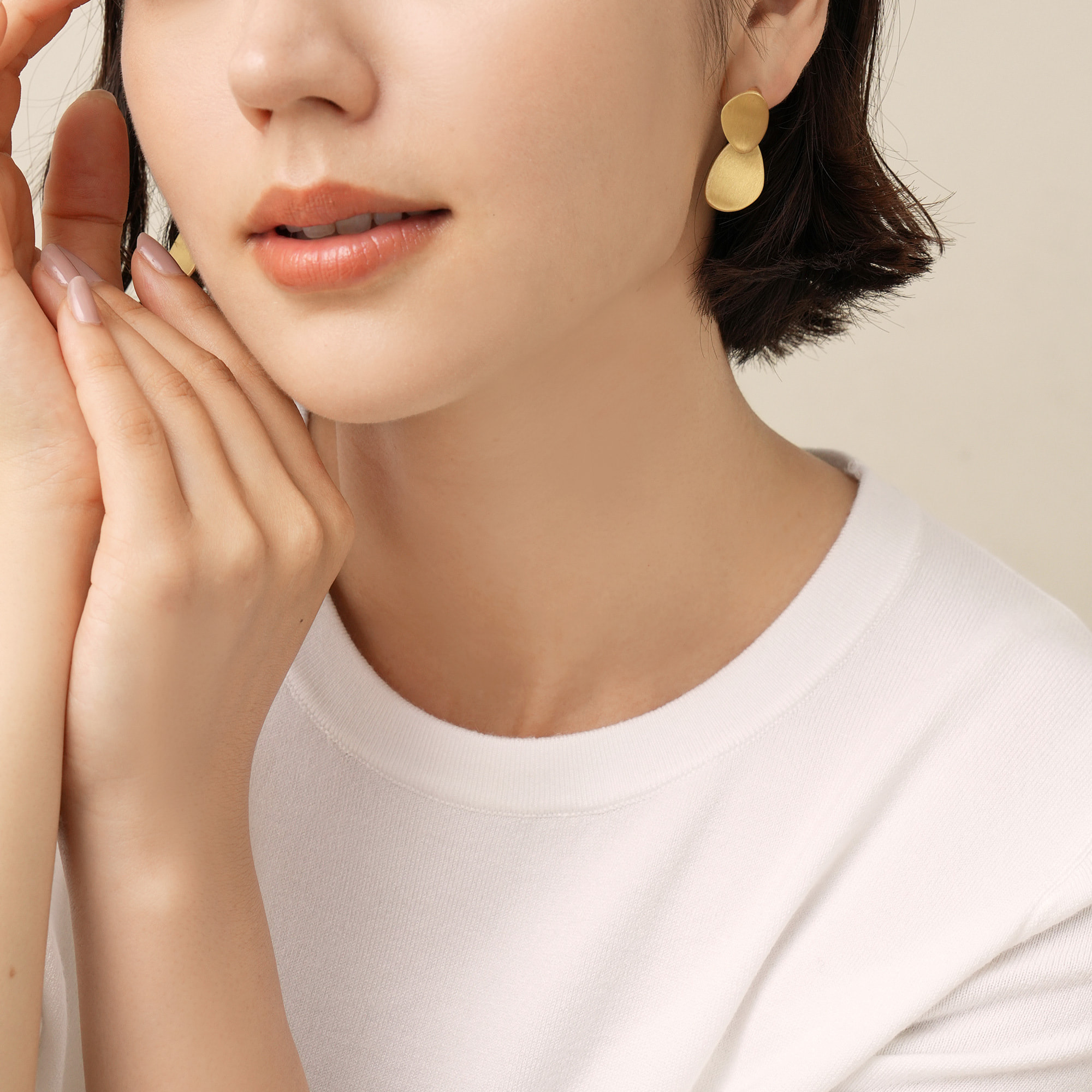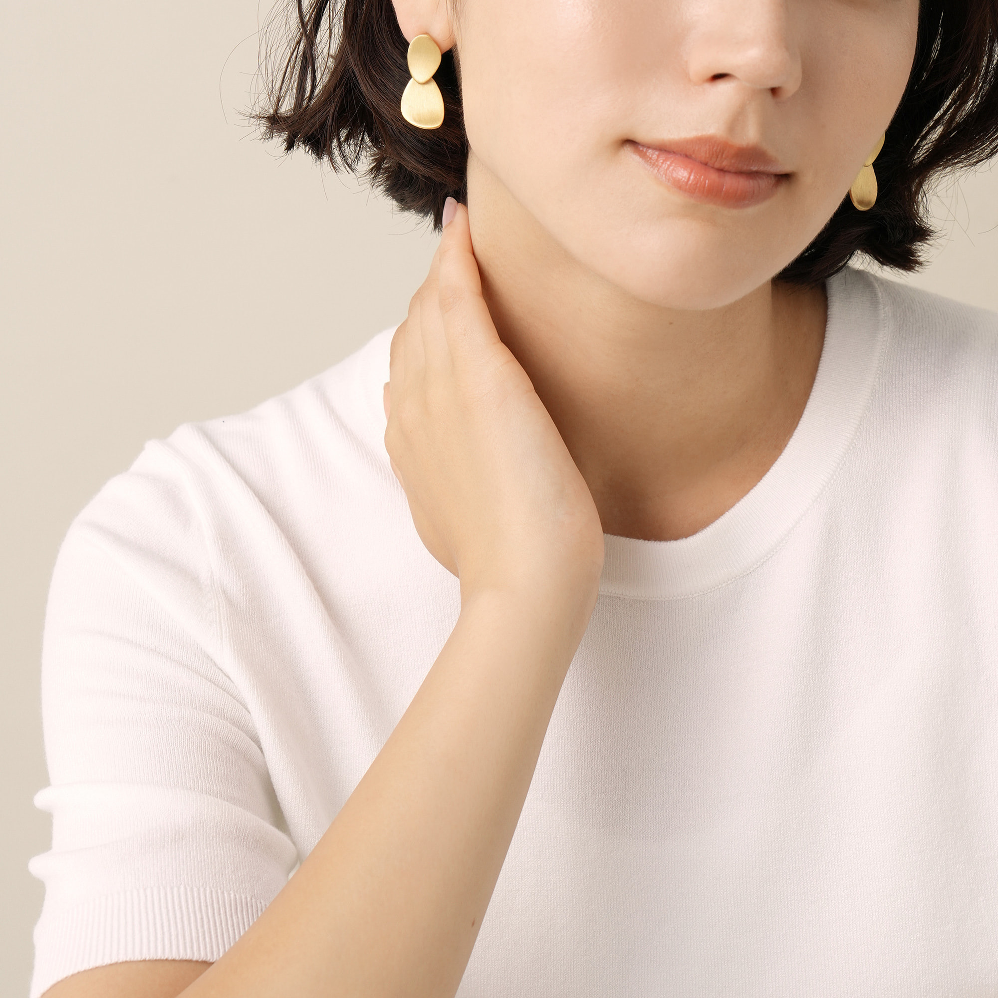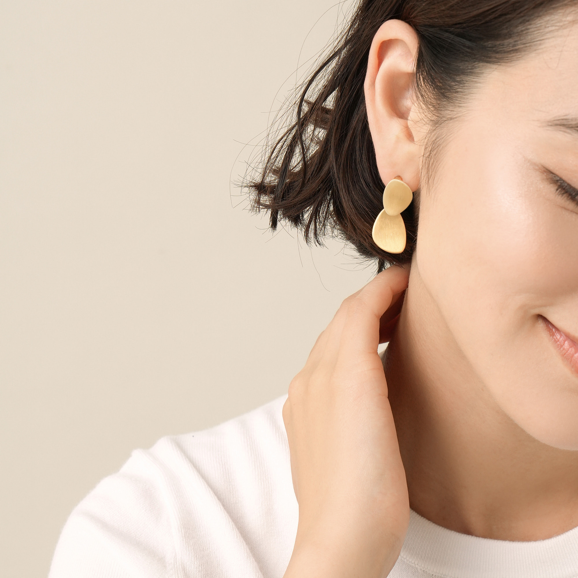 アシンメトリーのモダンなフォルムが魅力のピアス。柔らかなゴールドカラーにニュアンスあるマットの仕上げがマッチ。スタイリッシュなフォルムに、繊細なマットの輝きがほどよいエレガンスをプラスし、雰囲気ある耳元を演出します。ボリュームがありながらも軽やかな印象のデザインで、様々なコーディネートに合わせてお使いいただけるアイテムです。