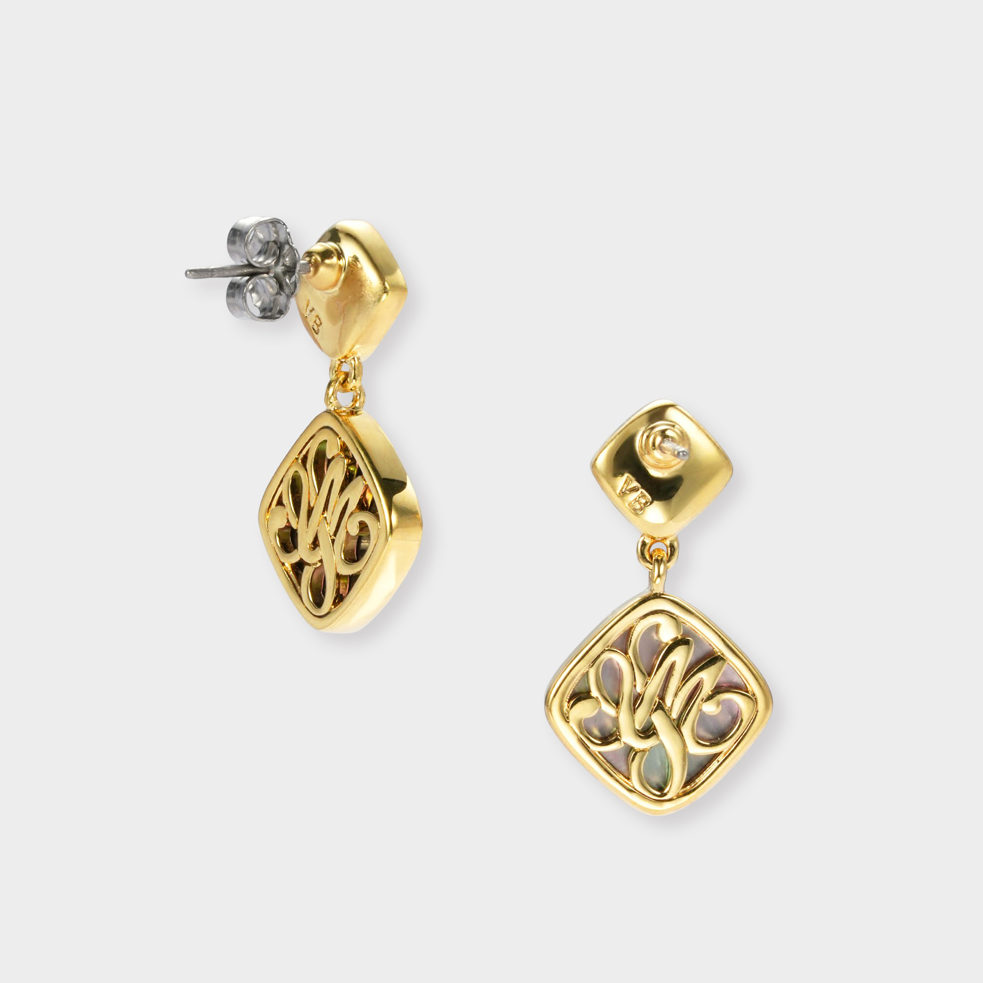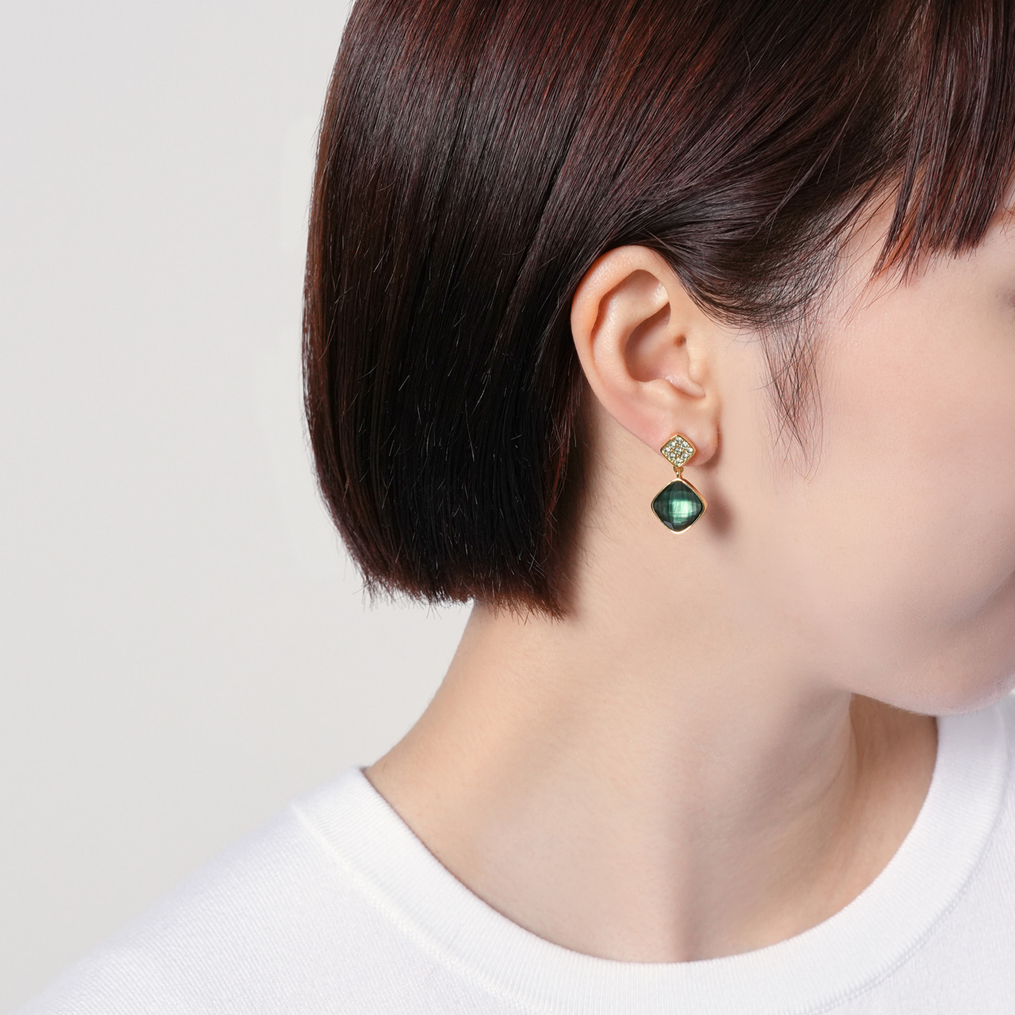 クッションカットのダブレットストーンの神秘的で奥行きのある輝きが印象的なピアス。