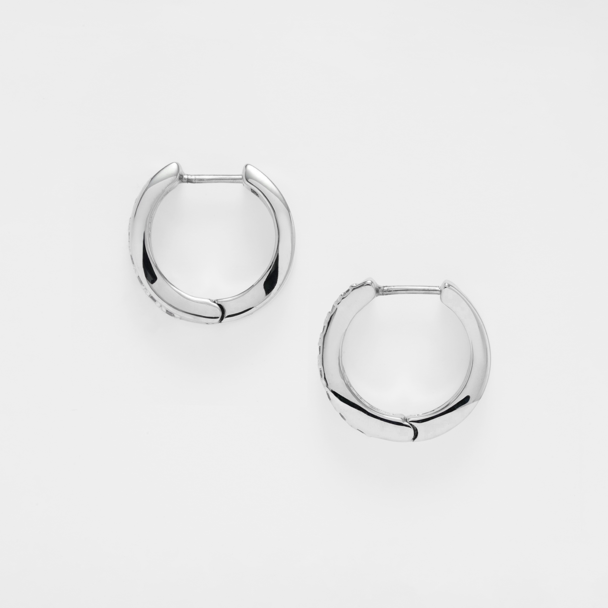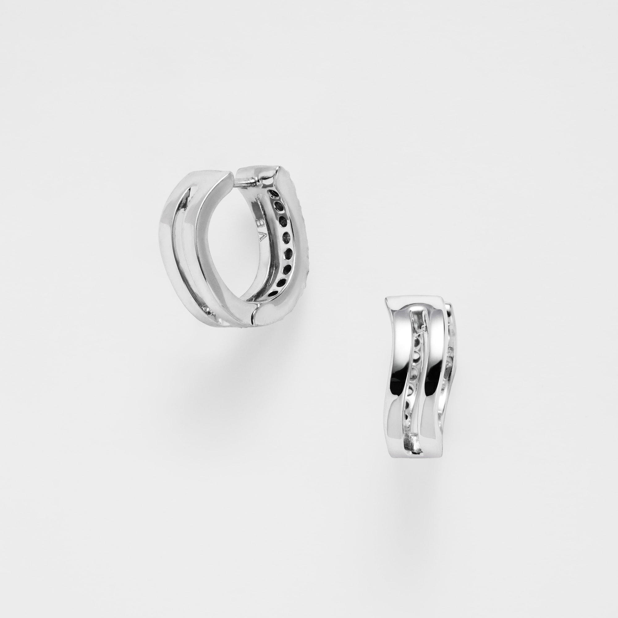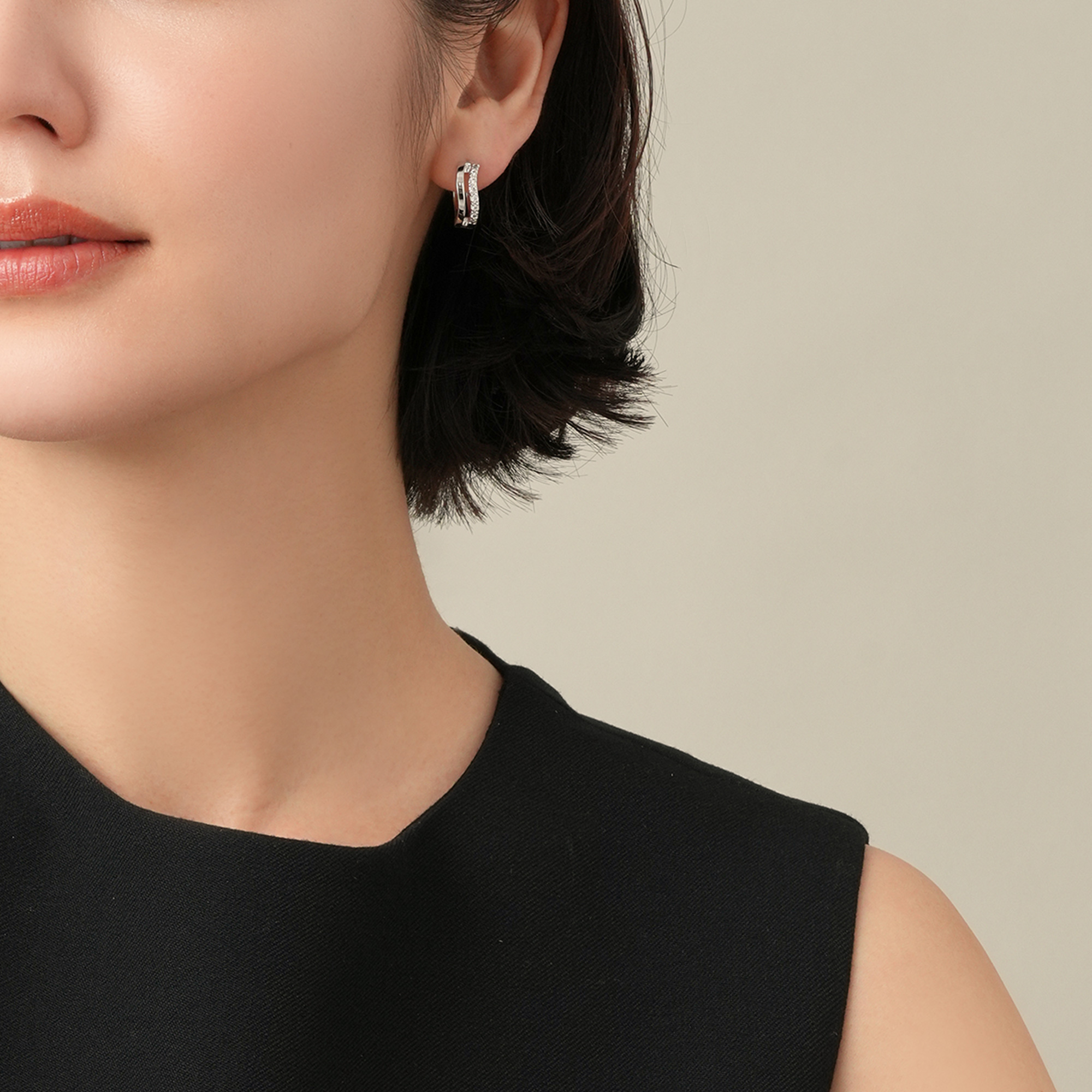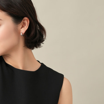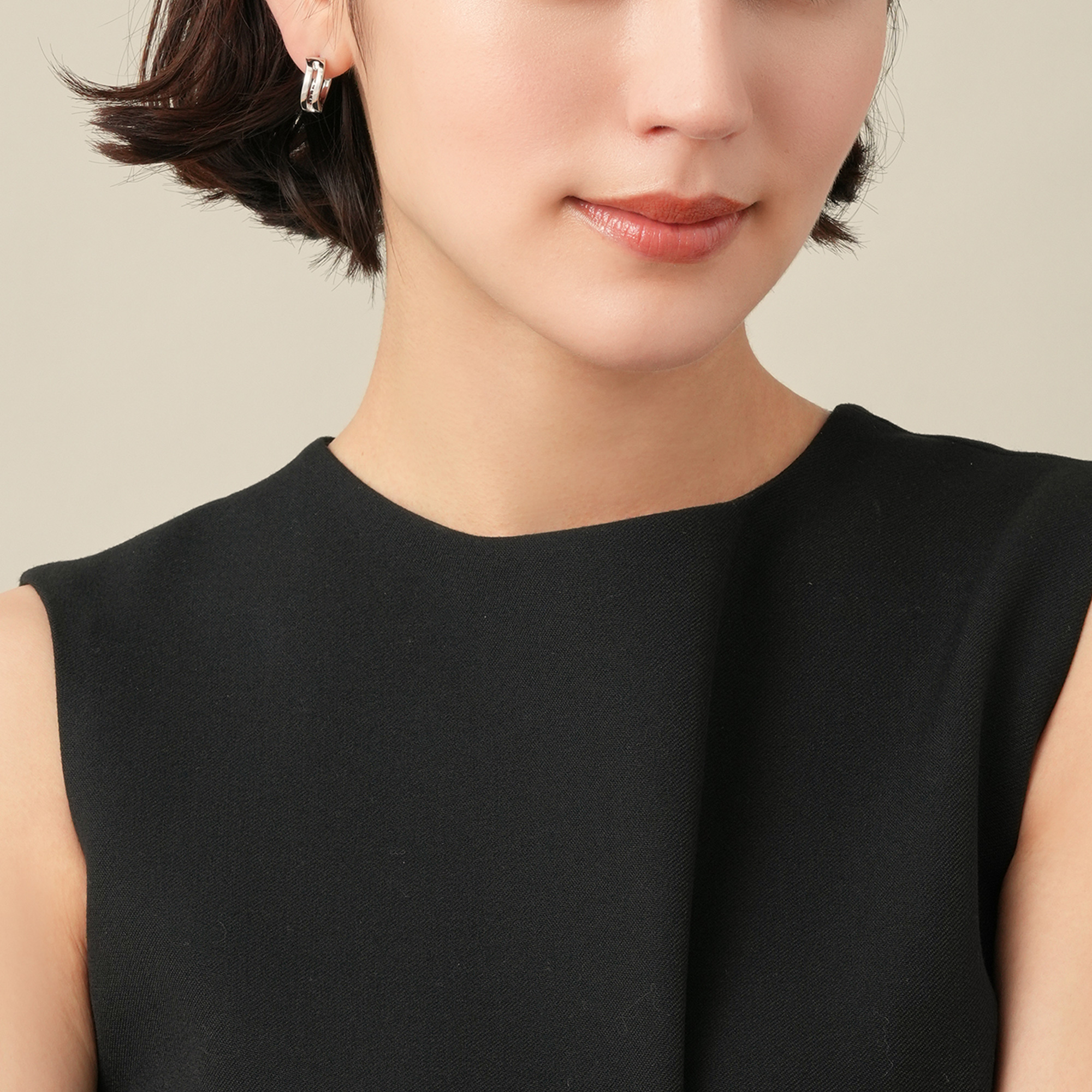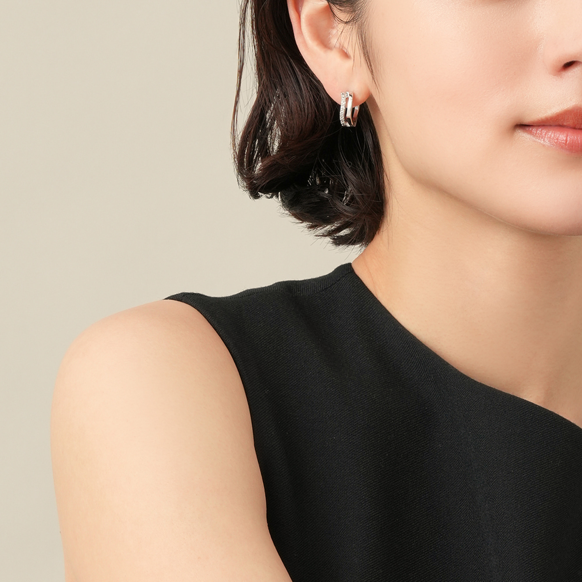 ジュエリーライクなサイズ感が魅力のフープピアス。キャッチが一体化しているので、カチッと留めるだけで引っかかりにくい仕様です。つややかなメタルとキュービックジルコニアの輝くラインが、上品な華やかさを演出。流れる2本のラインがエレガントなデザインです。スタイルを選ばず幅広いシーンでお使いいただけます。