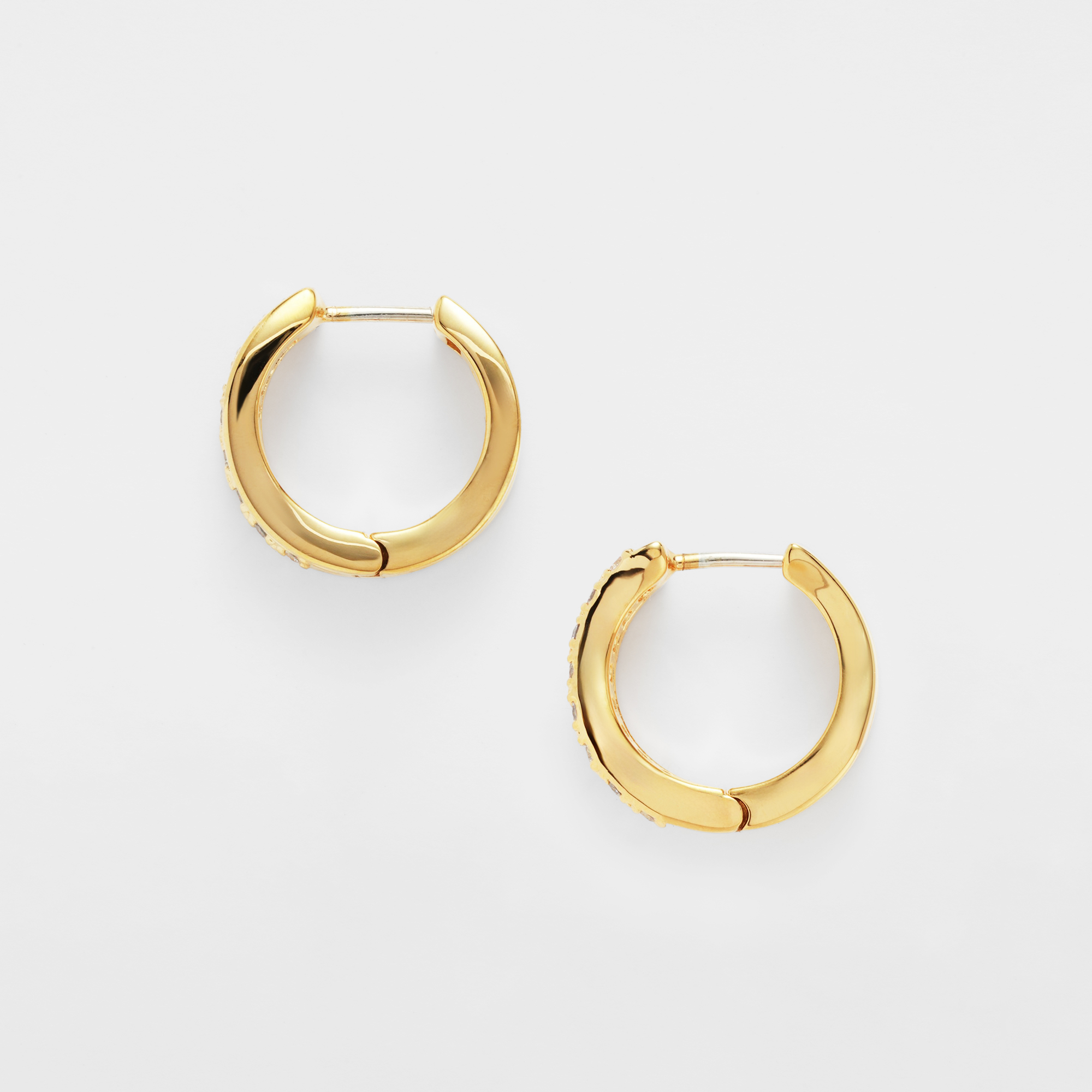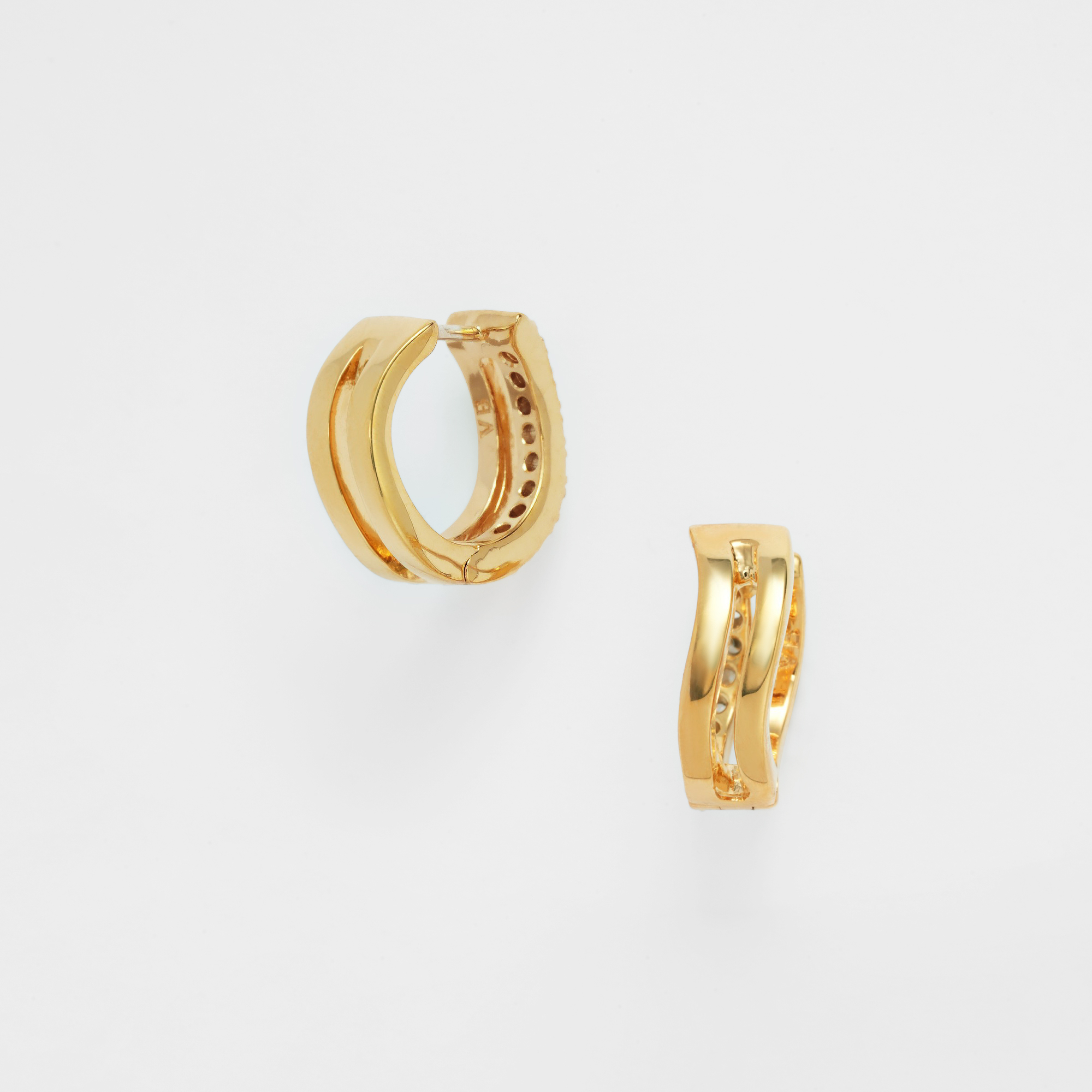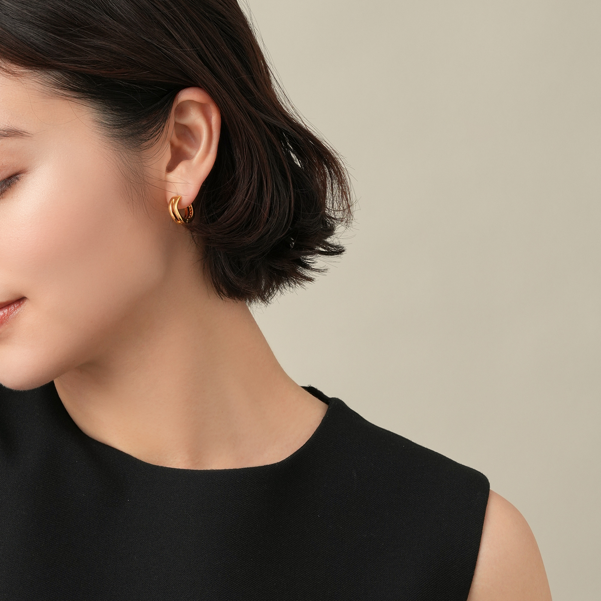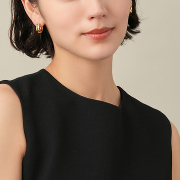 ジュエリーライクなサイズ感が魅力のフープピアス。キャッチが一体化しているので、カチッと留めるだけで引っかかりにくい仕様です。つややかなメタルとキュービックジルコニアの輝くラインが、上品な華やかさを演出。流れる2本のラインがエレガントなデザインです。スタイルを選ばず幅広いシーンでお使いいただけます。