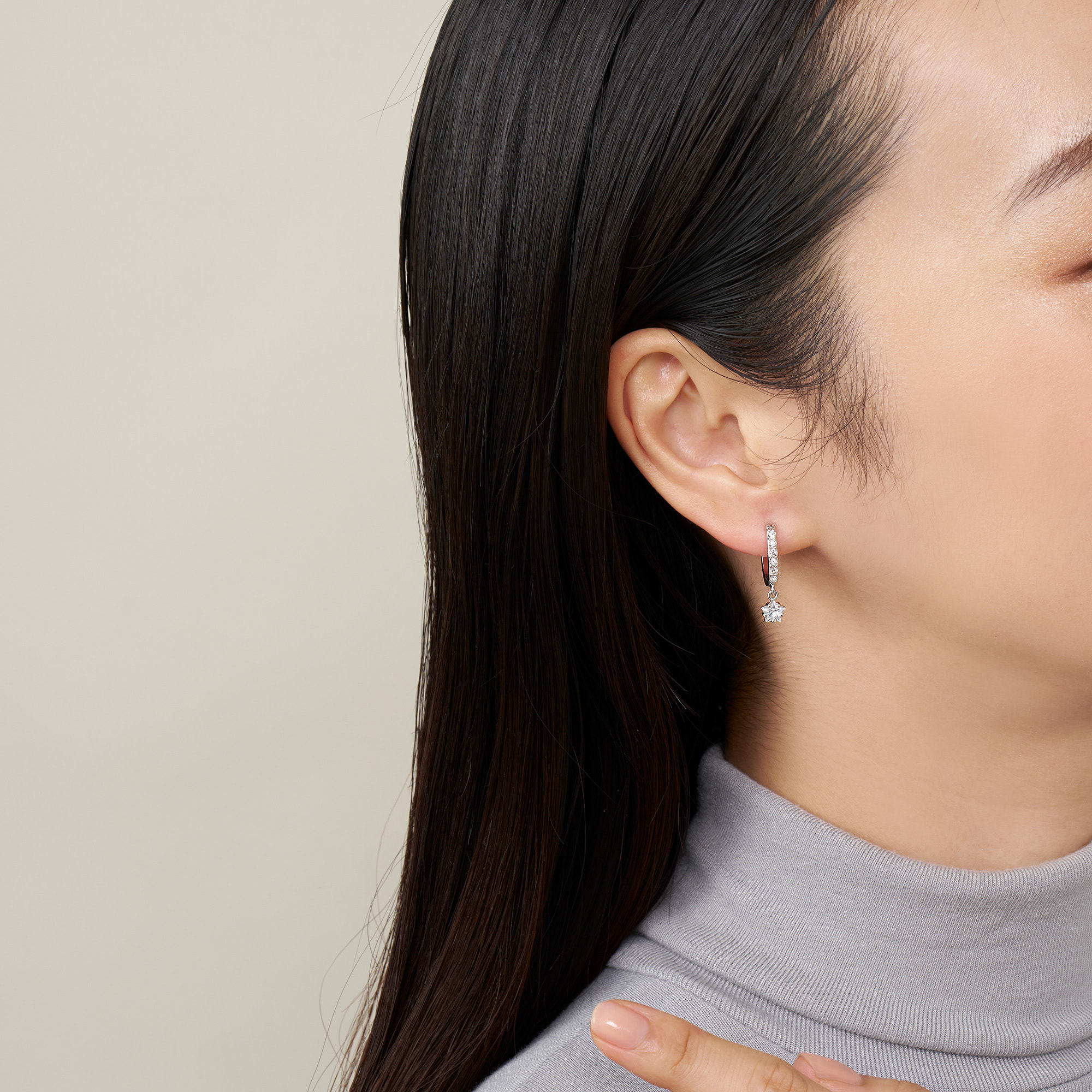控えめサイズながら、ひときわ目をひく華やかな輝きを纏う星はキュービックジルコニア。虹色の硬質な輝きが、夜空を彩る星のように、耳元をロマンティックに演出します。