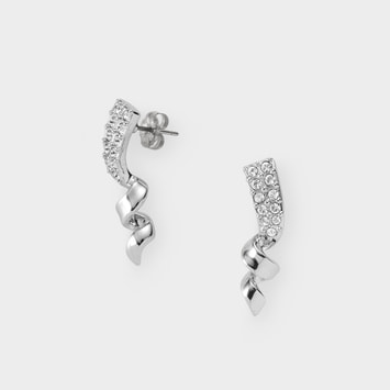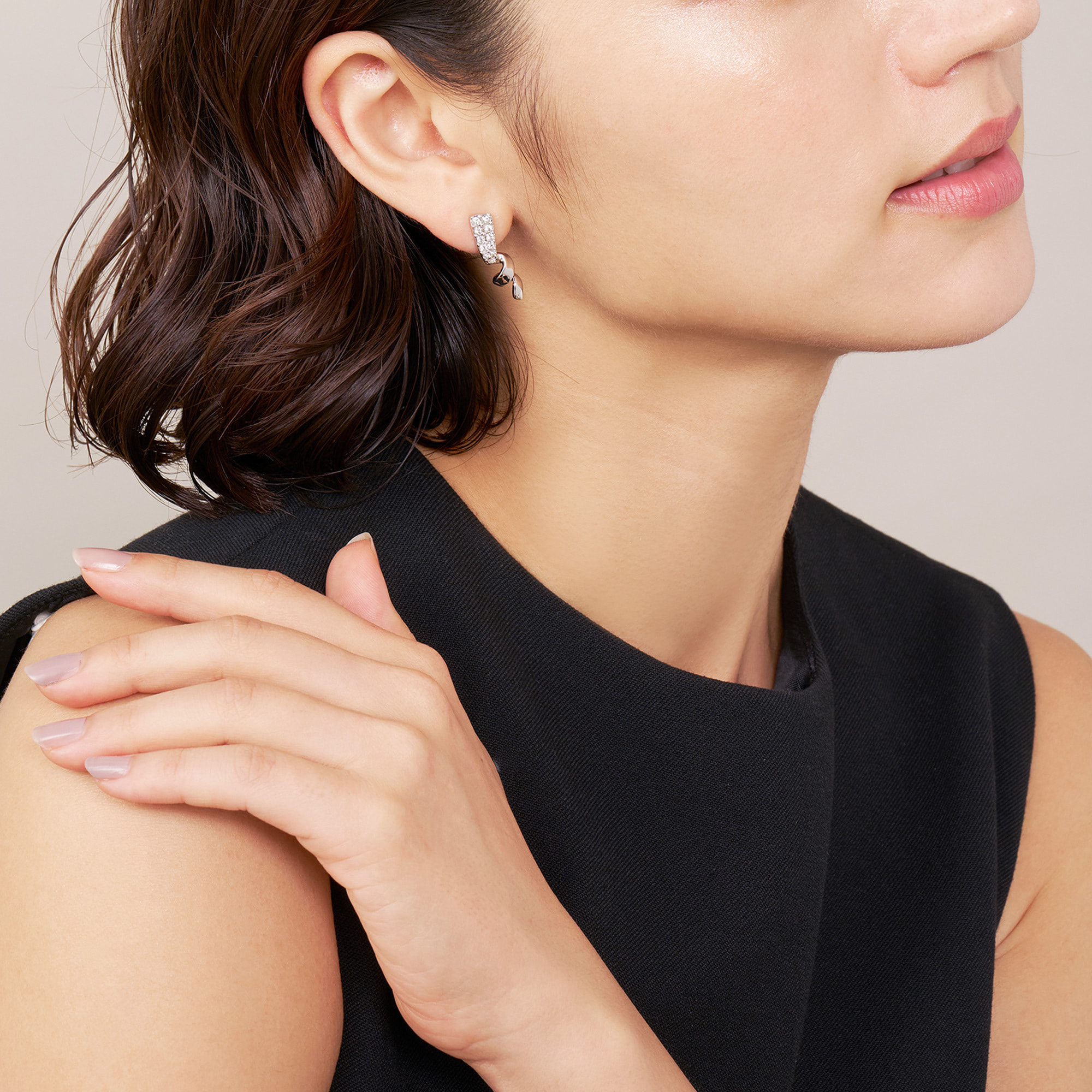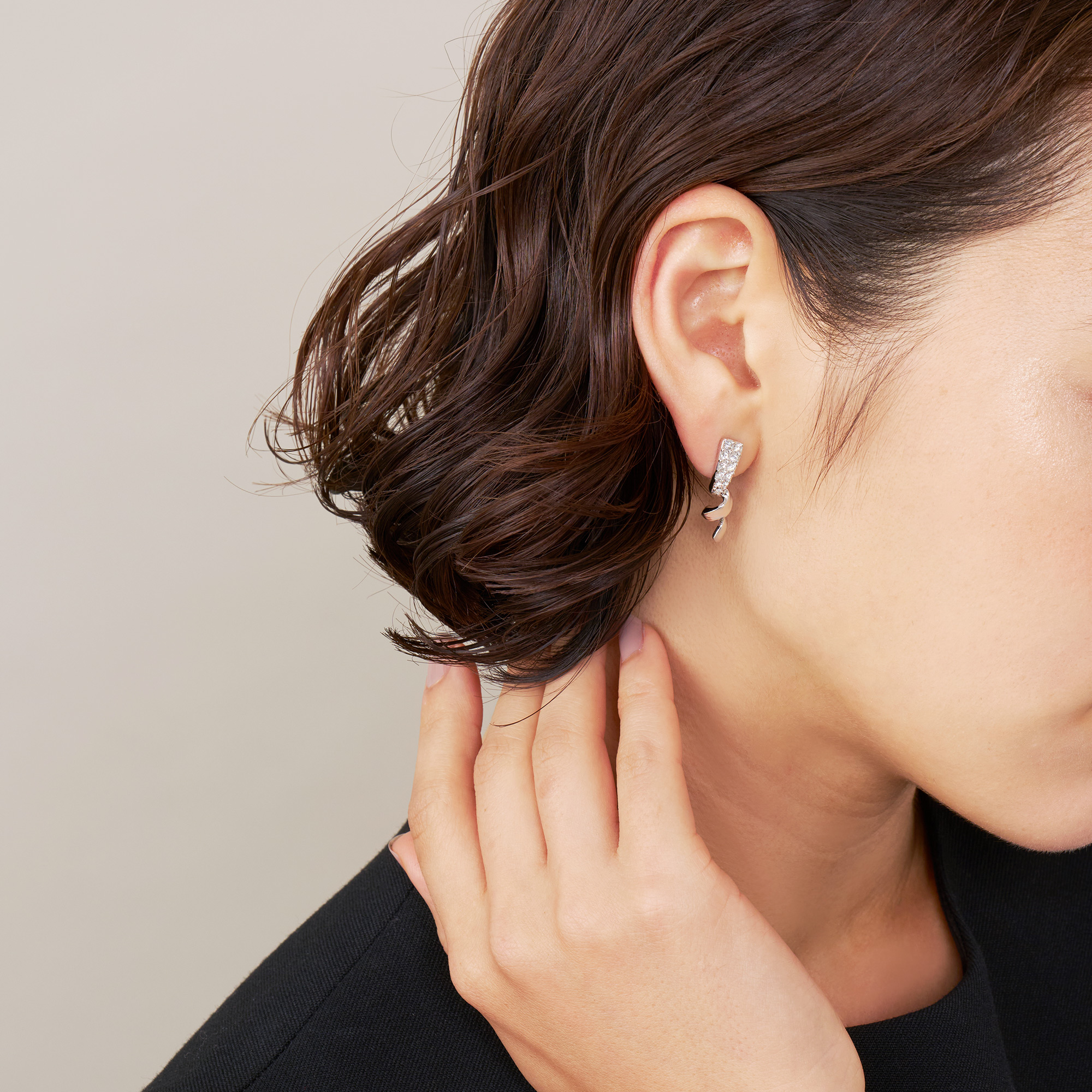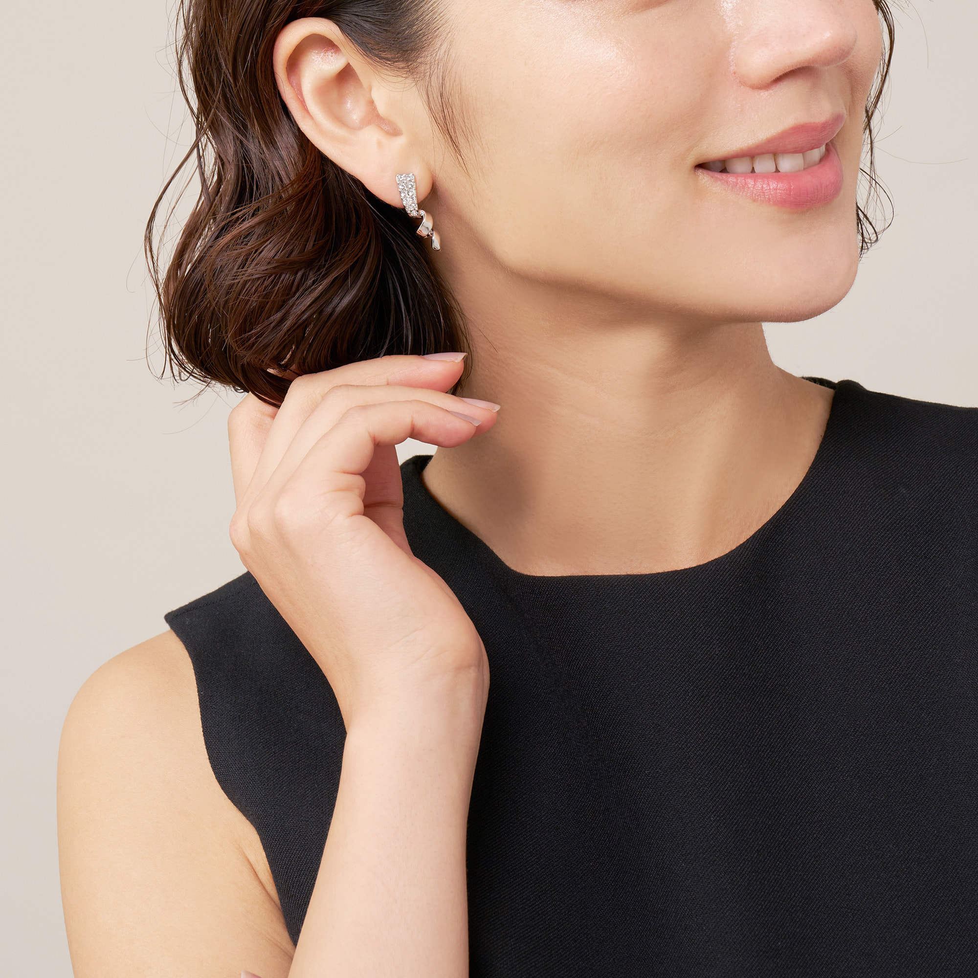 しなやかならせんを描くリボンをモチーフにしたピアス。動きのあるアイコニックなフォルムが魅力です。ちりばめられた小さなカットガラスが、繊細ながら華やかな輝きを添えます。デイリーからドレスアップまで、様々なシーンをスタイリッシュに演出するアイテムです。
