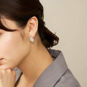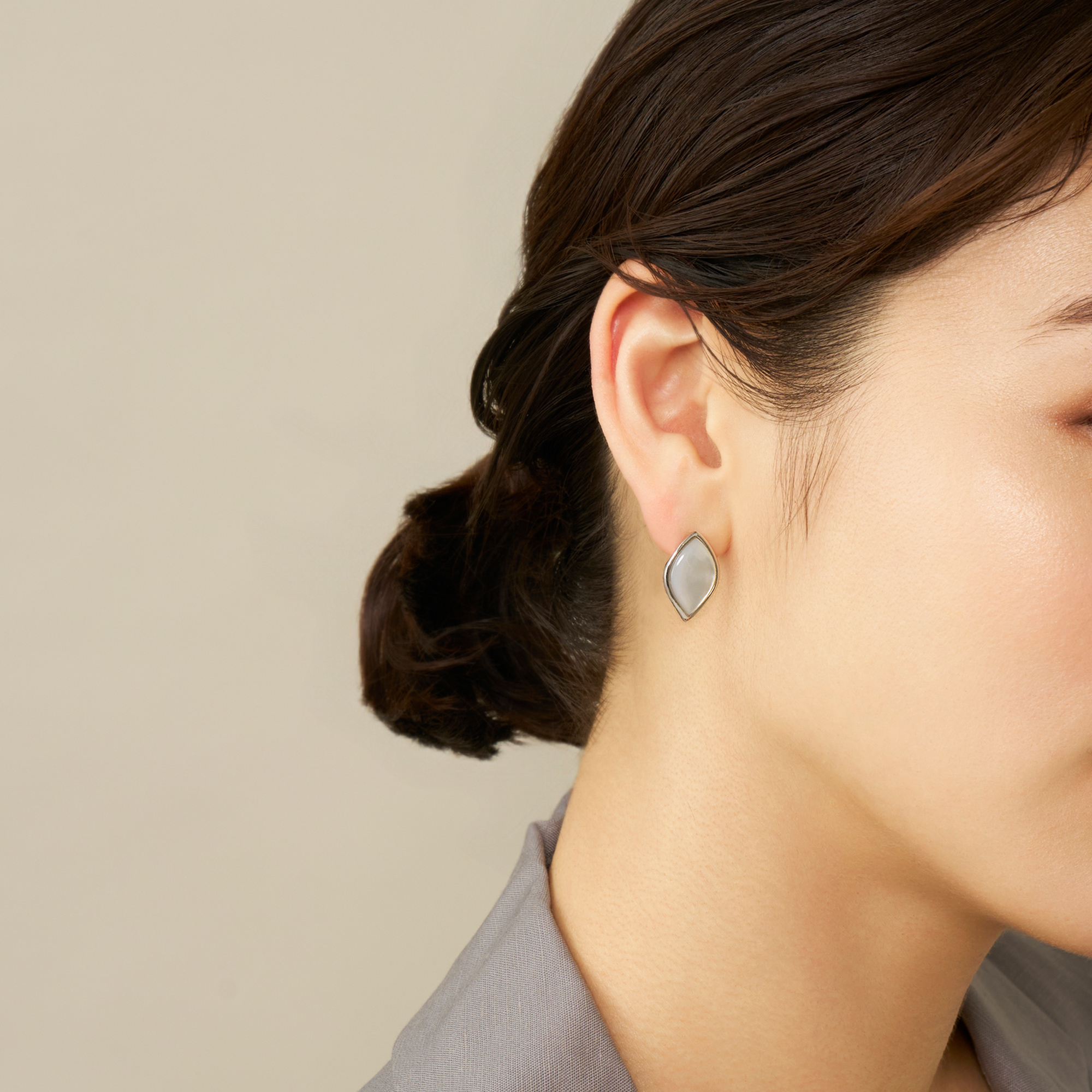 メタルのシャープな光沢と、白蝶貝のゆらめく虹彩が美しく溶け合うピアス。