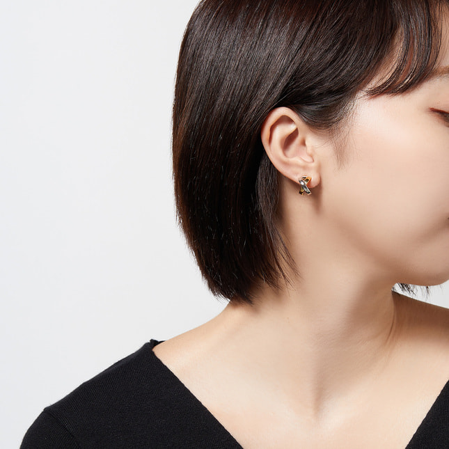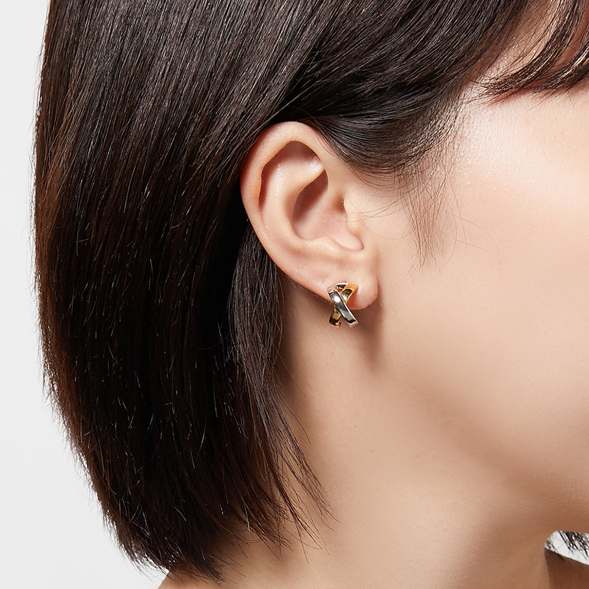 ウェービーなラインがクロスした軽やかなピアス。コーディネートしやすいゴールド色・シルバー色のコンビカラーです。つややかな質感のメタルは高級感溢れ、小さめサイズながらも存在感ある耳元を演出します。