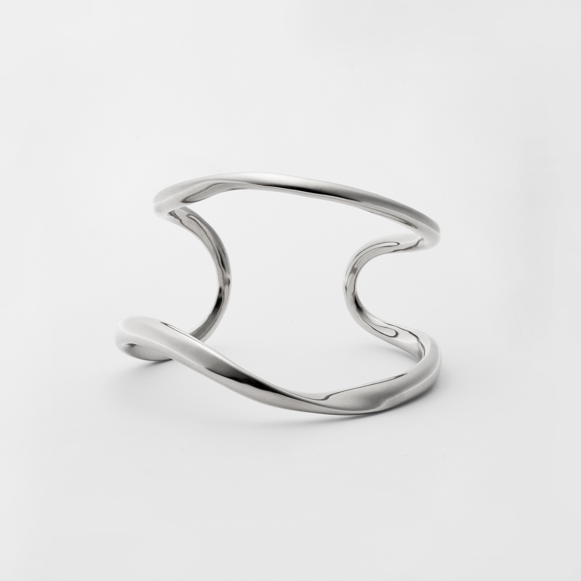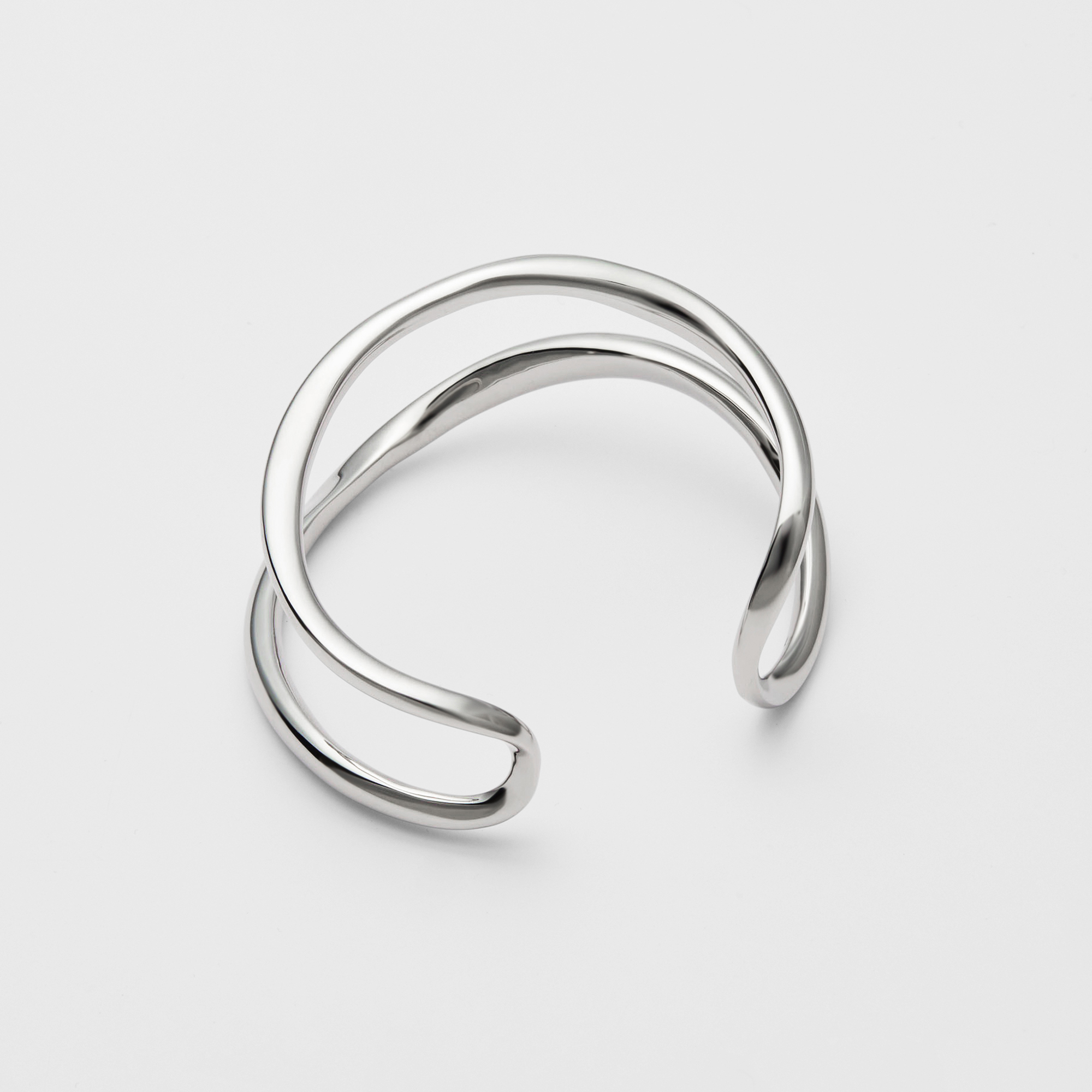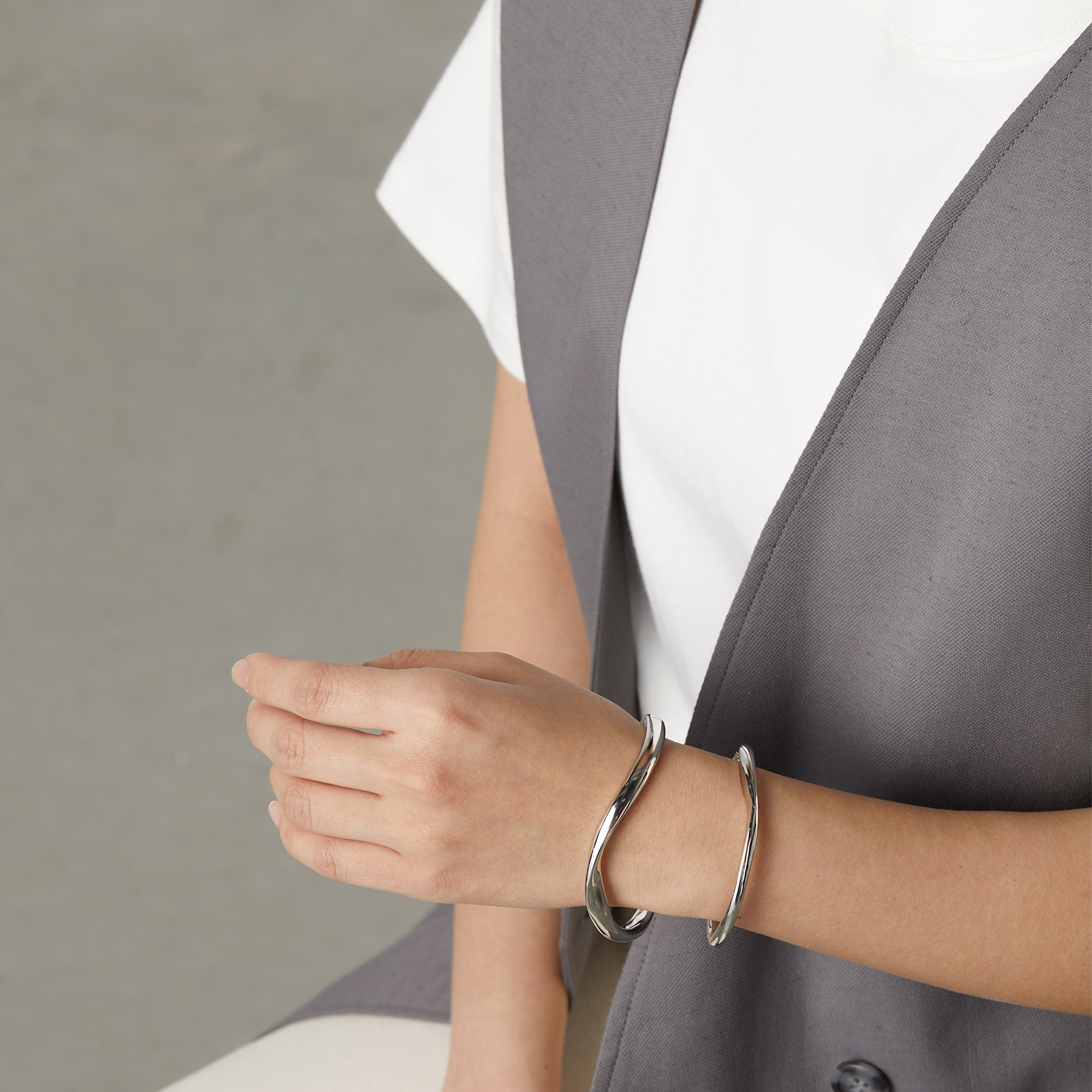 ダブルのラインがモダンなバングル。動きのある立体感を意識した曲線が軽やか。ディティールにまでこだわったデザインは1つ着けるだけでスタイリングにエッジな要素をプラスします。シンプルなデザインだからこそジュエリーライクなつくりの良さがひき立つアイテムです。