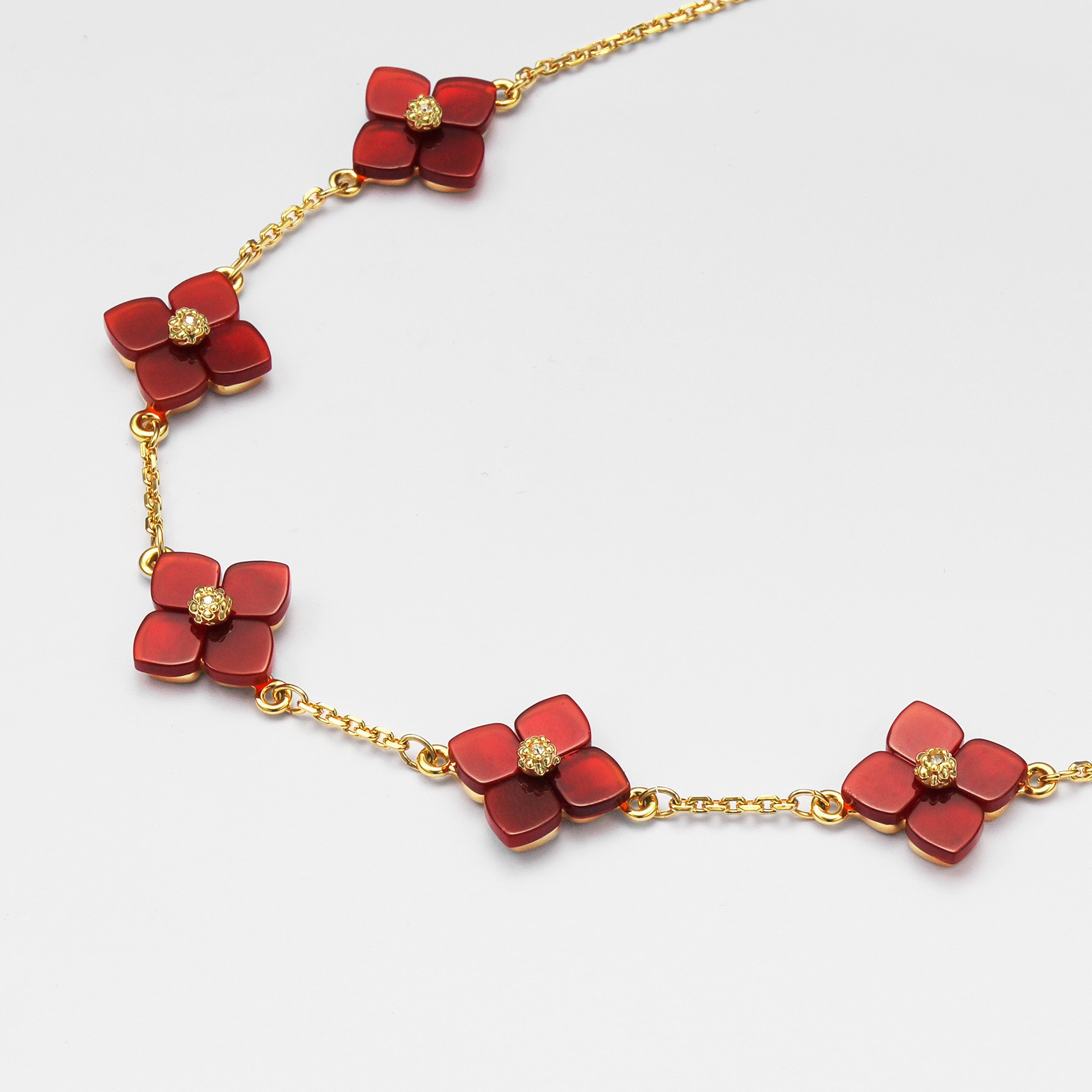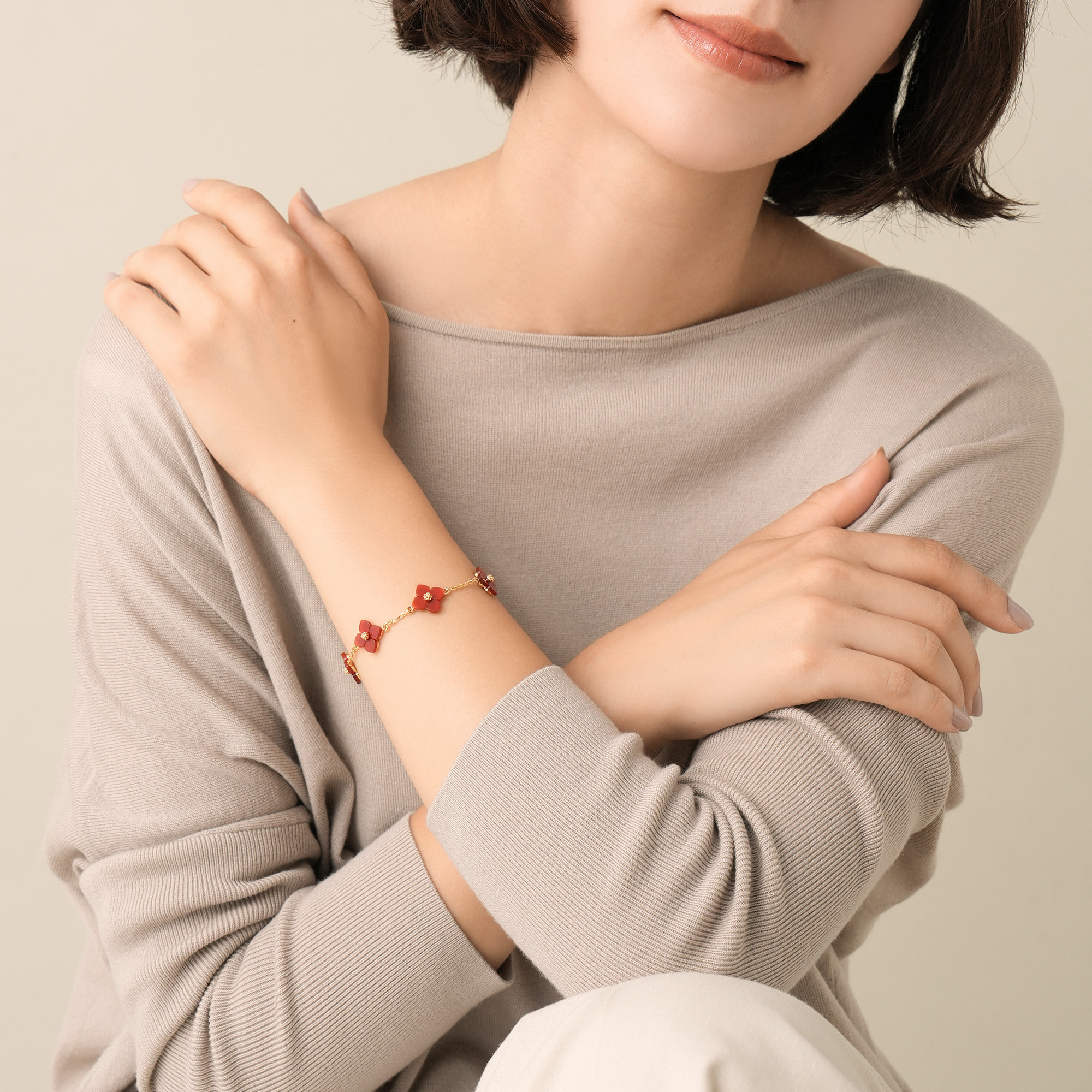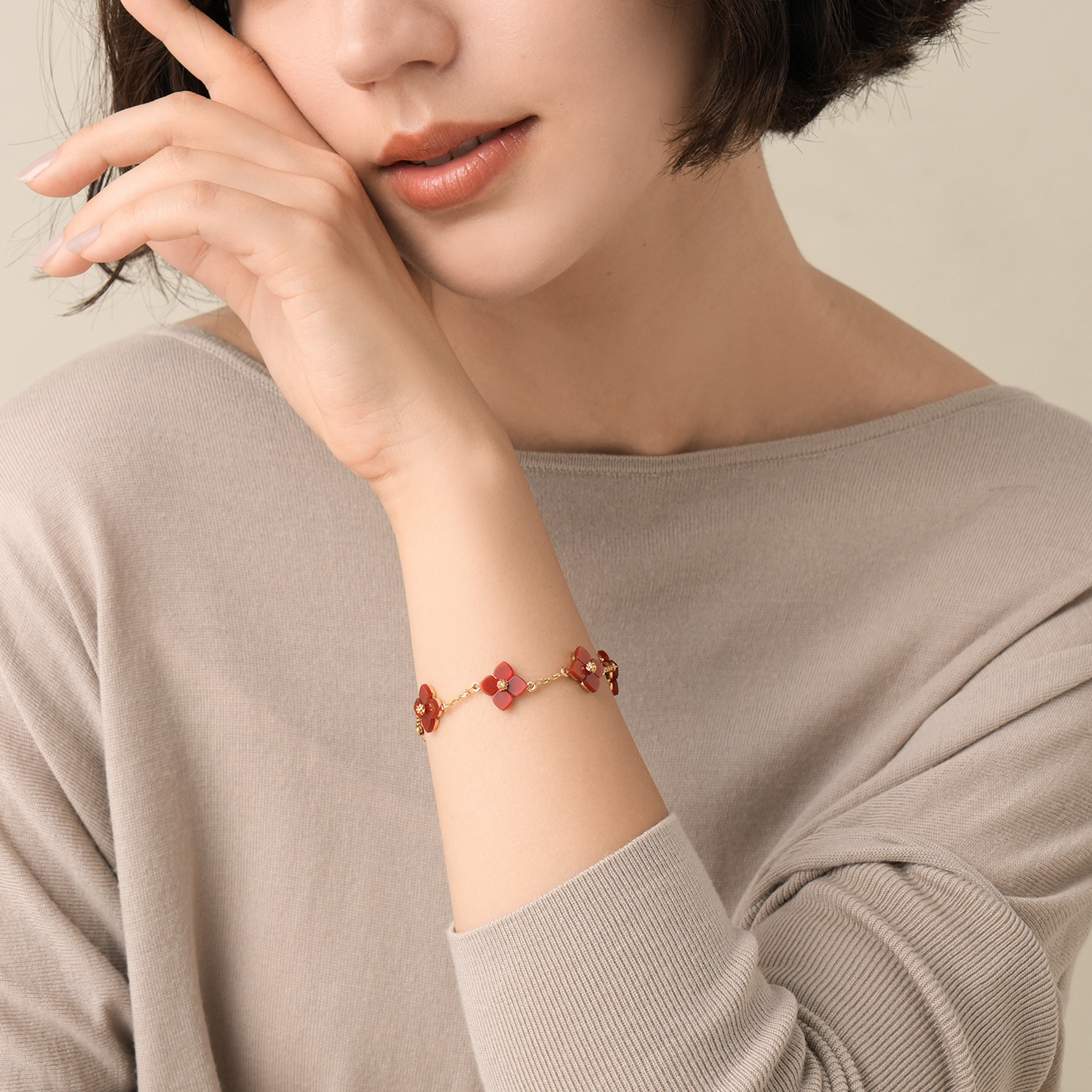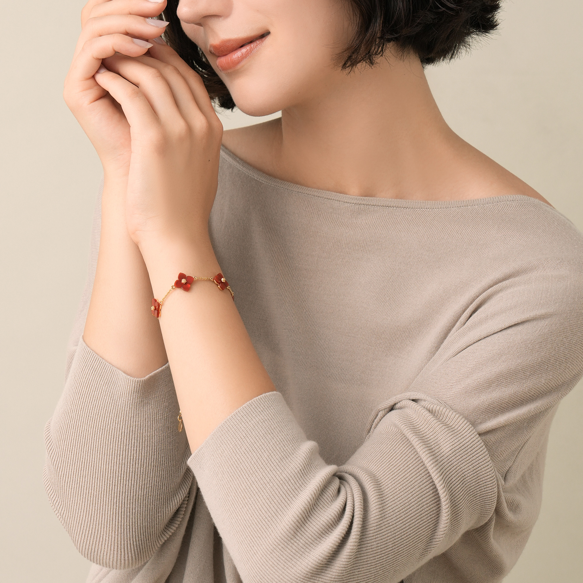 質の良いカーネリアンを1つ1つ丁寧にかたどった可憐な花モチーフのブレスレット。