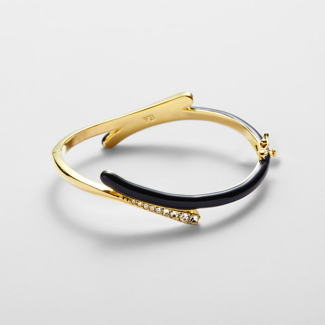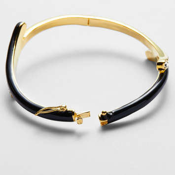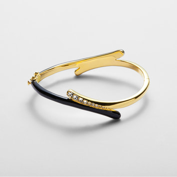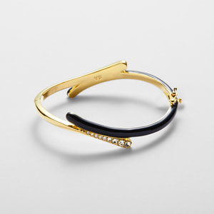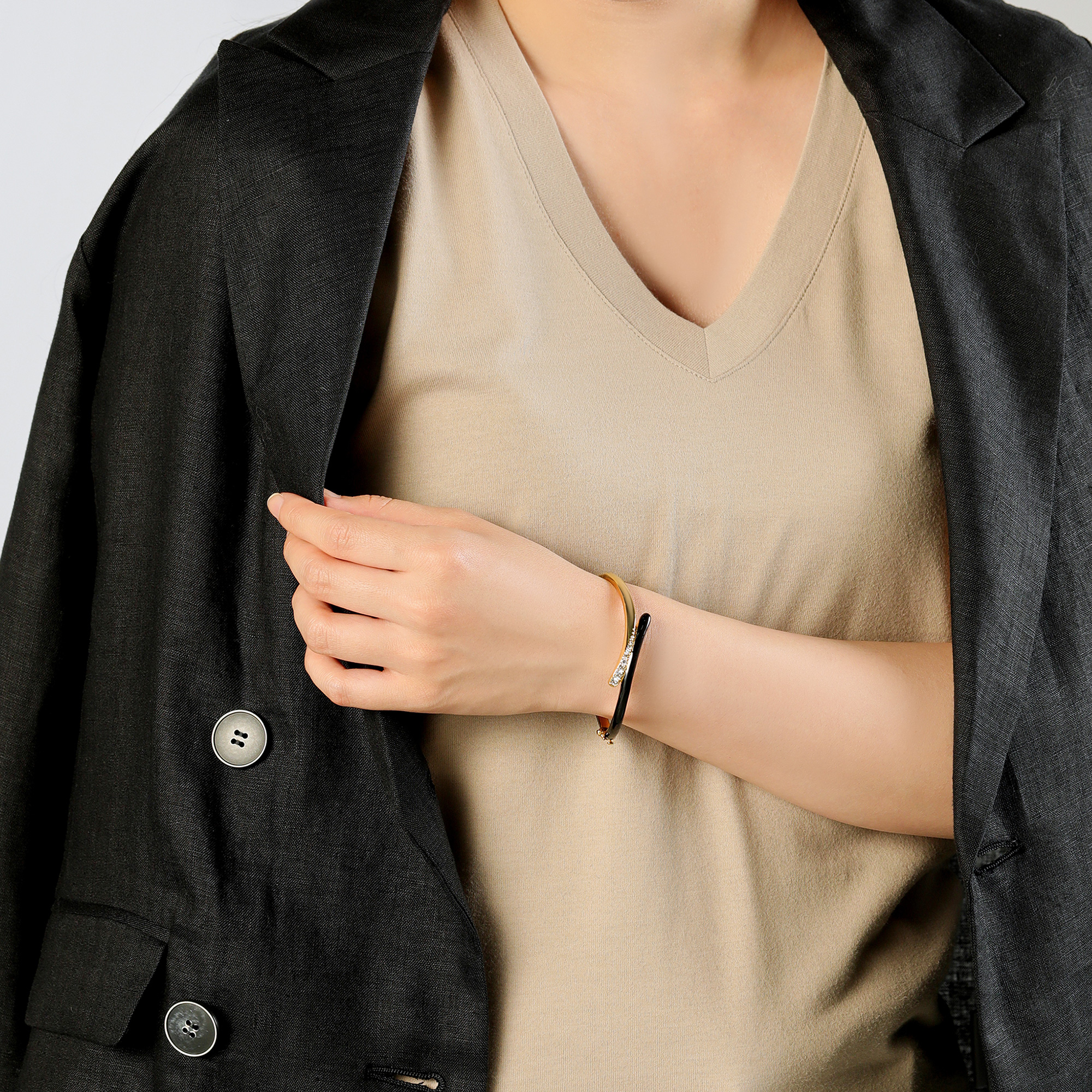 ブラックとゴールドカラーのコントラストが美しいブレスレット。モダンなブラックカラーに、カットガラスの輝きが華やかさをプラス。流れるソフトなカービングが、程よいエレガンスを演出します。毎日の装いをクラスアップしてくれるアイテムです。