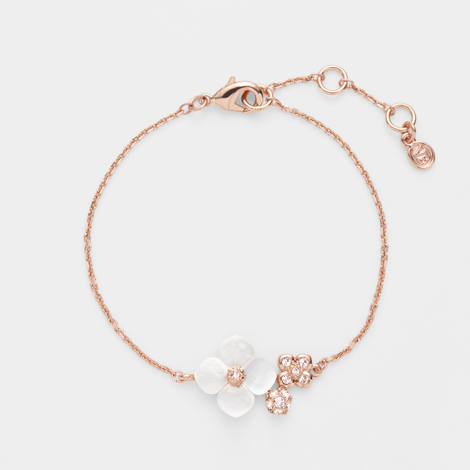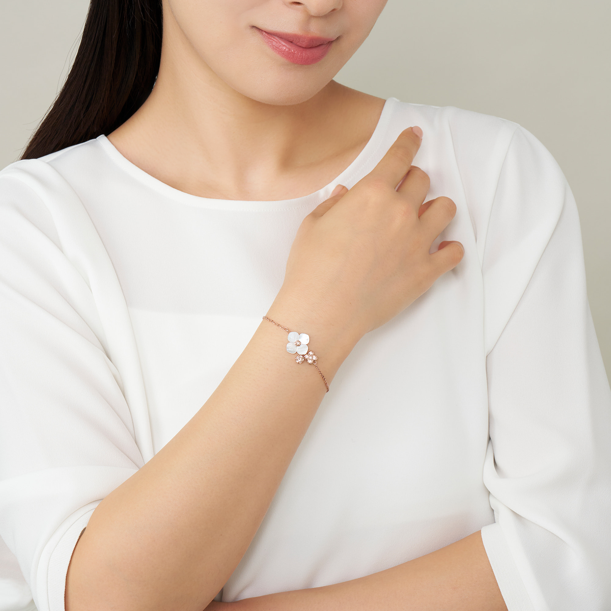 質の良い白蝶貝を1つ1つ丁寧にかたどった、可憐な花のブレスレットです。