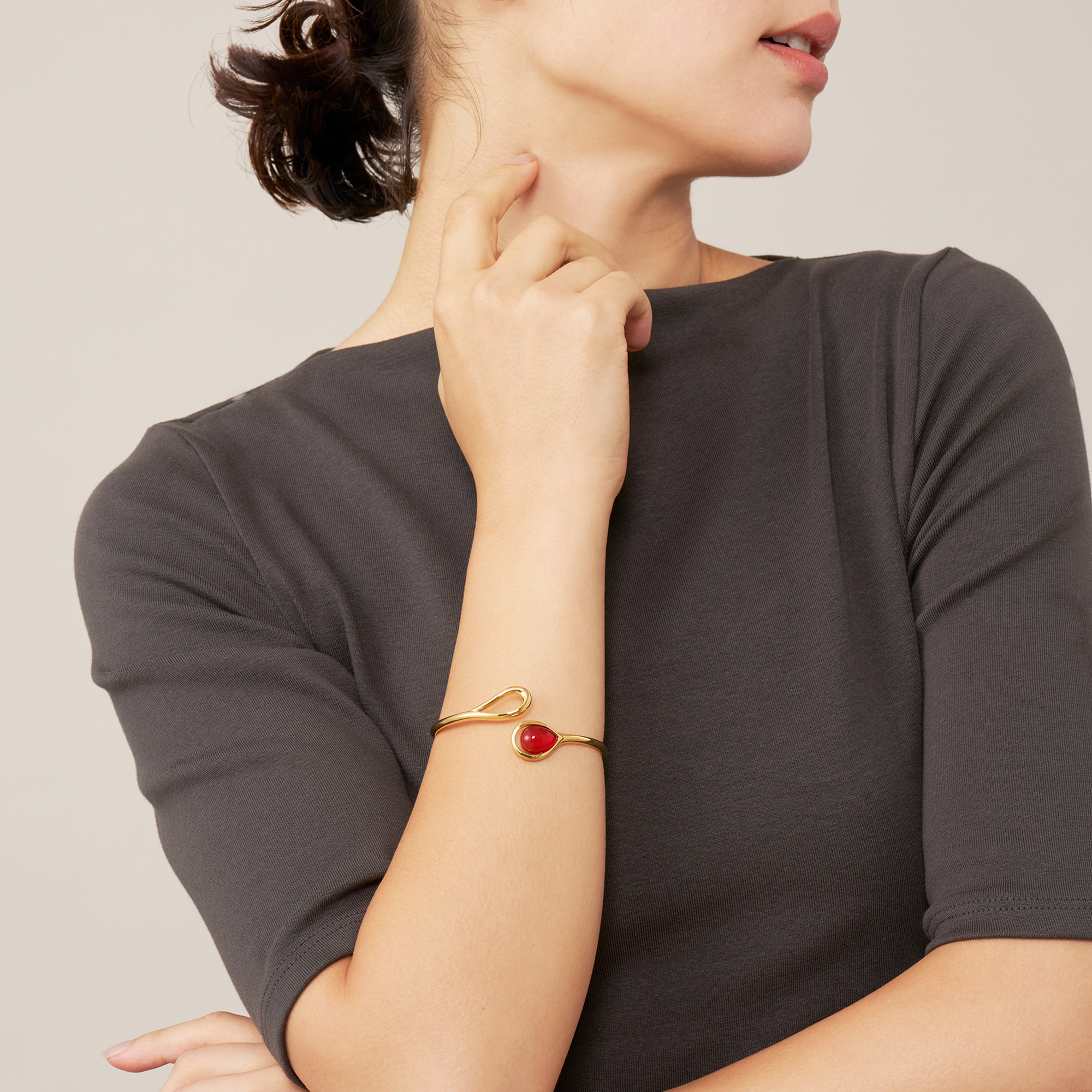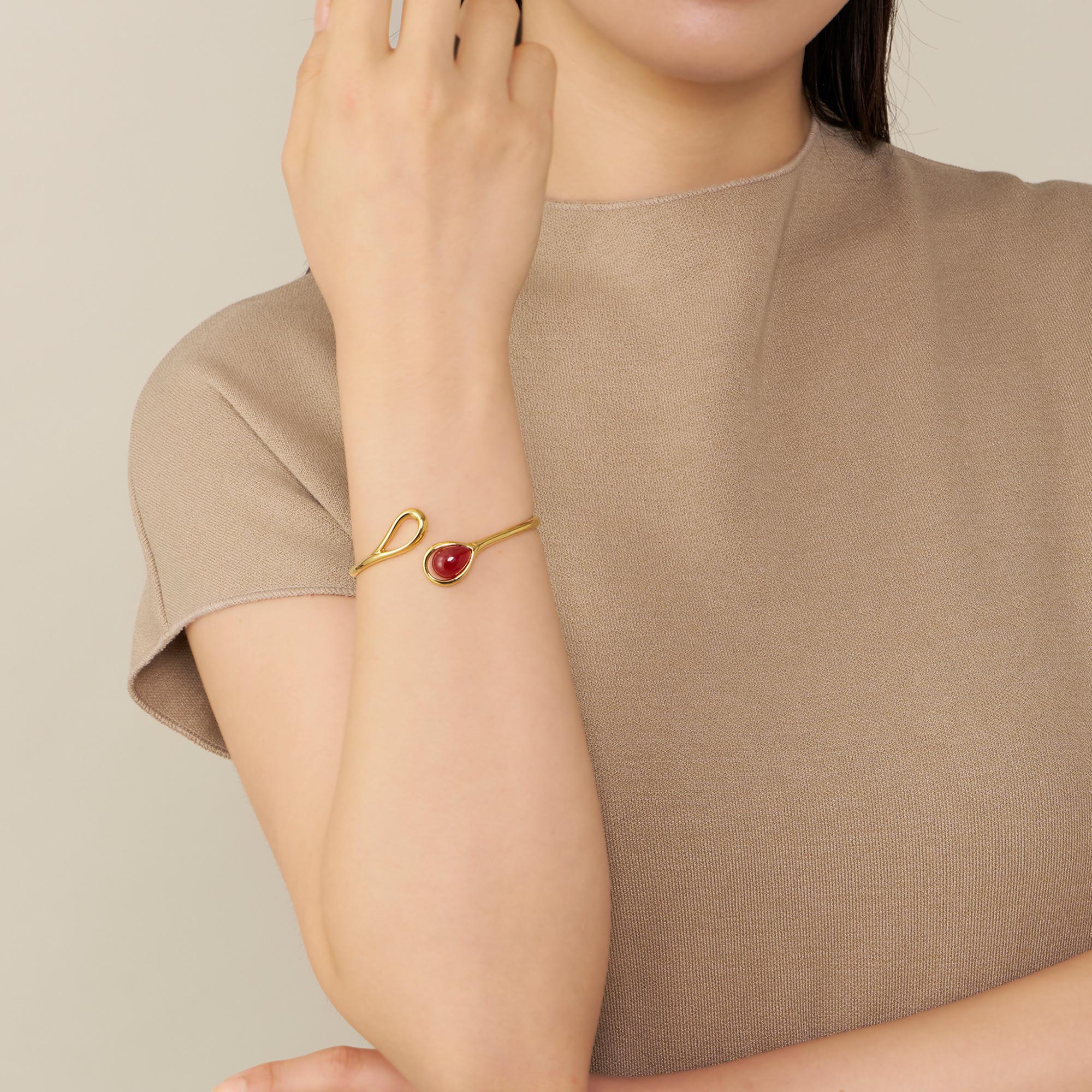 雫が溢れおちるような瑞々しいドロップシェイプと、カーネリアンが醸し出す独特の存在感はスタイリングに程よいアクセントを与えます。