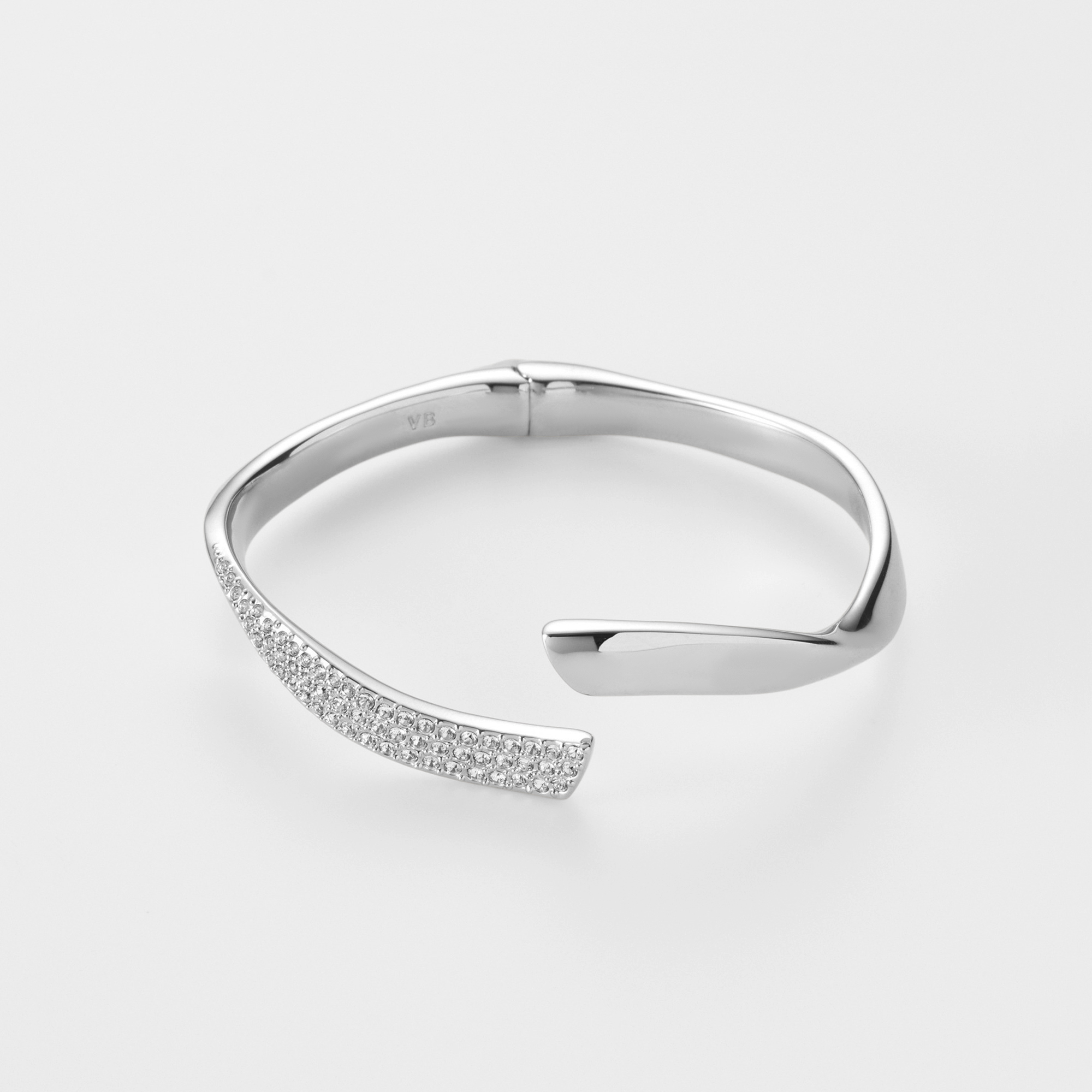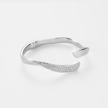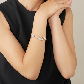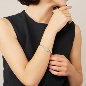 しなやかならせんを描くリボンをモチーフにしたブレスレット。クールな印象のメタリックに、カットガラスが繊細ながら華やかな輝きを添えます。バネ式の仕様で装着しやすいのも魅力。デイリーからドレスアップまで、様々なシーンをスタイリッシュに演出するアイテムです。