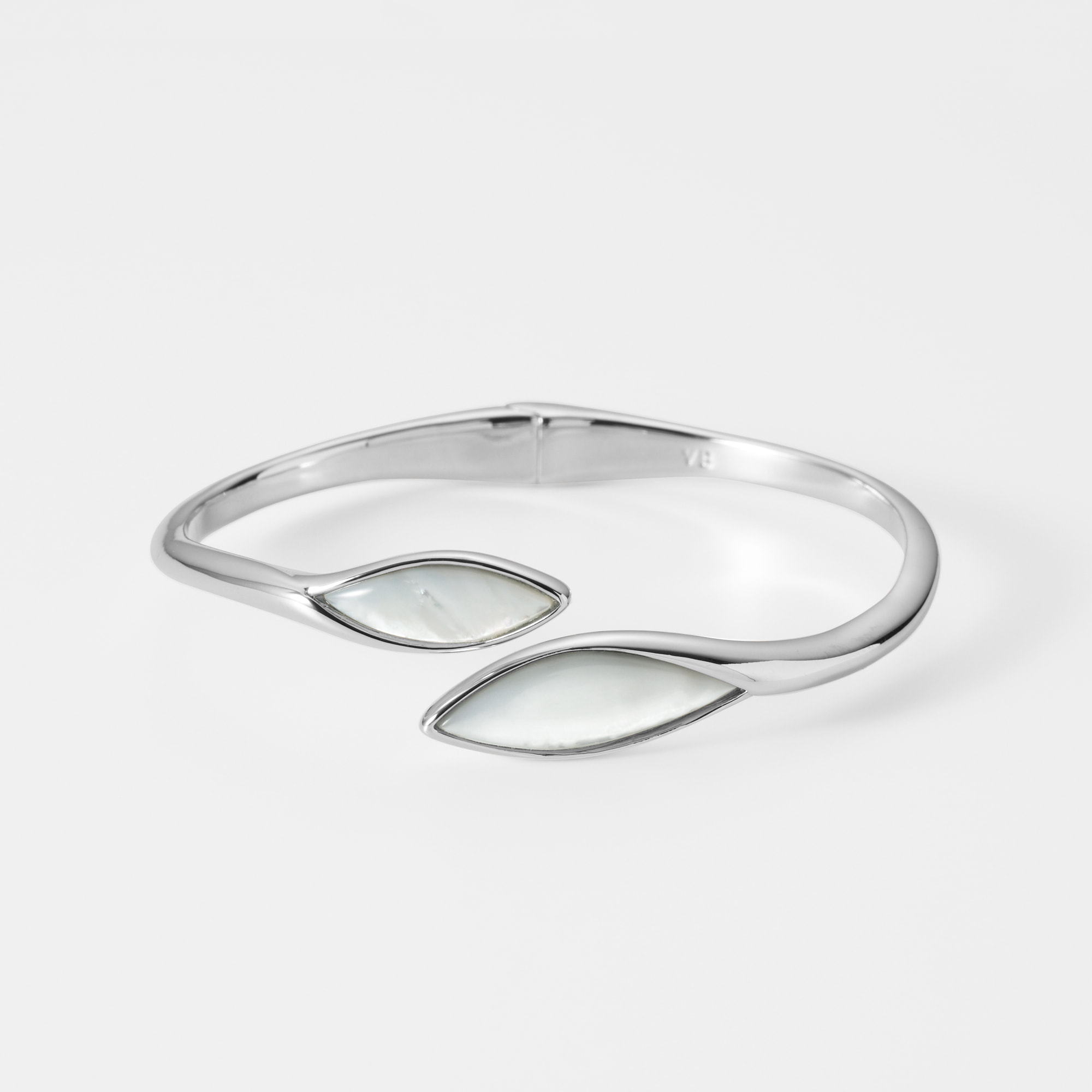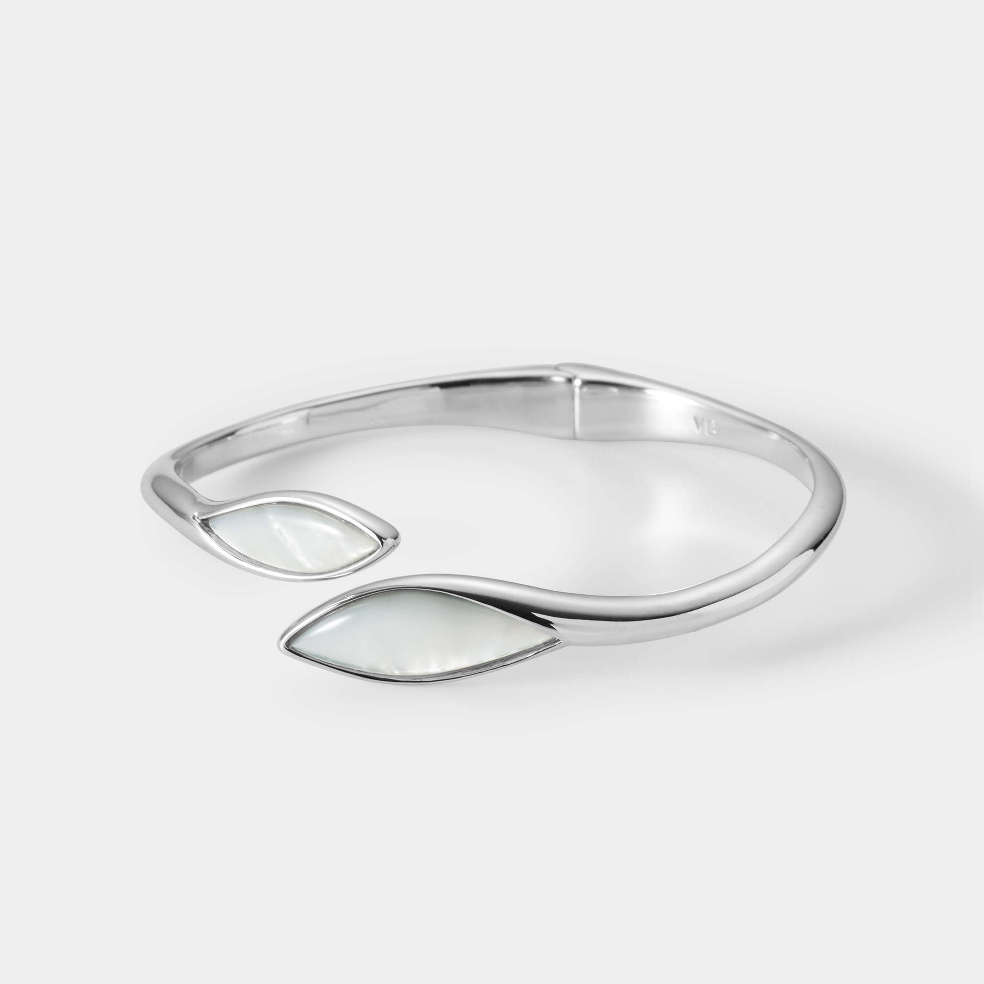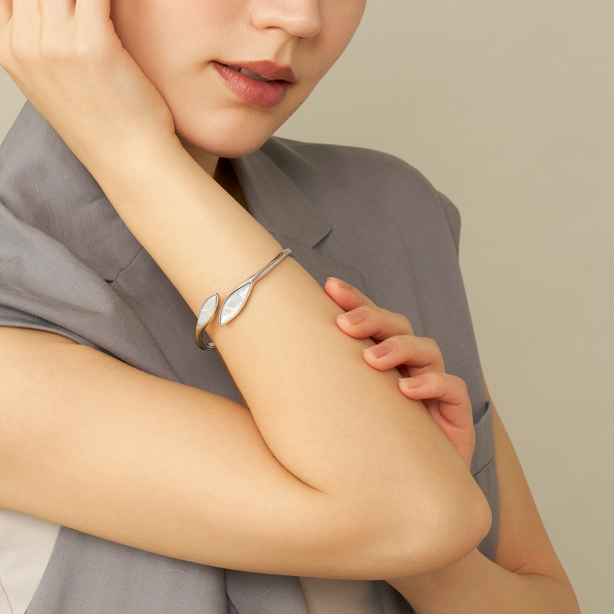 メタルのクールな輝きと白蝶貝のやわらかな虹彩が響き合い、オーガニックな造形美の中にモダンな美しさが光るデザインです。