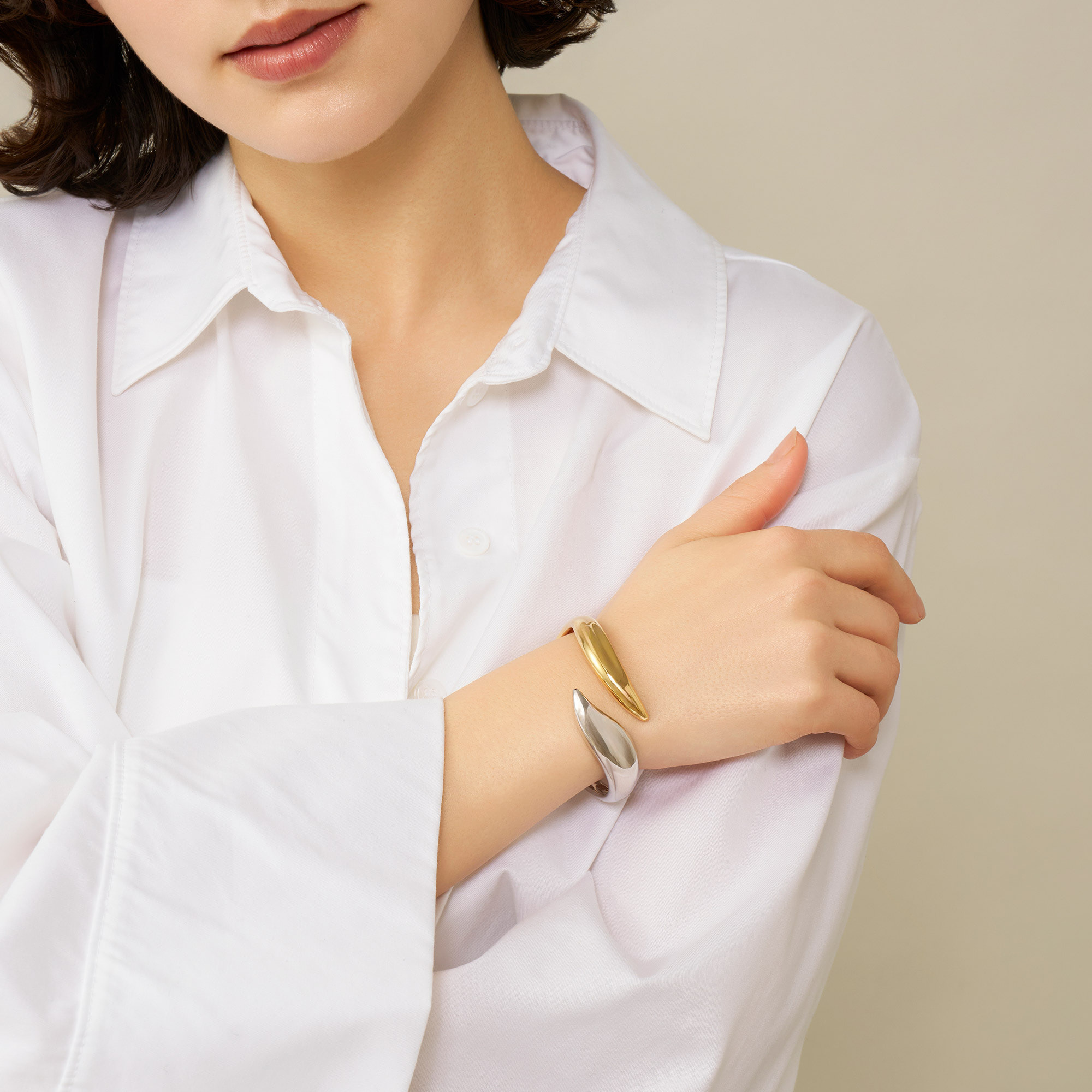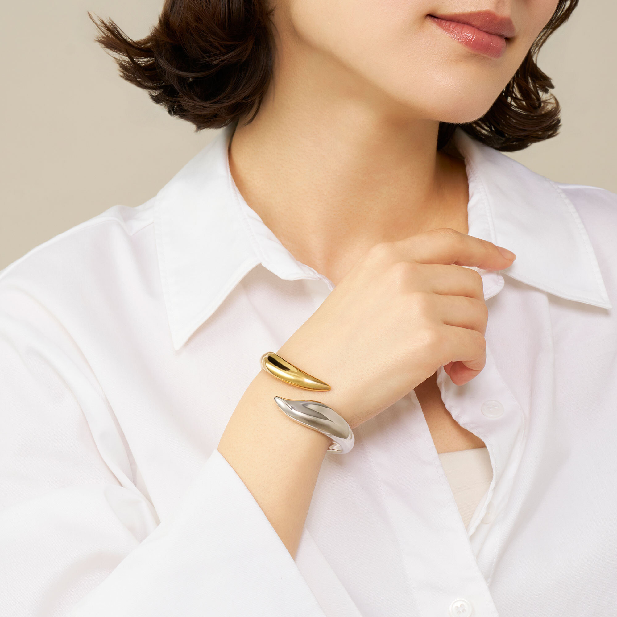 ゴールドカラーとシルバーカラーのコンビカラー仕上げでコーディネートの幅が広がります。