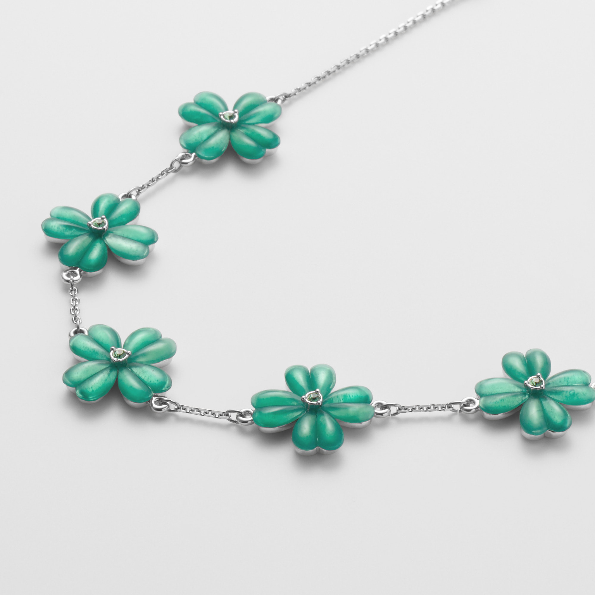 グリーンカルセドニーの鮮やかで透明感のあるグリーンと、愛らしいクローバーのフォルムがマッチした、ノーブルな魅力溢れるデザイン。