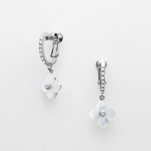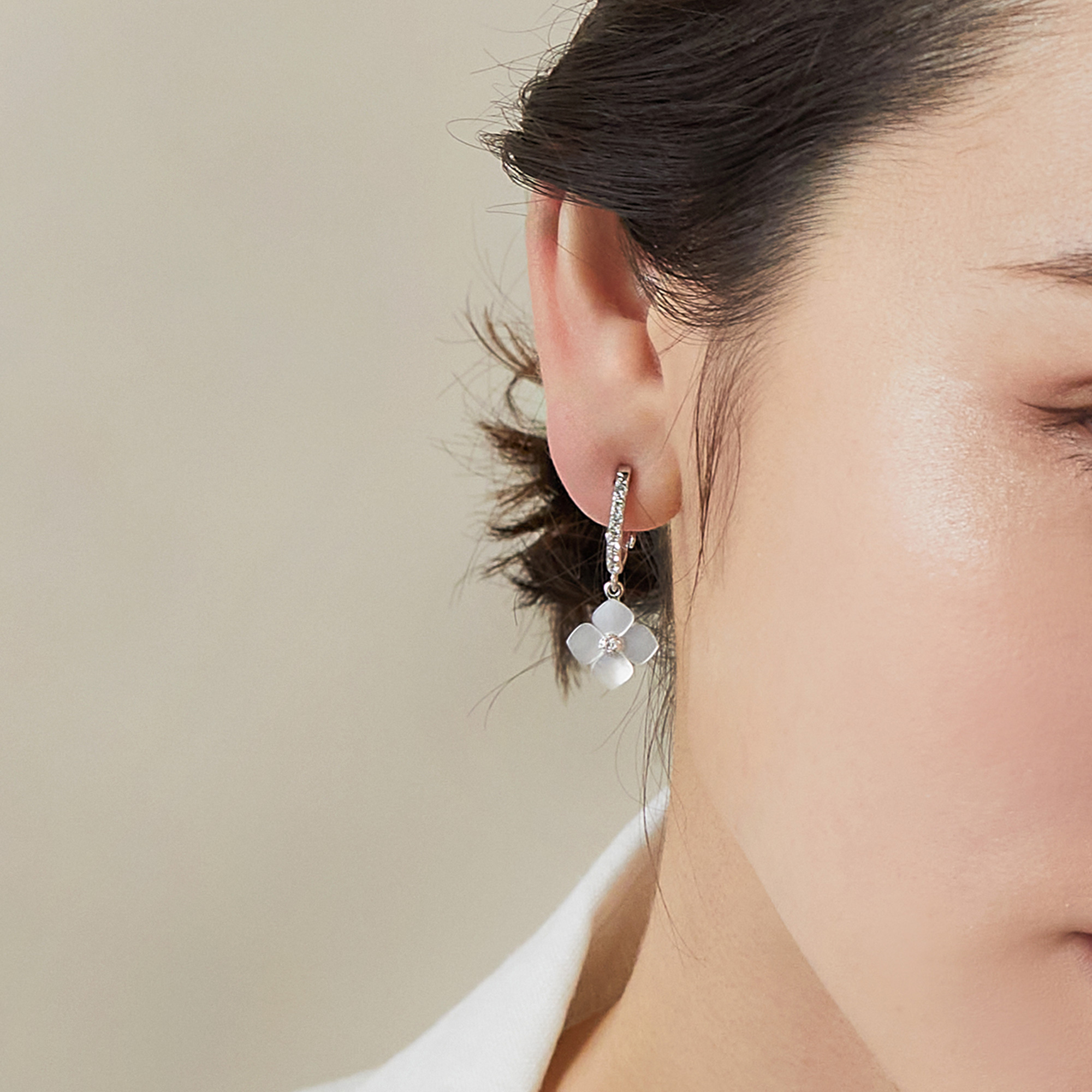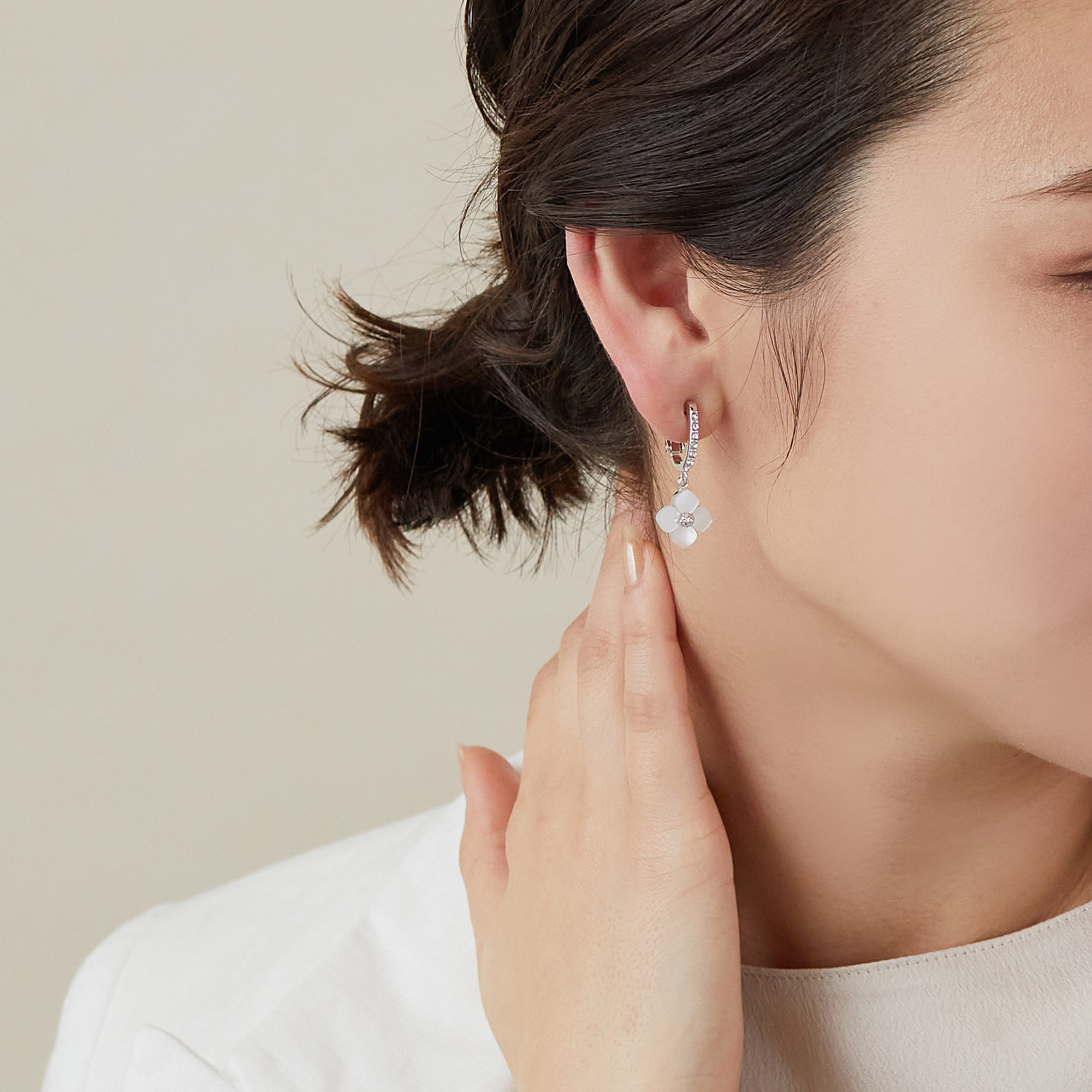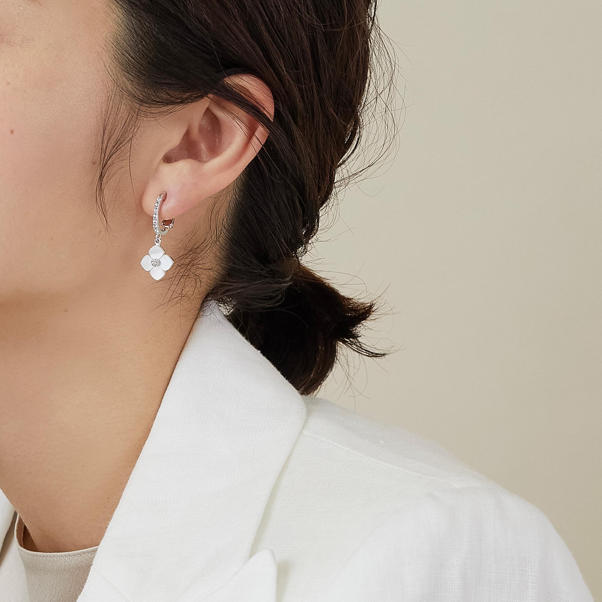 人気のシェルコレクションのイヤリング。質の良い白蝶貝を1つ1つ丁寧にかたどった可憐な花モチーフのイヤリング。白蝶貝ならではのニュアンスあるホワイトカラーと、揺れるデザインが程よいエレガンスをプラス。様々なスタイリングに合わせられ、上質な素材感で大人フェミニンな印象に演出します。