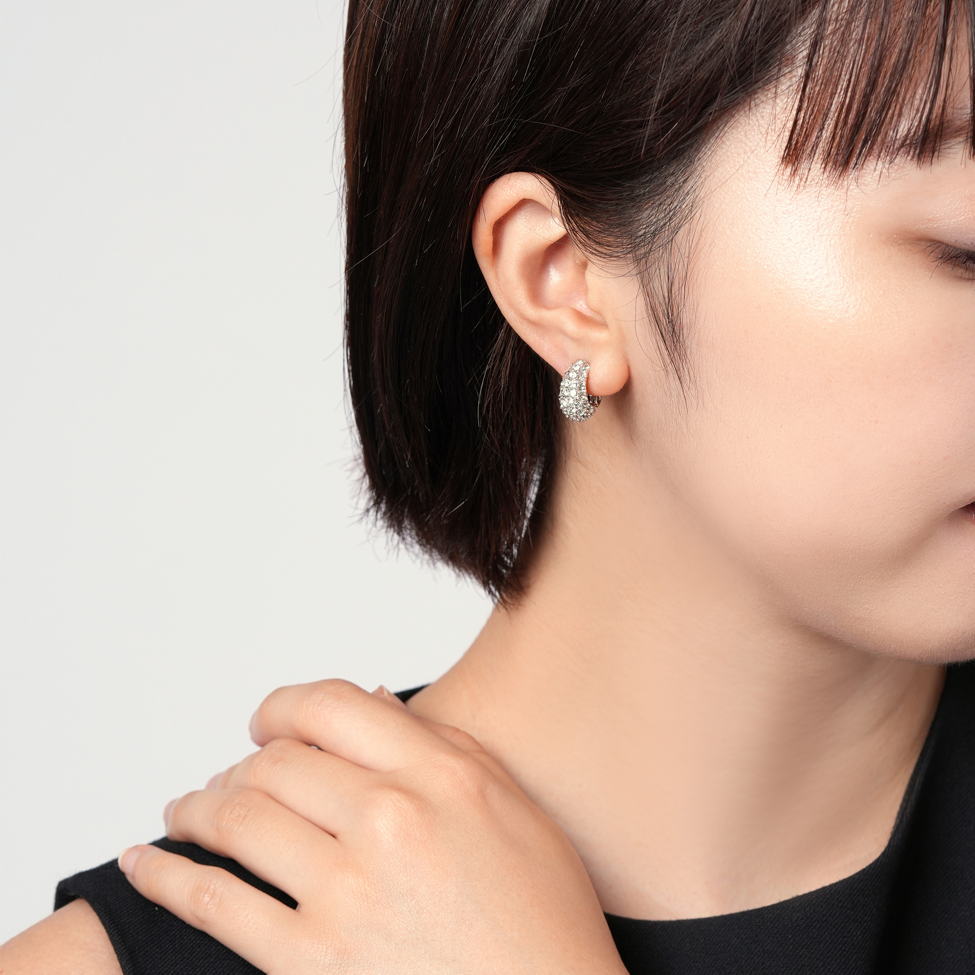 程よいサイズ感とパヴェの輝きが美しいイヤリング。隙間なくセッティングされたパヴェの輝きは高級感あふれ、耳元を華やかに演出します。シンプルながらも存在感あるイヤリングは幅広いシーンで活躍します。