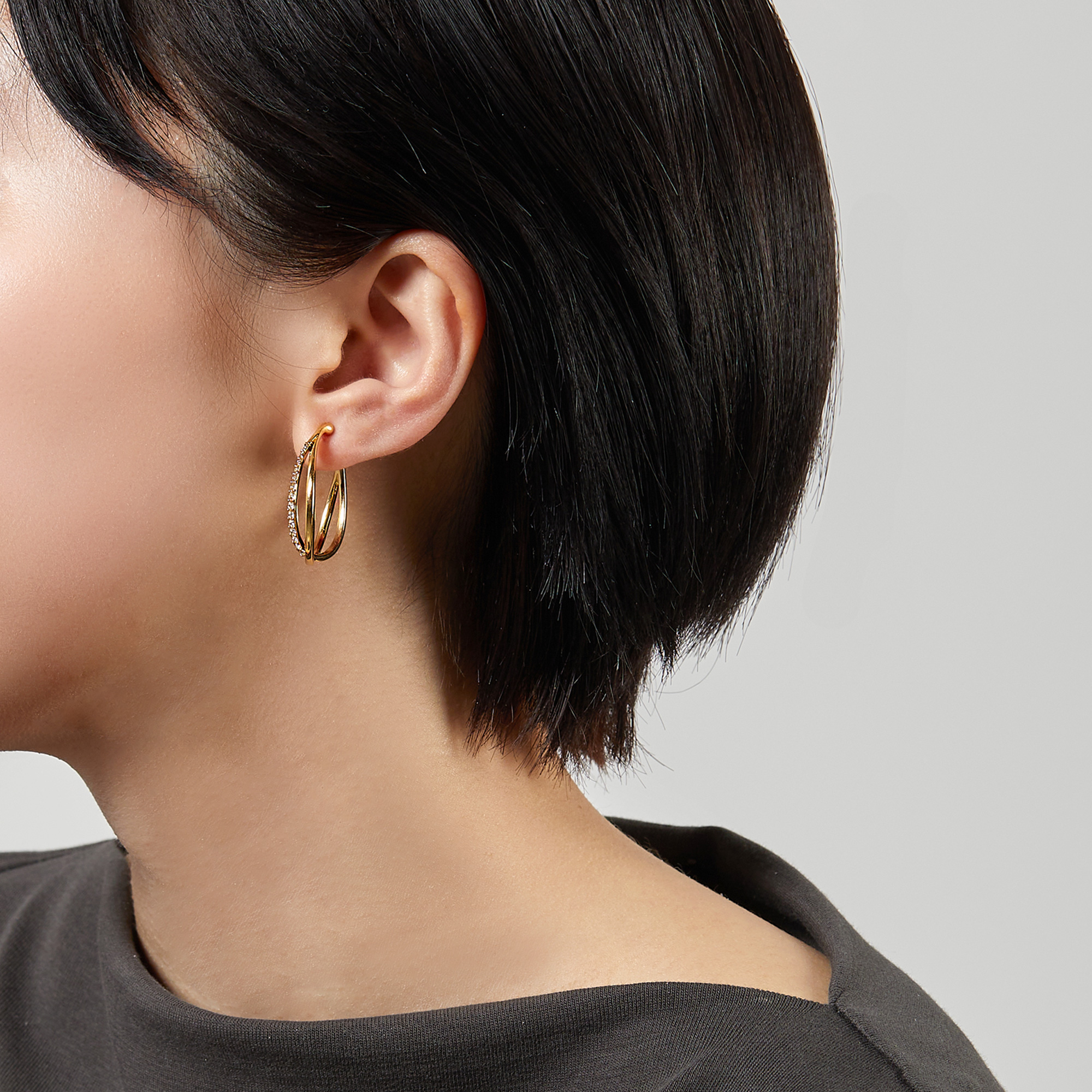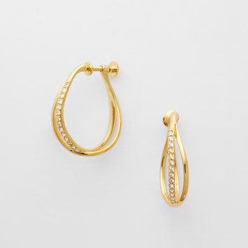 つくりのよさと着けやすいサイズ感が人気のベーシックシリーズ。つややかな質感のメタルとカットガラスの輝きが上品なフープイヤリング。繊細なフープが重なり合ったエレガントな印象で、耳元に上質感を与えてくれるアイテムです。カットガラスのきらめきがシンプルな中に華やかさをプラスします。