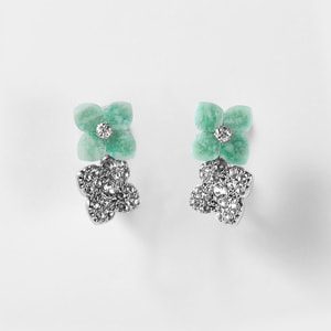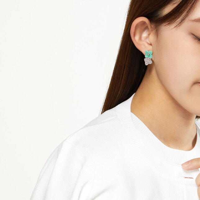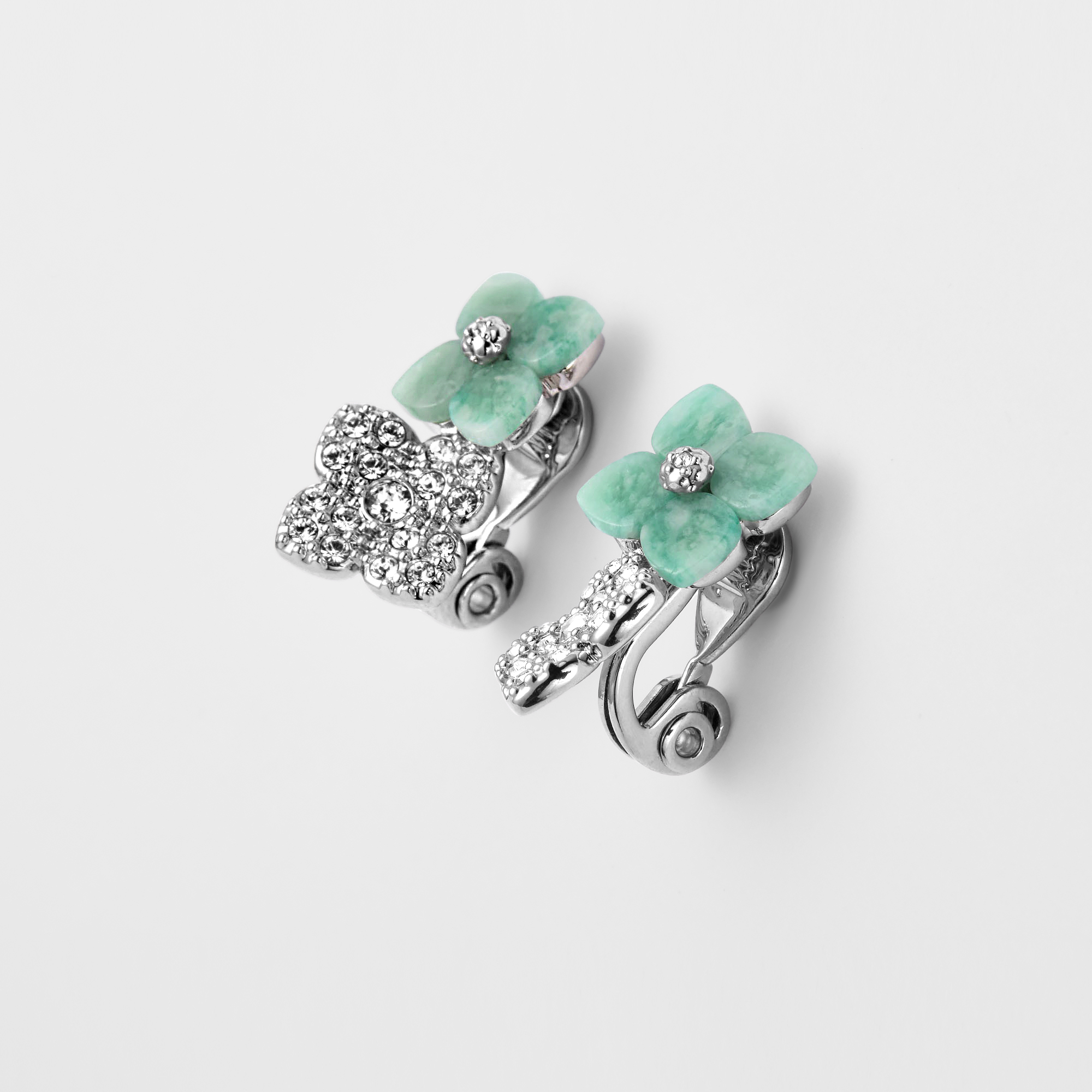 稀少なアマゾナイトを1つ1つ丁寧にかたどった可憐な花に、繊細なカットガラスをあしらって耳元を華やかな印象に。