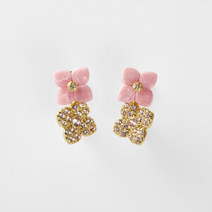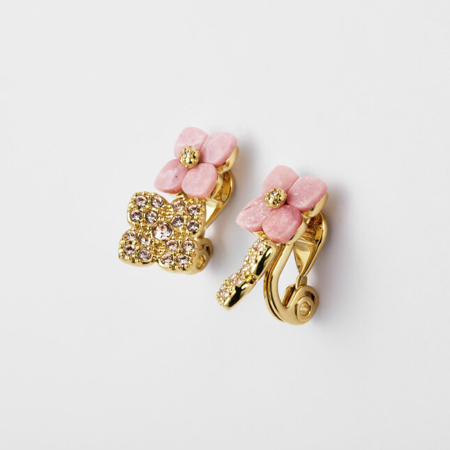 稀少なピンクオパールを1つ1つ丁寧にかたどった可憐な花に、繊細なカットガラスをあしらって耳元を華やかな印象に。
