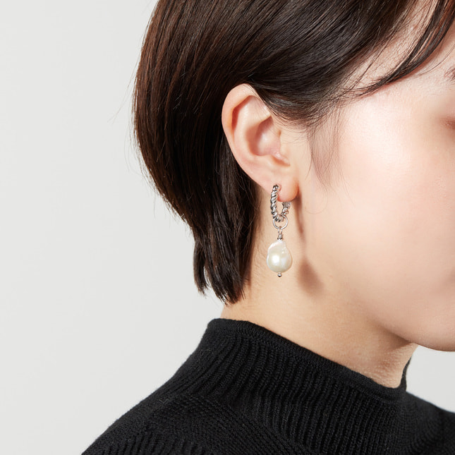 美しい光沢と個性的なフォルムが魅力の、淡水有核バロックパールチャームをあしらったイヤリングです。