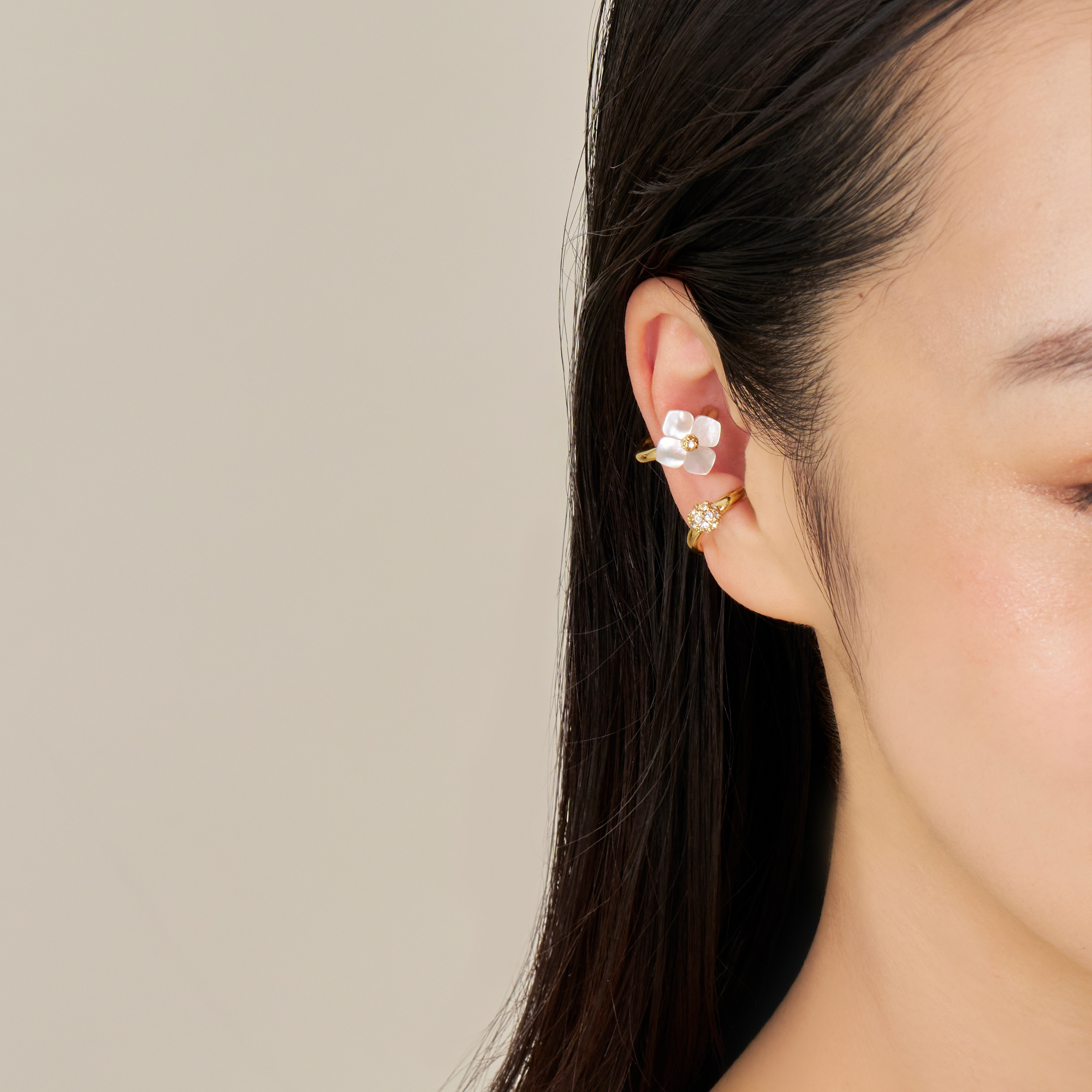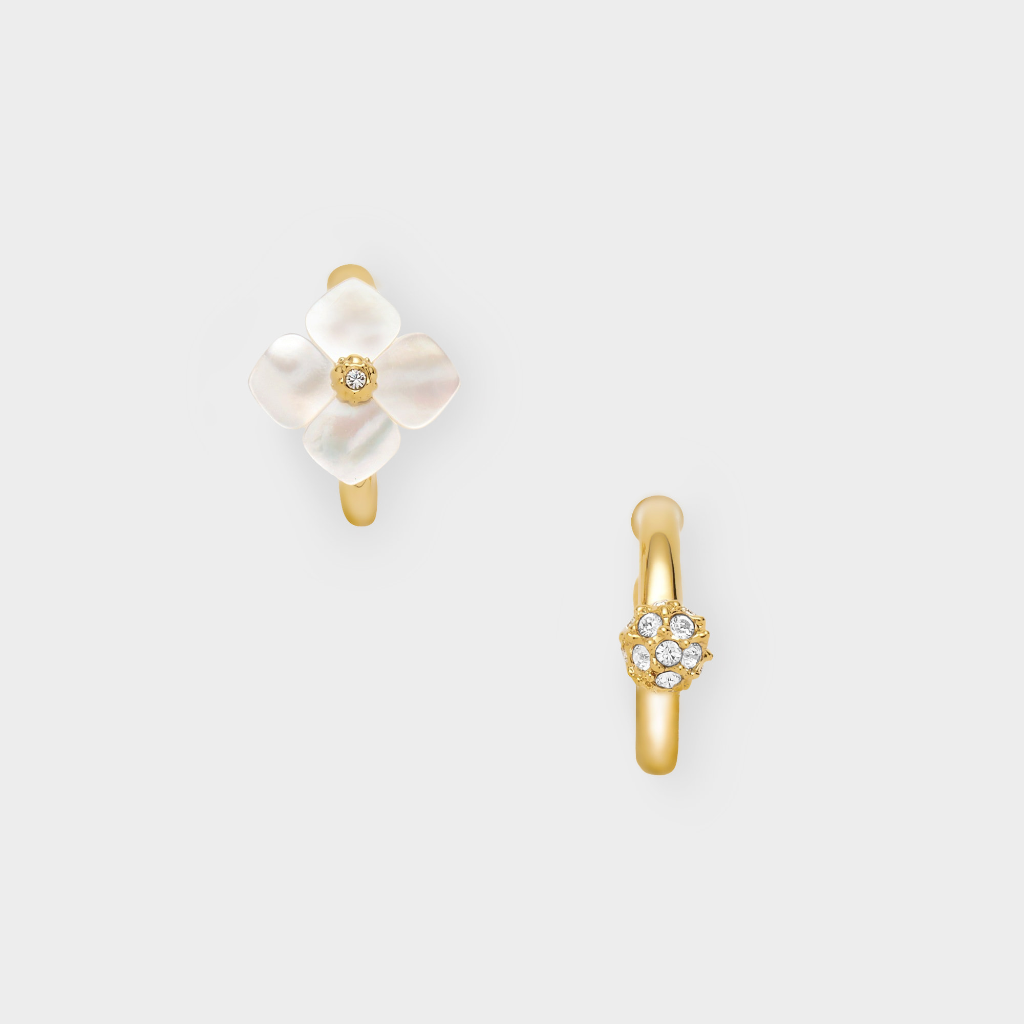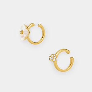 質のよい白蝶貝を1つ1つ丁寧にかたどった花モチーフのイヤーカフと、カットガラスを散りばめたボールモチーフイヤーカフの2個セットです。