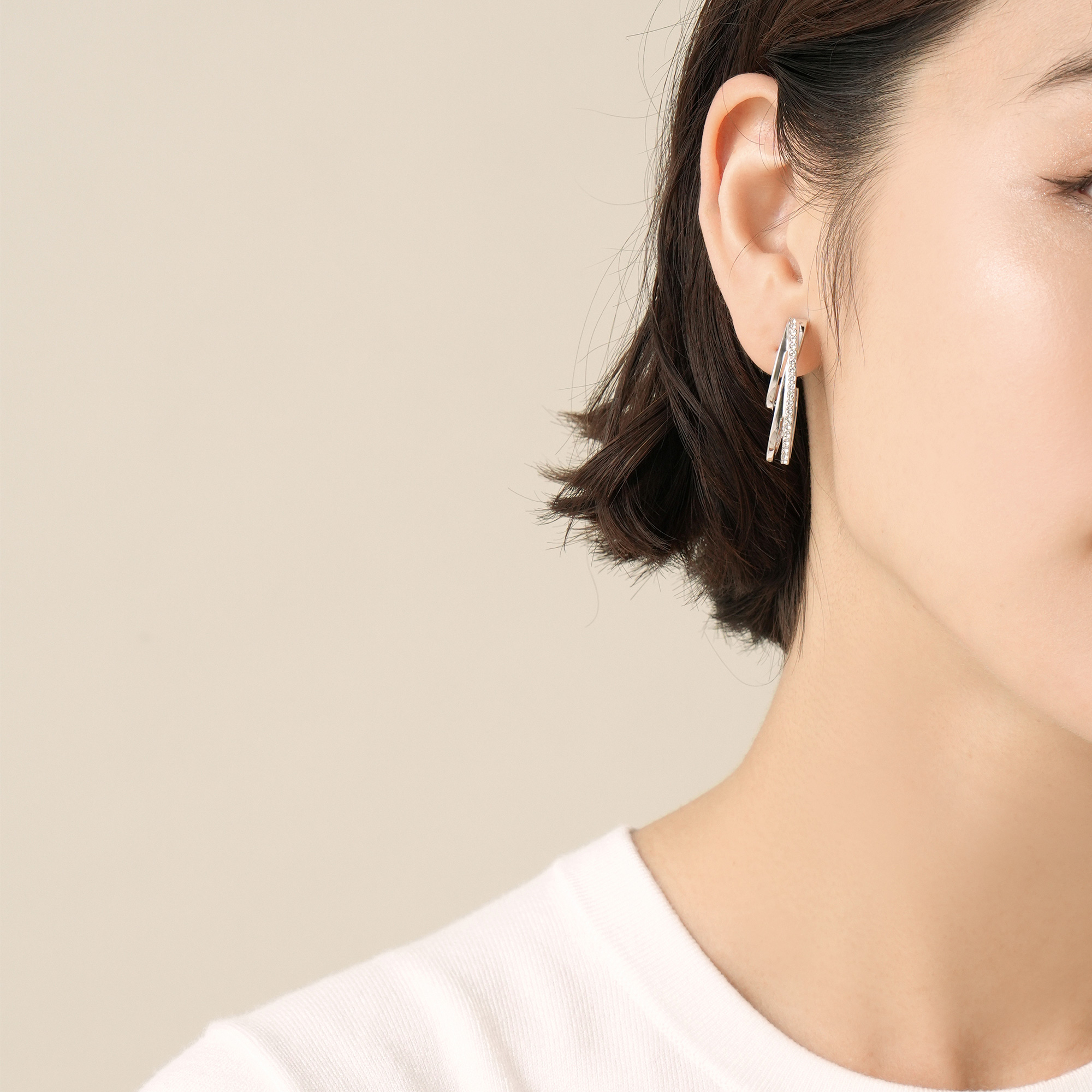 幾重にも重なった繊細なメタルで形作ったイヤリング。大ぶりで立体的なフォルムによる存在感がありながら、メタルの透け感が軽やかな印象を与えるデザインです。カットガラスの華やかな煌めきがアクセントに。様々なシーンで活躍するアイテムです。