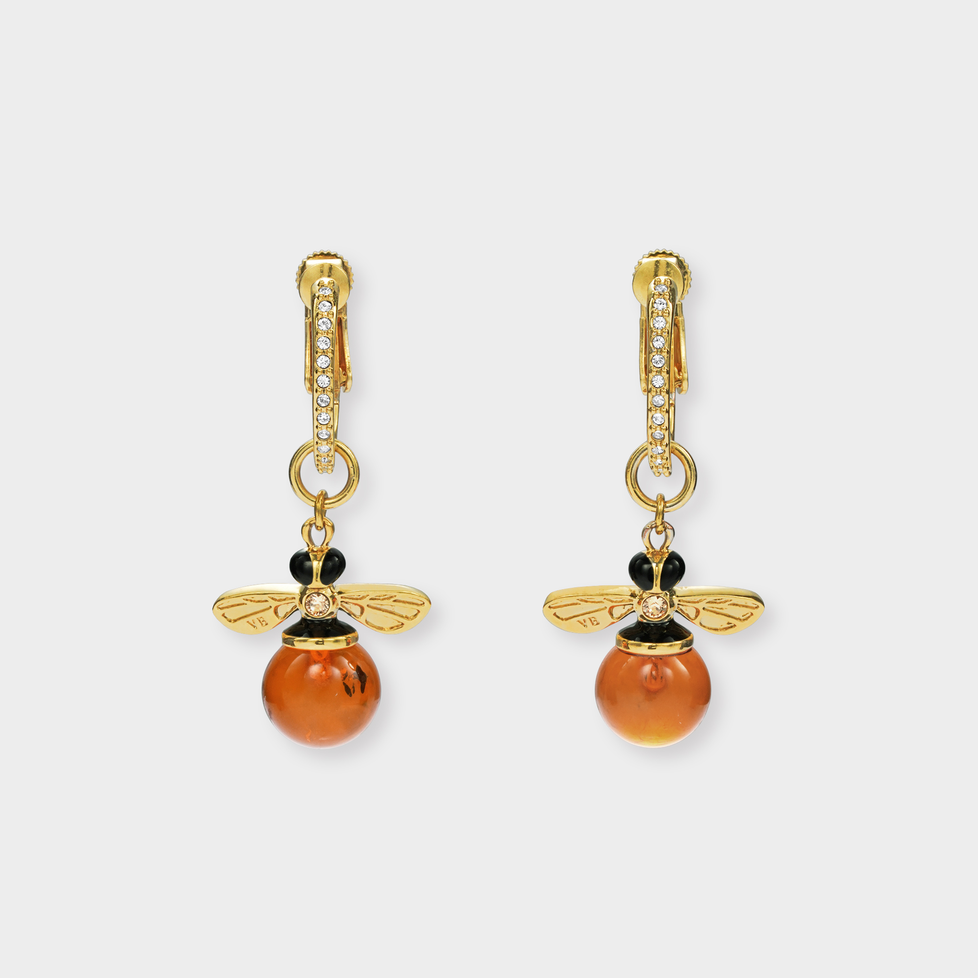 美しい蜂蜜色の琥珀をセッティングしたミツバチチャームが揺れるフープイヤリング。
