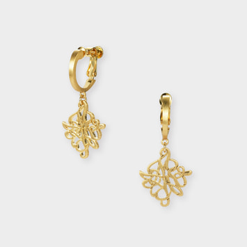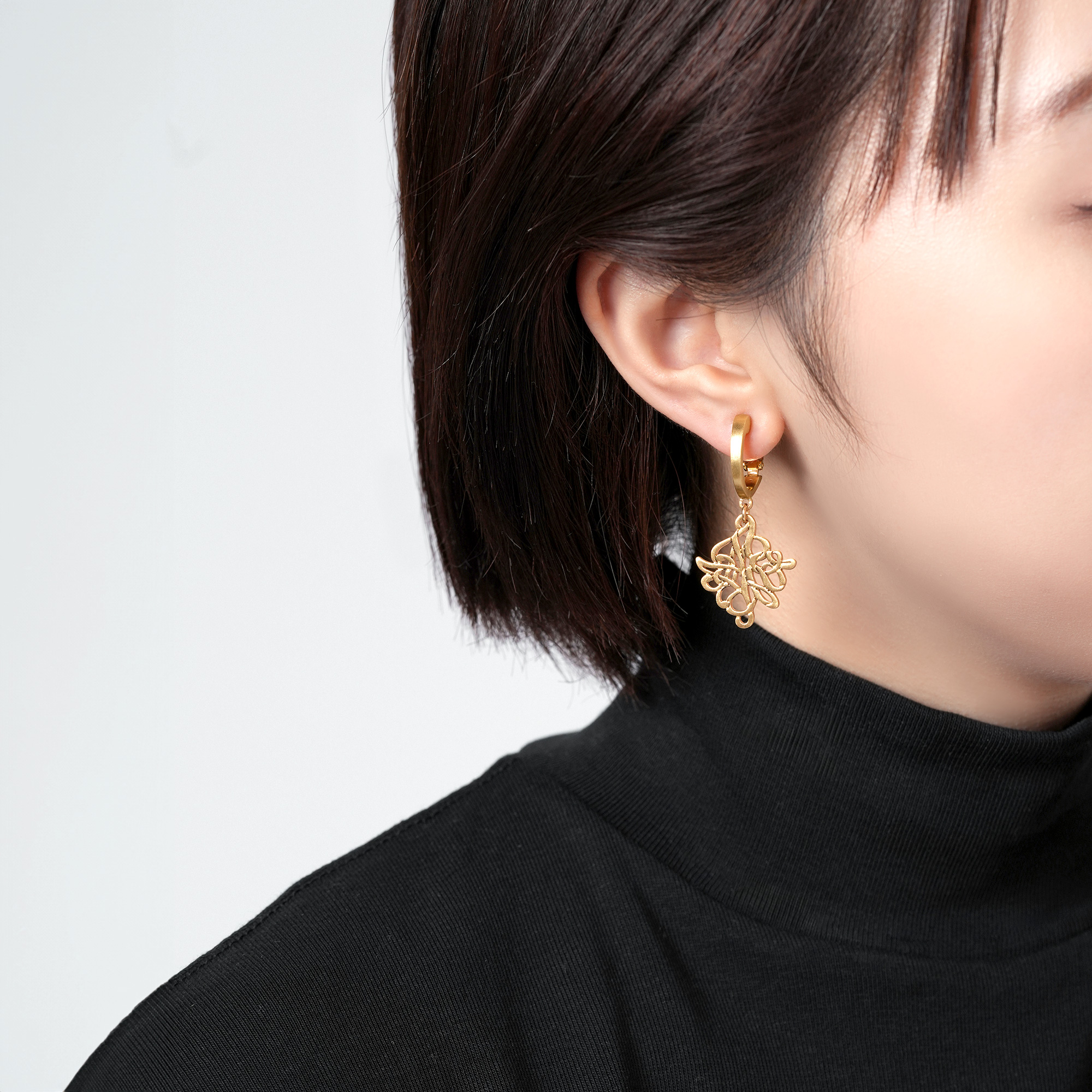 クラシカルなタイポグラフィーモチーフをシャープなラインのフープに組み合わせたイヤリング。優雅な菱形フォルムの中にフランス語で「愛」を意味するAMOUR(アムール)の文字がかくれんぼしているようにデザインしました。大人っぽいマットゴールド仕上げで、耳元をスタイリッシュに演出します。