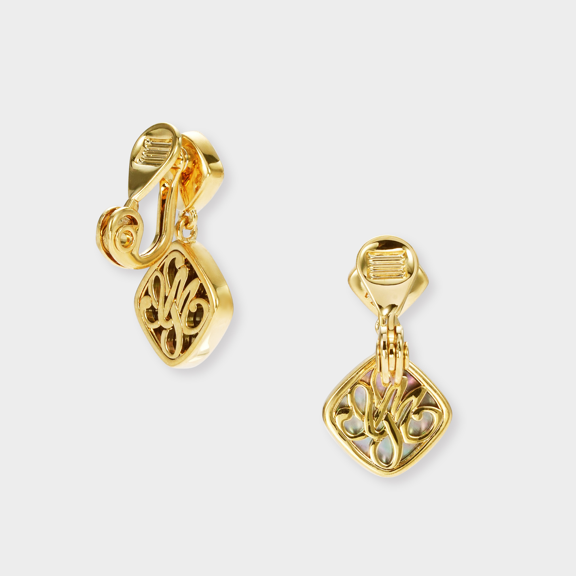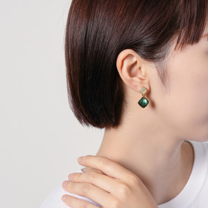 クッションカットのダブレットストーンの神秘的で奥行きのある輝きが印象的なイヤリング。