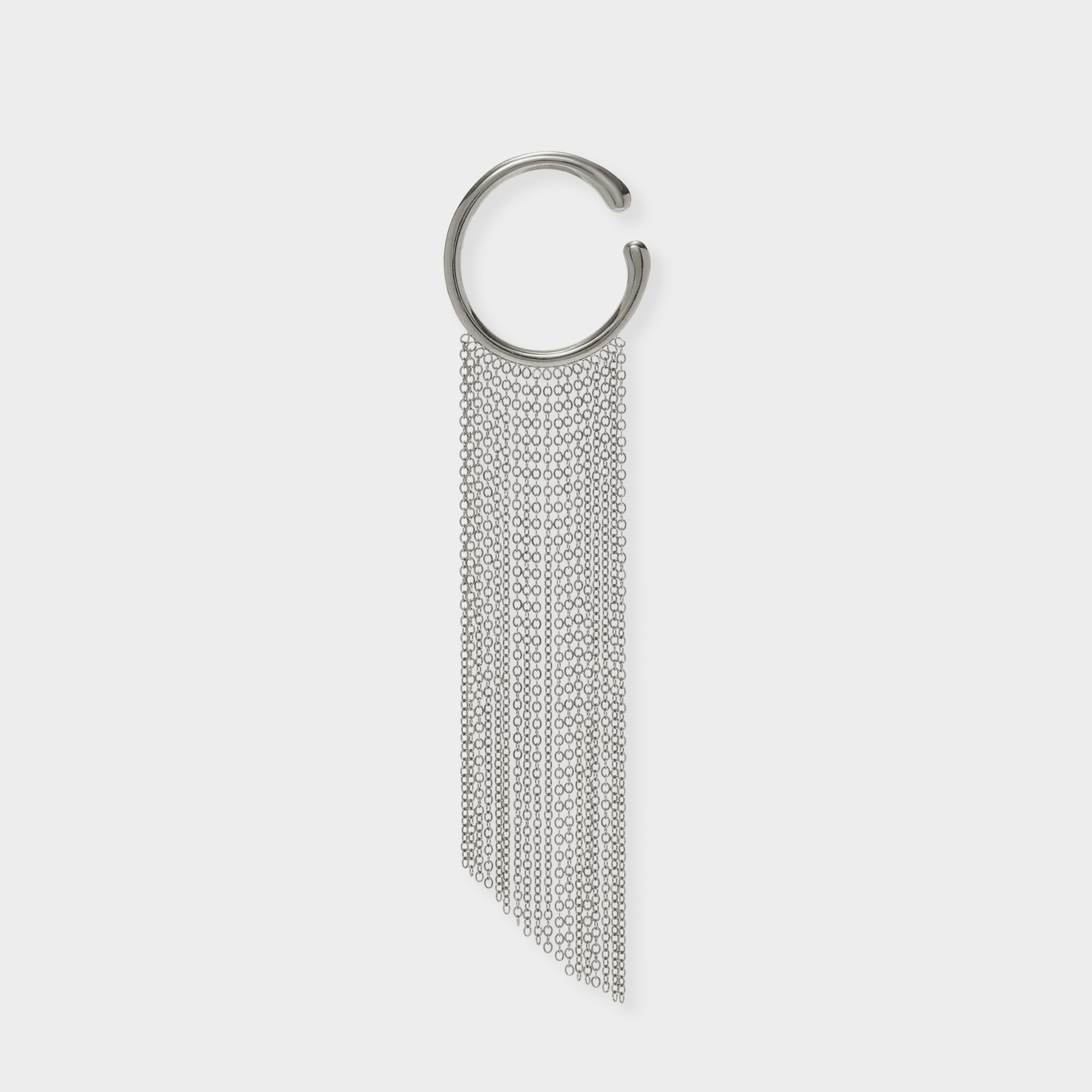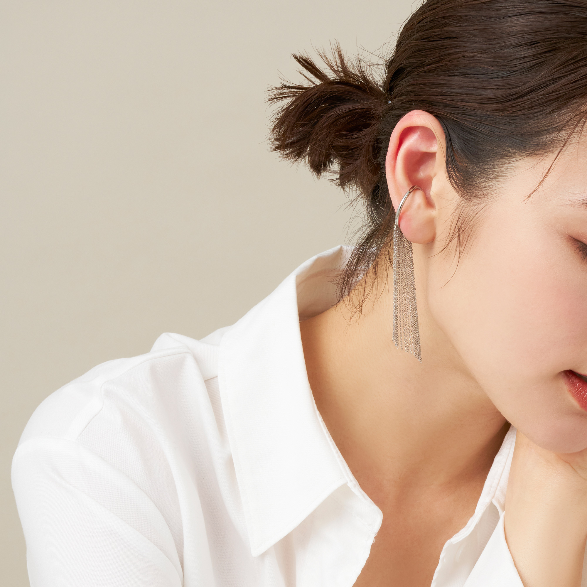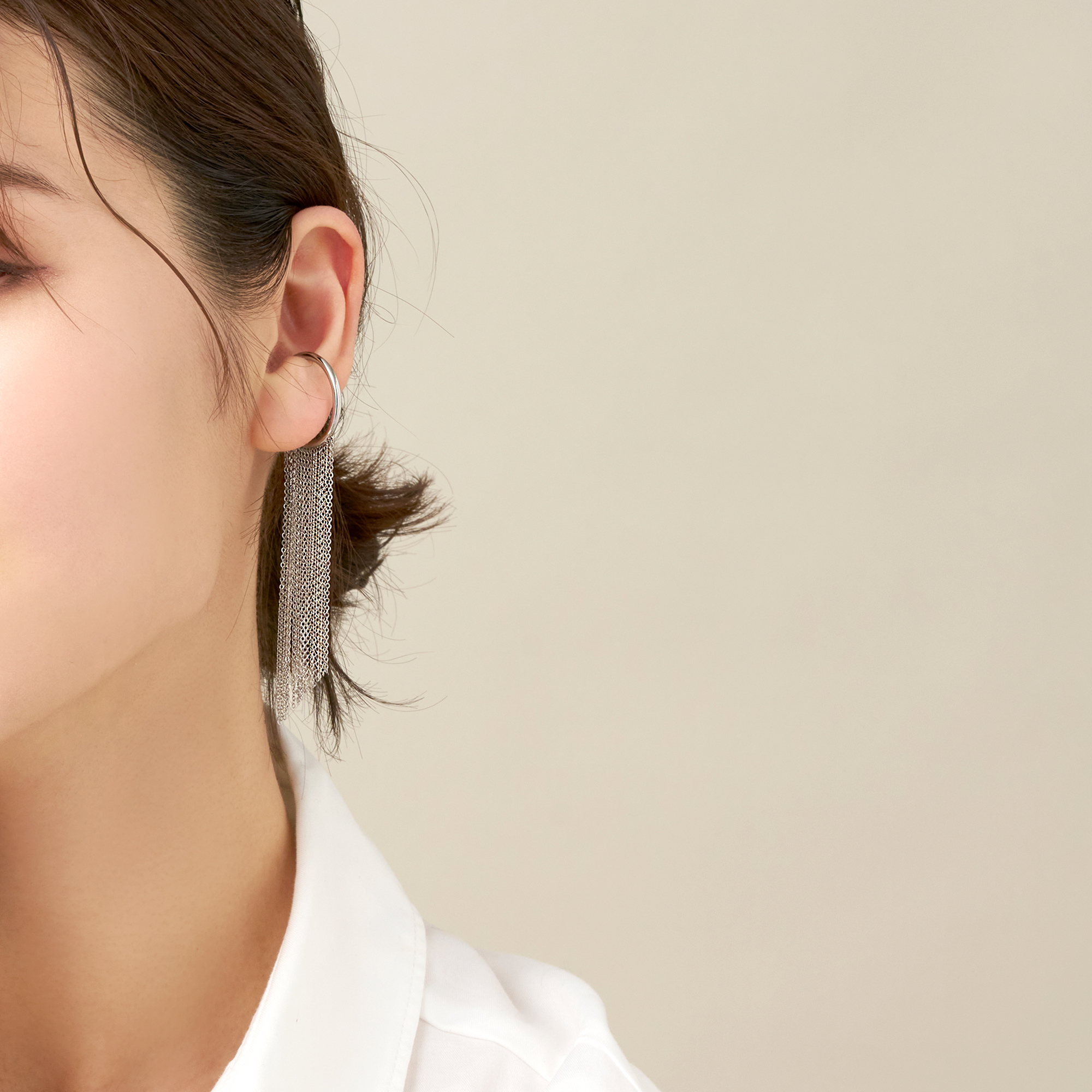 細いロングチェーンが美しいフリンジイヤーカフ。フリンジが揺れるたびに溢れる繊細な輝きが、お顔周りを明るく演出します。斜めにカットされたチェーンがクールな印象をプラス。ステンレスならではの深みのあるシルバーカラーも魅力です。素材は医療器具にも使われるサージカルステンレスを使用しています。