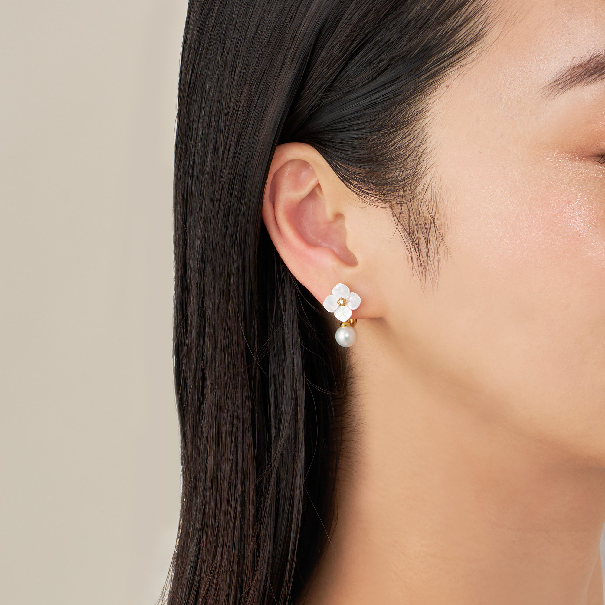 1つ1つ丁寧にかたどった白蝶貝の可憐な輝きに、淡水パールの優しい光沢がマッチ。