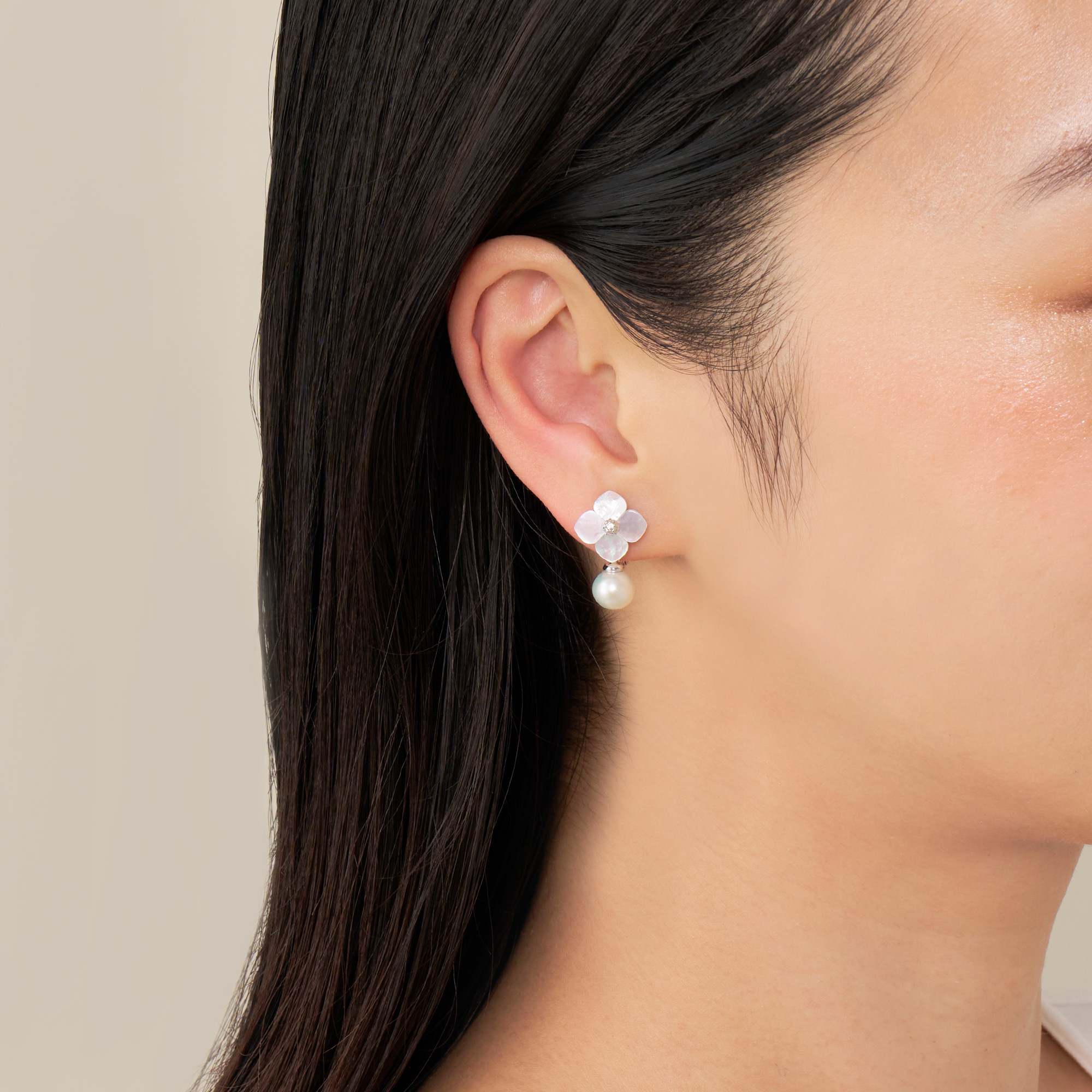 1つ1つ丁寧にかたどった白蝶貝の可憐な輝きに、淡水パールの優しい光沢がマッチ。
