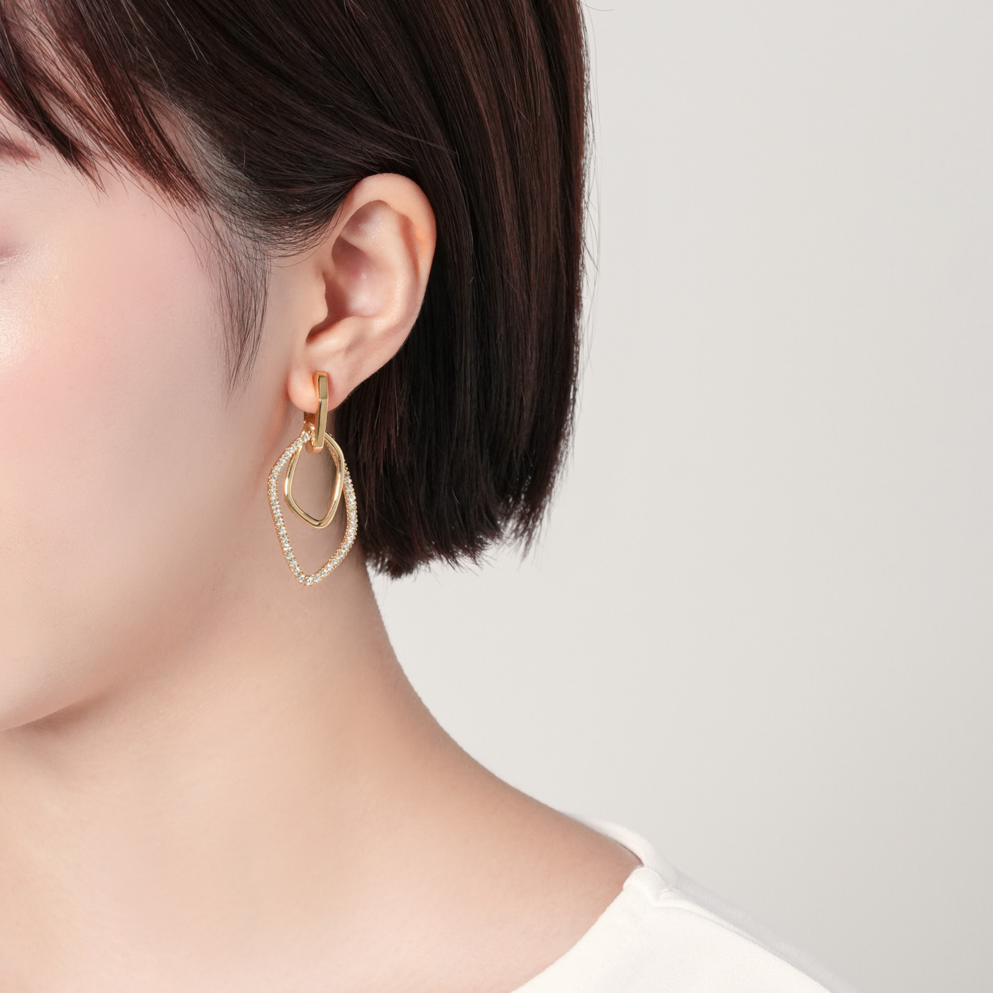 トップパーツをロングにしてスタイリッシュな印象にしたり、パーツを外してシンプルなフープイヤリングとしてお使いいただけます。