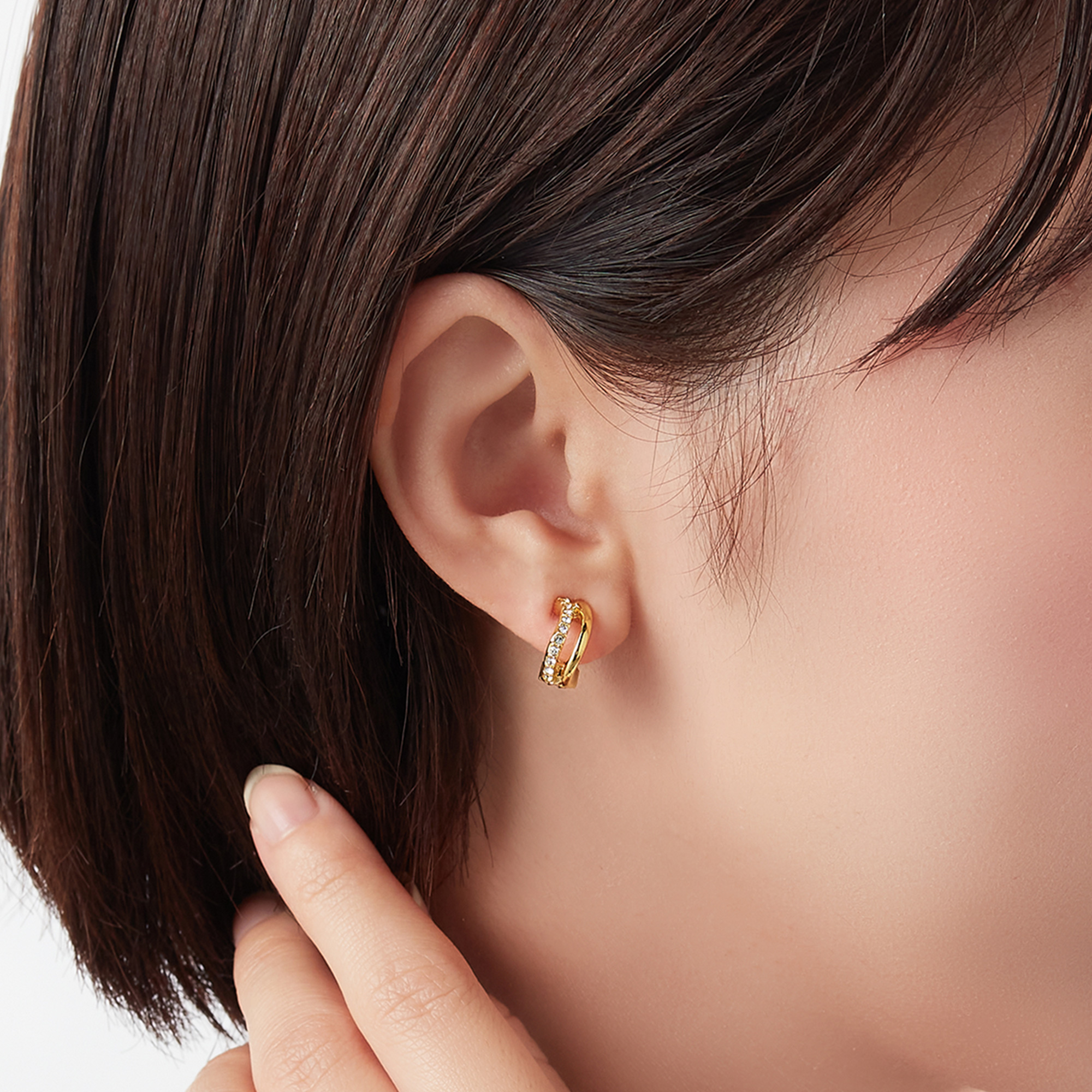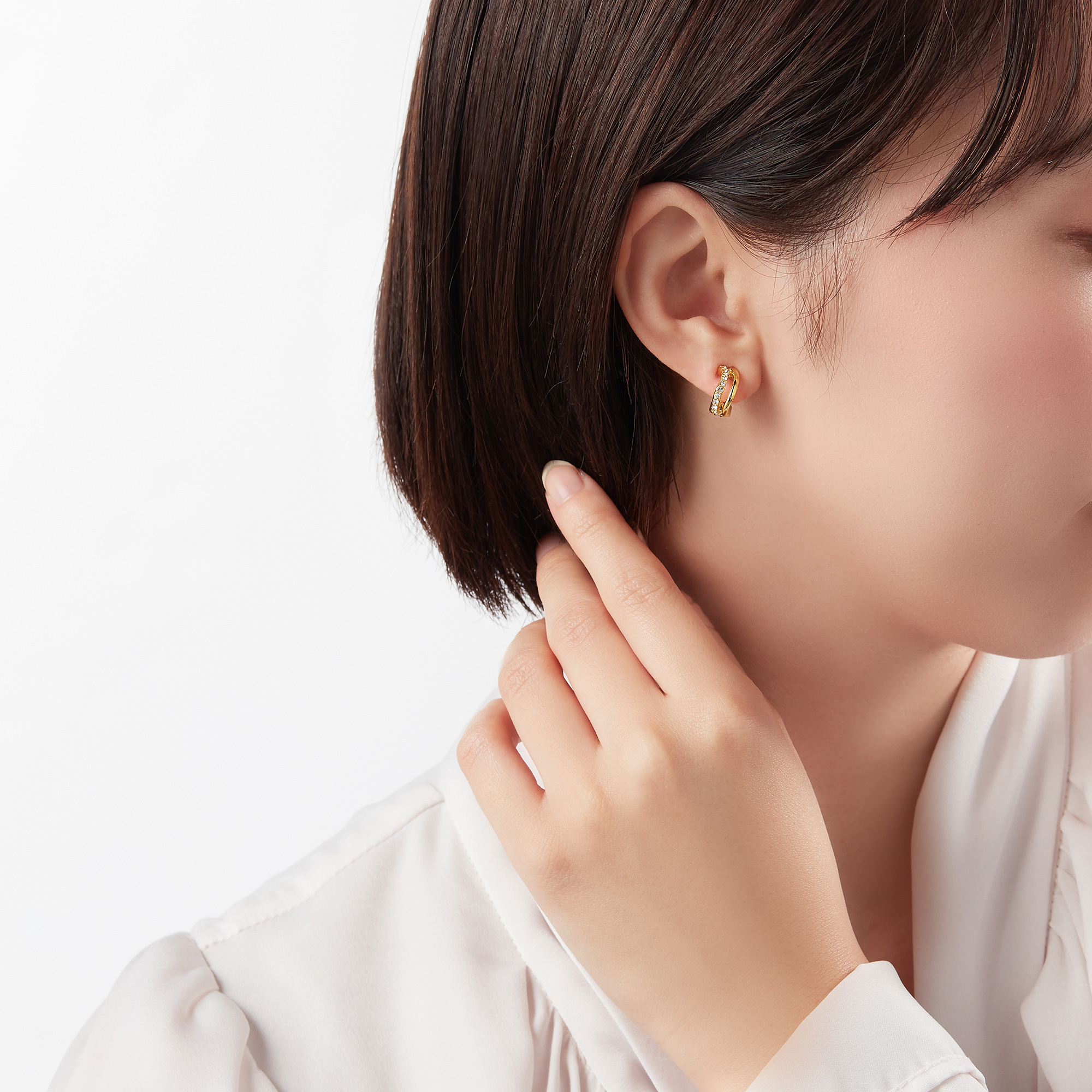 ニュアンスのあるカーブが印象的なイヤリング。正面から金具が見えないデザインで、軽やかで繊細な印象です。カットガラスの輝きと艶やかなメタルのコントラストが魅力。小さめのサイズ感で、どんなコーディネートにも合う、デイリーユースのアイテムです。