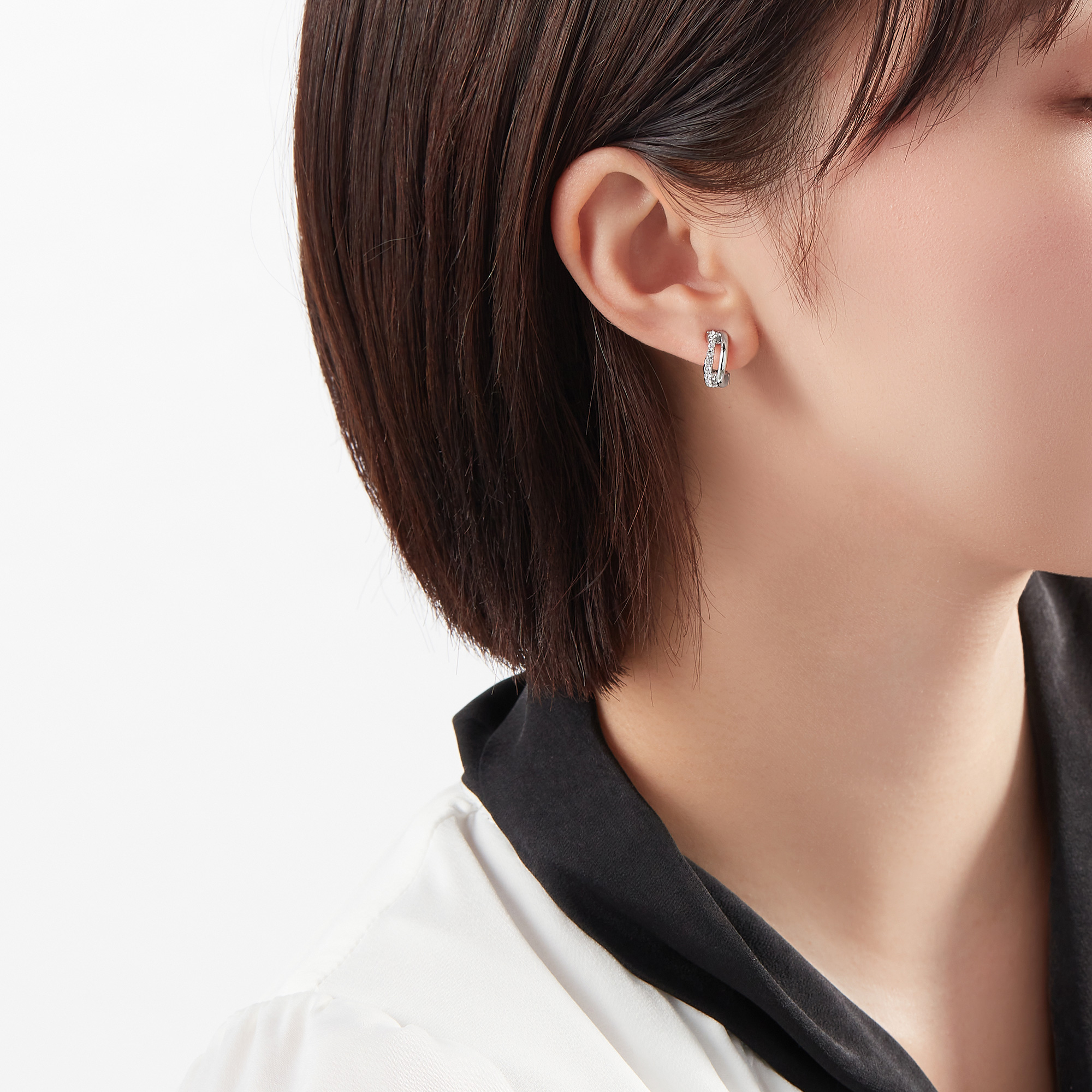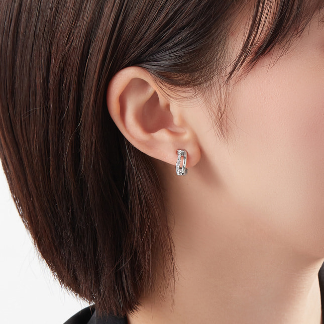 ニュアンスのあるカーブが印象的なイヤリング。正面から金具が見えないデザインで、軽やかで繊細な印象です。カットガラスの輝きと艶やかなメタルのコントラストが魅力。小さめのサイズ感で、どんなコーディネートにも合う、デイリーユースのアイテムです。